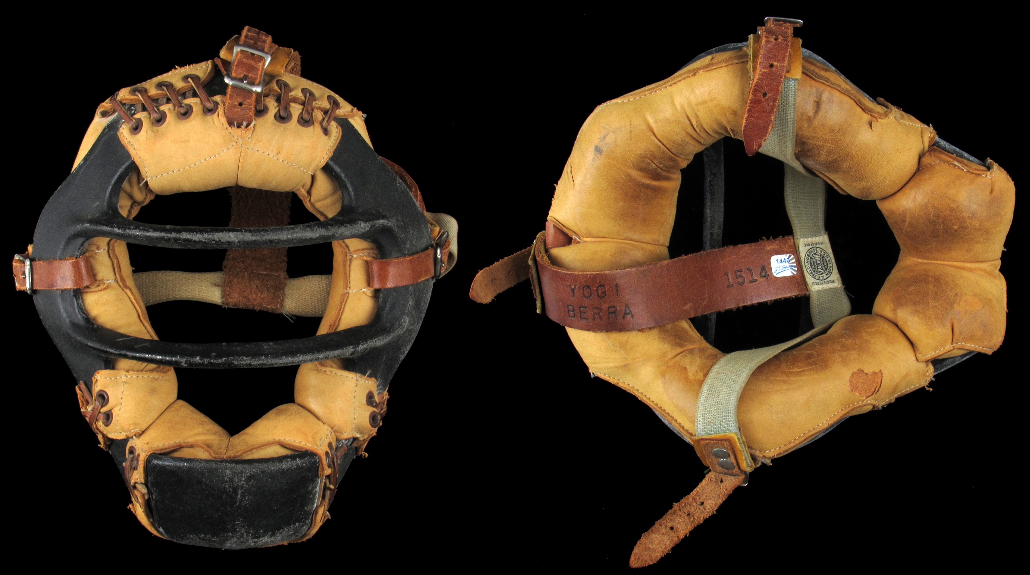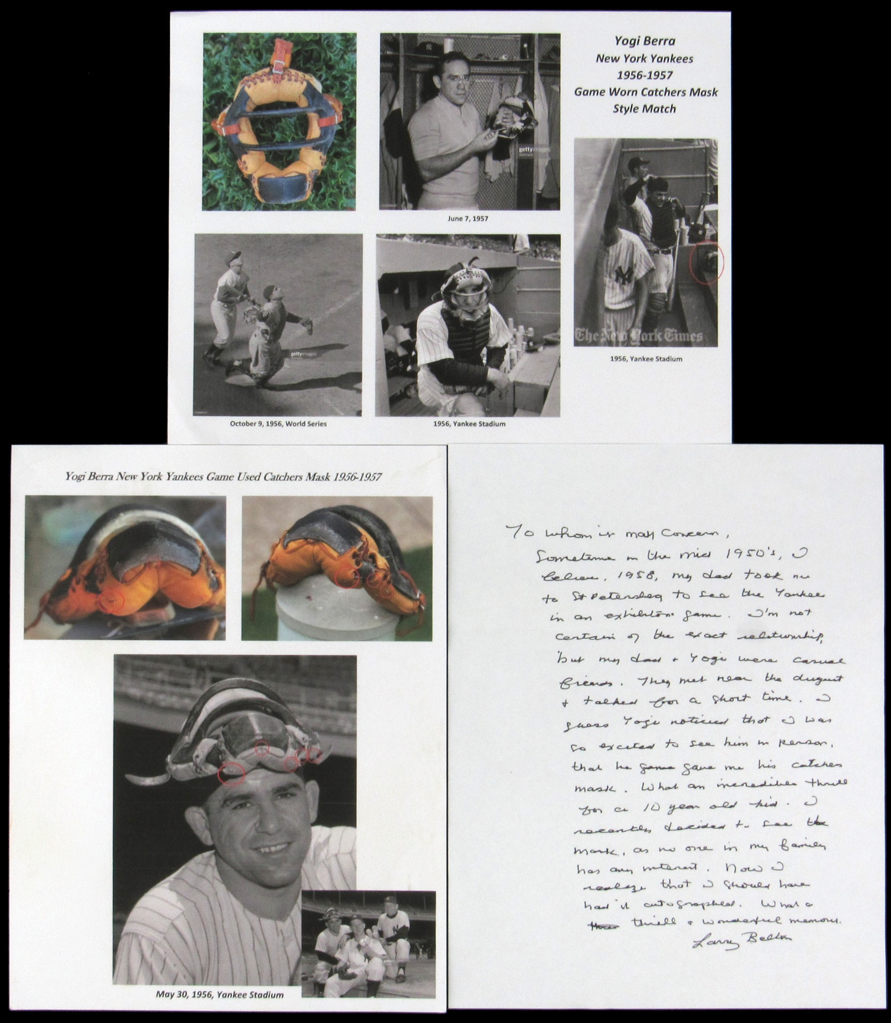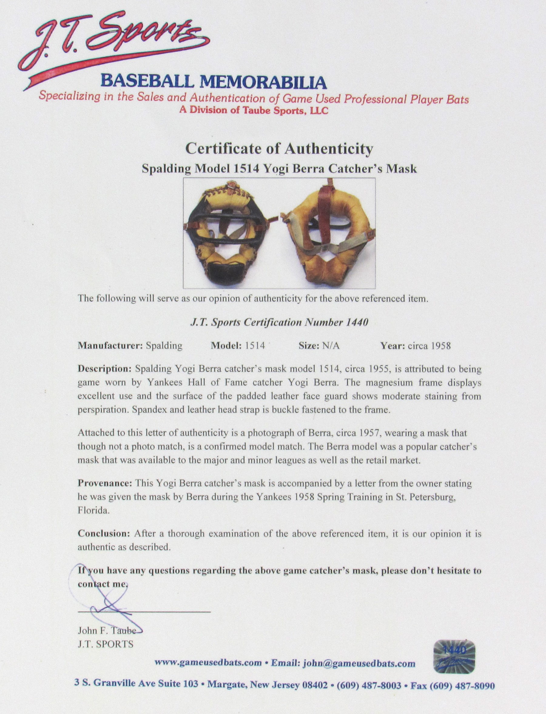 Throughout the history of Major League Baseball, few catchers have matched "Yogi" Berra in reliability and productivity. To say Berra's MLB resume is outstanding would be an understatement. Berra's 3 MVP awards, 18 All-Star Game selections, and 13 World Series championships attest to his greatness as both a player, and coach. Catch hold of a great piece of memorabilia, with this Berra game worn Spalding catcher's mask. An accompanying letter of provenance from the original longtime owner states this mask was given a to him by Berra, at a 1958 New York Yankees exhibition game in St. Petersburgh, when the proud recipient was 10 years old. As the elated youth aged, he kept this treasure safely in his possession for longer than most of us have been alive. Also accompanying is a certificate of authenticity which cites this Spalding model 1514 mask as having been made in 1955. The COA also notes an attached circa 1957 photo of Berra "wearing a mask that though not a photo match, is a confirmed model match". Berra's name is impressed into the surface of the leather head strap in block letters, and the same strap is also impressed with the model number. Excellent signs of authentic use/wear include paint erosion on the metal cage, and sweat staining on the face padding, which also has a 1" section of surface leather loss. The metal buckles all remain sturdy and serviceable, as do the moderately worn fastening straps, and all laces remain taut. COA from John Taube/J.T. Sports. Opening Bid $5,000.