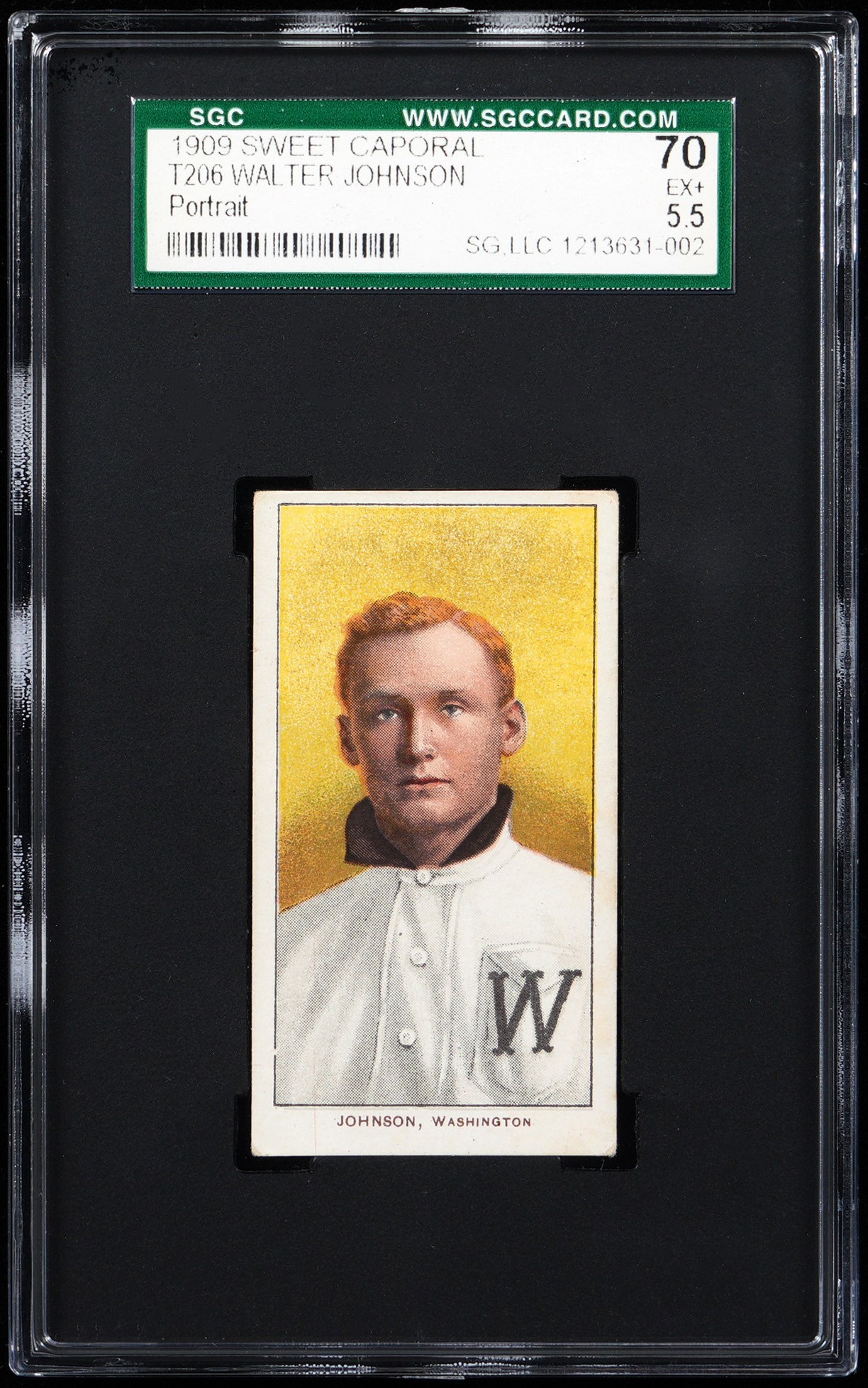 Class of 1936 Hall of Famer! Graded EX+ 5.5 by SGC. Stunning 1909-1911 T206 White Border Walter Johnson portrait. The capless ace of the Washington Senators has survived the past 125 years in inspiring condition by showcasing evenly touched corners, creamy edges and fine player/uniform accents. The Sweet Caporal 150 back is radiant and problem-free. Of the 186 of the player/pose/brand combination evaluated by SGC, this "Big Train" resides as 1 of 3 at the grading level with only 4 better! This century-old tobacco card comes from an SGC graded set "break" and was selected by our consignor with a discerning eye for centering and overall eye appeal. Opening Bid $1,500.
