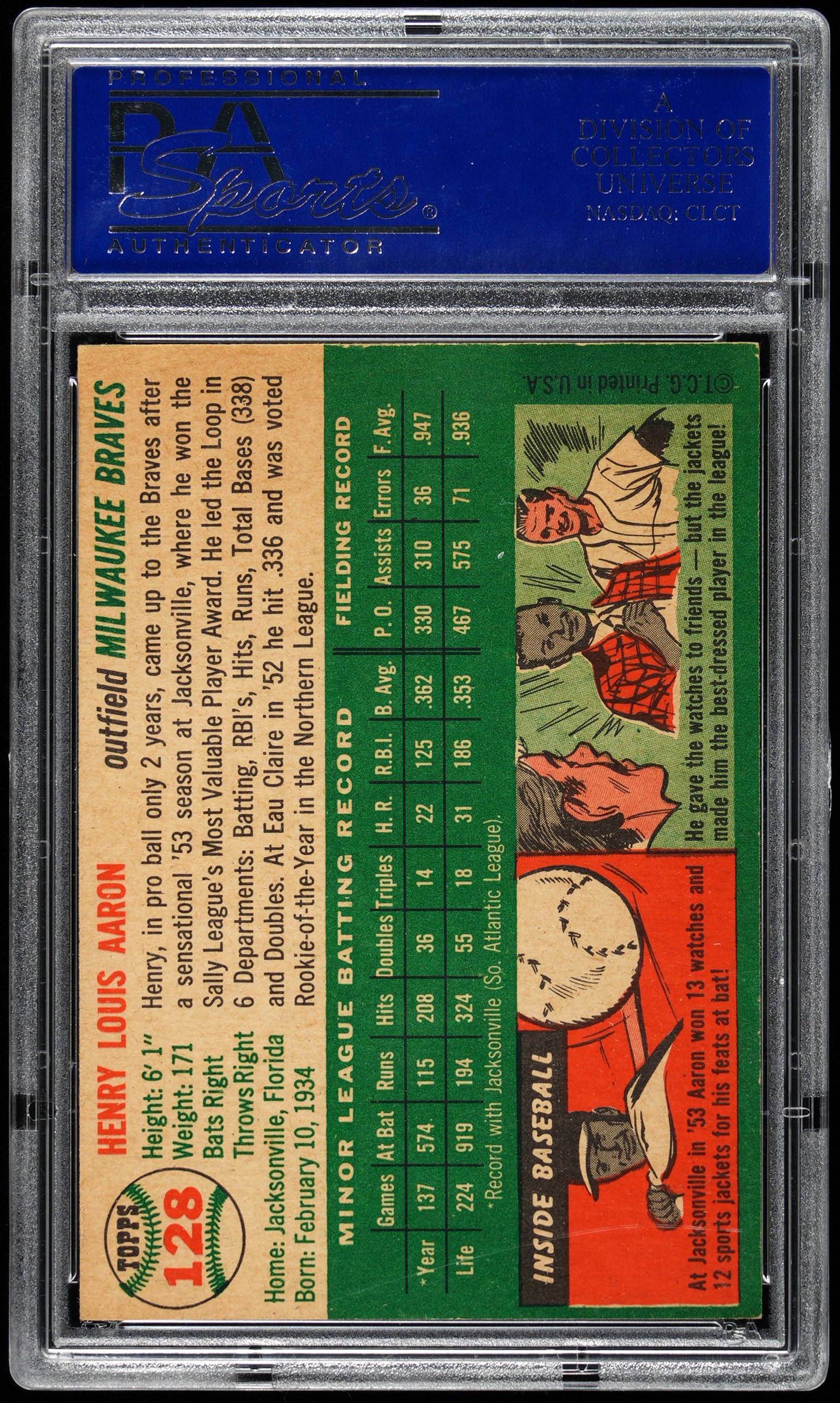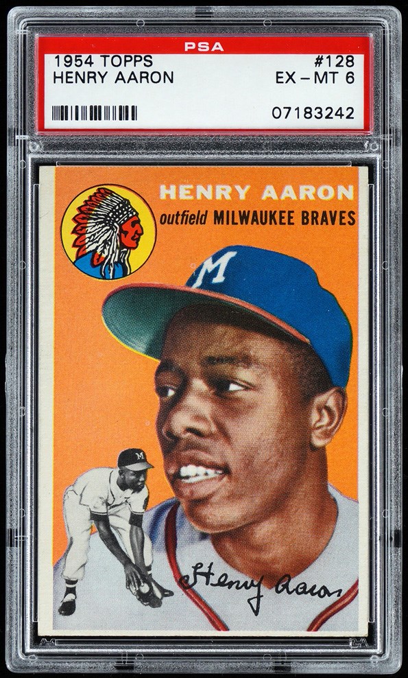 Graded EX-MT 6 by PSA. Few athletes have exemplified determination and grace in the face of arduous barriers as Henry (Hank) Aaron. The future home run king is portrayed as an up-and-coming prospect on the offered 1954 Topps #128 rookie card. This sparkling fresh example of the Milwaukee Braves Hall of Famer is amplified by a bright and intense dual action/portrait pose. Despite being a touch off-centered, the factory imperfection does not seriously impact this classic's overall appearance. Opening Bid $2,500.
