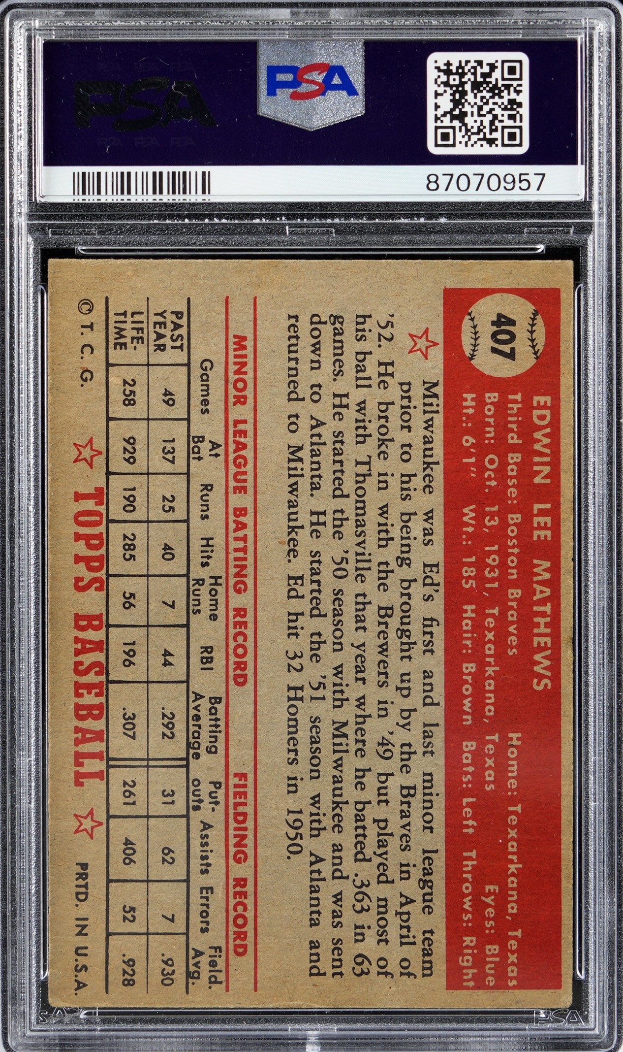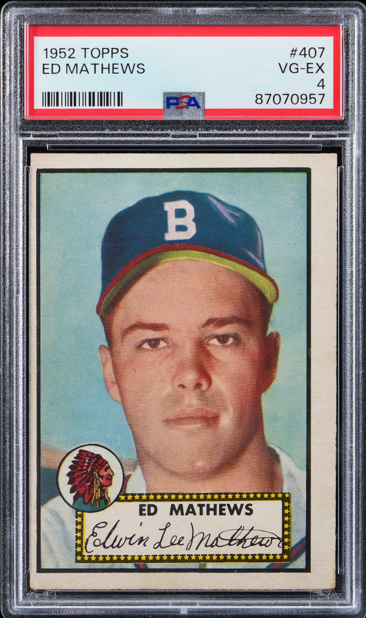 Hall of Fame Rookie Card! Graded VG-EX 4 by PSA. Rounding out the acclaimed 1952 Topps set is this rock solid #407 Eddie Mathews rookie high number. The prolific third bagger is crease-free with slightly touched corners and crisp factory edges. Despite errant factory centering, the surface of the future Hall of Famer is fresh and colorful with intricate uniform detailing. The only person to play for the Boston, Milwaukee and Atlanta Braves franchises. Opening Bid $1,500.