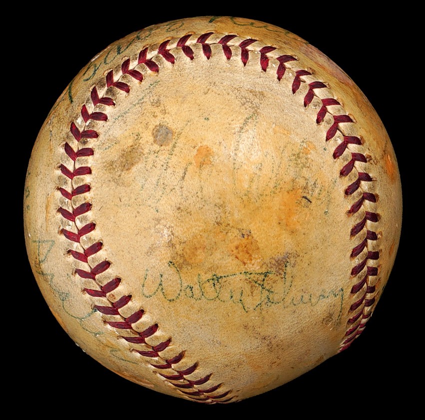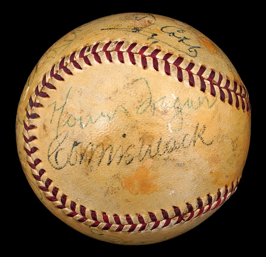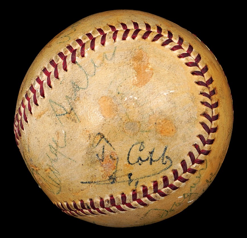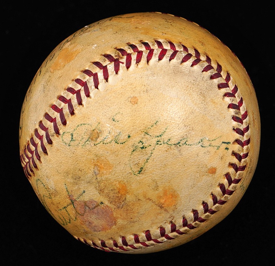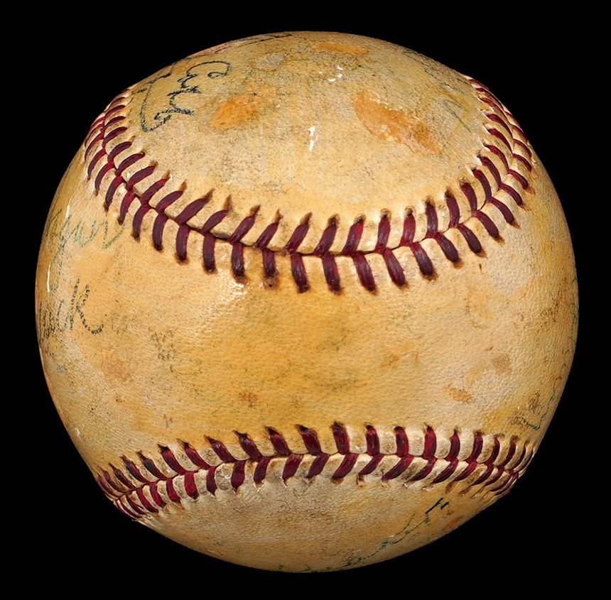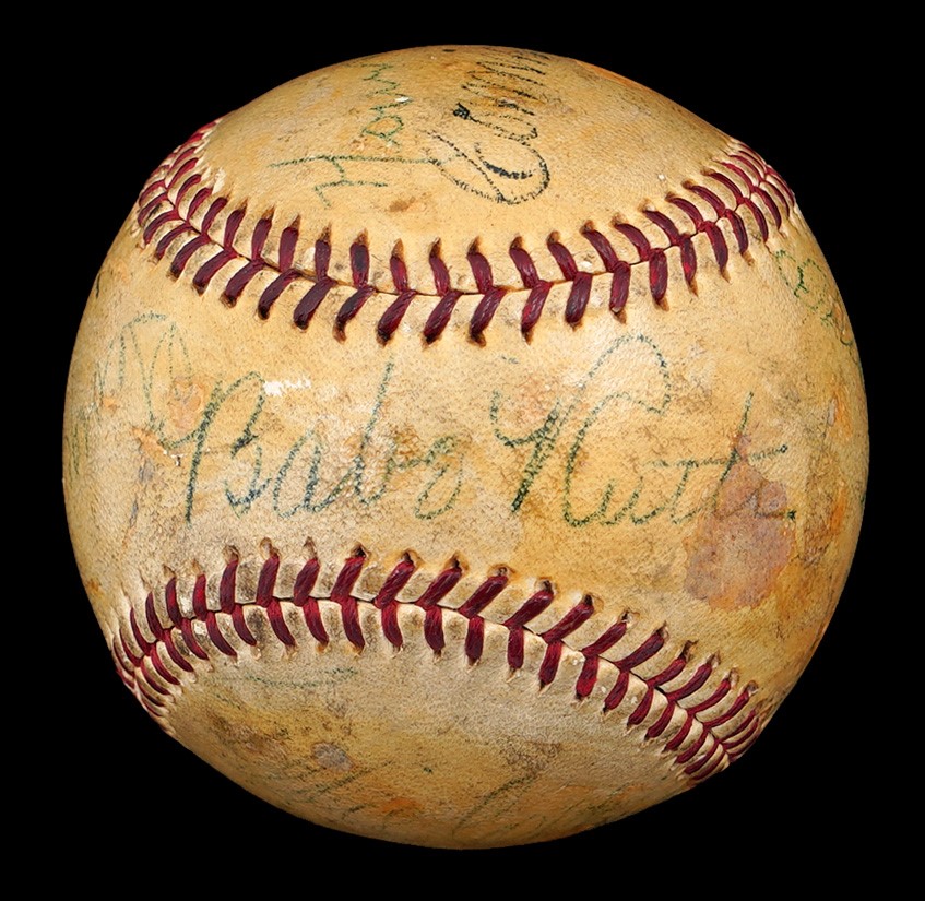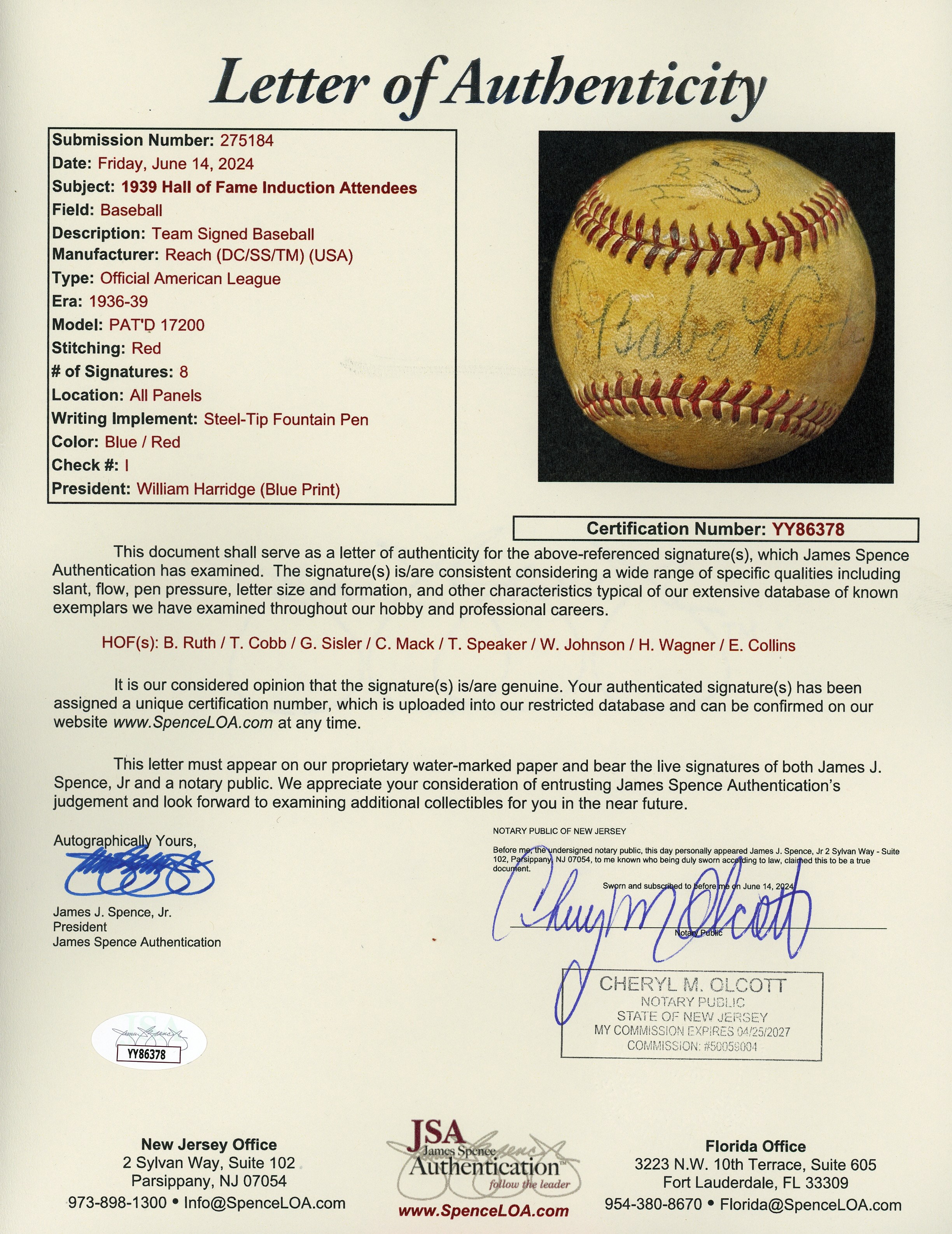 On June 12, 1939, the eleven living members of the National Baseball Hall of Fame convened in Cooperstown, New York for the opening of the museum. While 20,000+ players (and counting) have suited up for a big league franchise, these forebearers who laid the foundation for the popularity of our national pastime presented a “once-in-a-lifetime” opportunity for early autograph hounds. This superb 1939 Hall of Fame Induction multi-signed baseball crossed paths with (8) immortals who were in attendance that summer day! These steel-tip fountain pen endorsements were carefully executed across the panels of the moderately toned artifact that is coated by an even layer of period protectant (very limited chipping throughout). Includes: Sweet Spot: Ruth (“6” d.1948); West Panel: Sisler (“5-6”, d.1973), Cobb (“6”, d.1961); East Panel: Speaker (“5” d.1958); North Panel: Wagner (“5-6”, d.1955), Mack (“6”, d.1956); South Panel: E. Collins (“4”, d.1951) and W. Johnson (“5”, d.1956). A praiseworthy national treasure that is missing only Alexander, Lajoie and Young for completion. Full LOA from James Spence/JSA. Opening Bid $5,000.