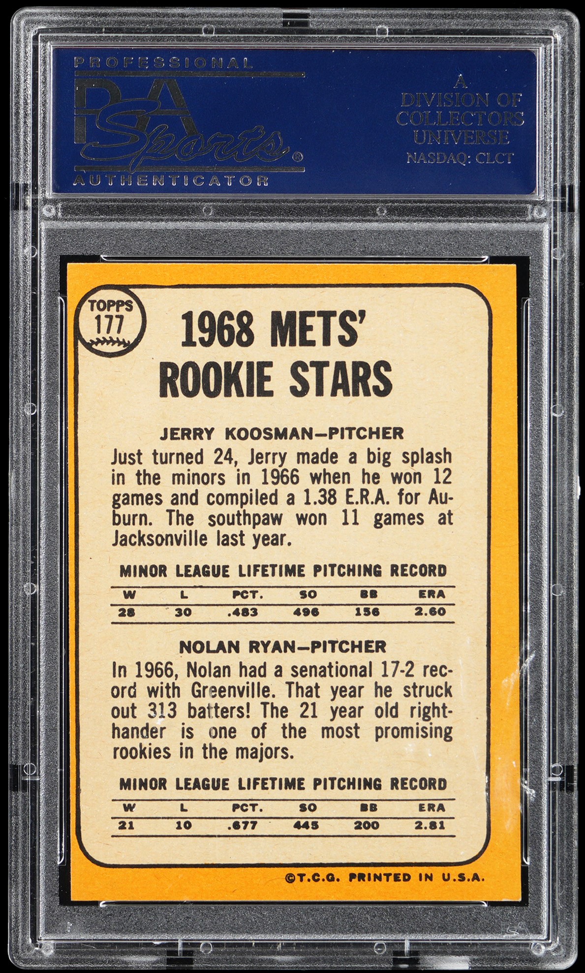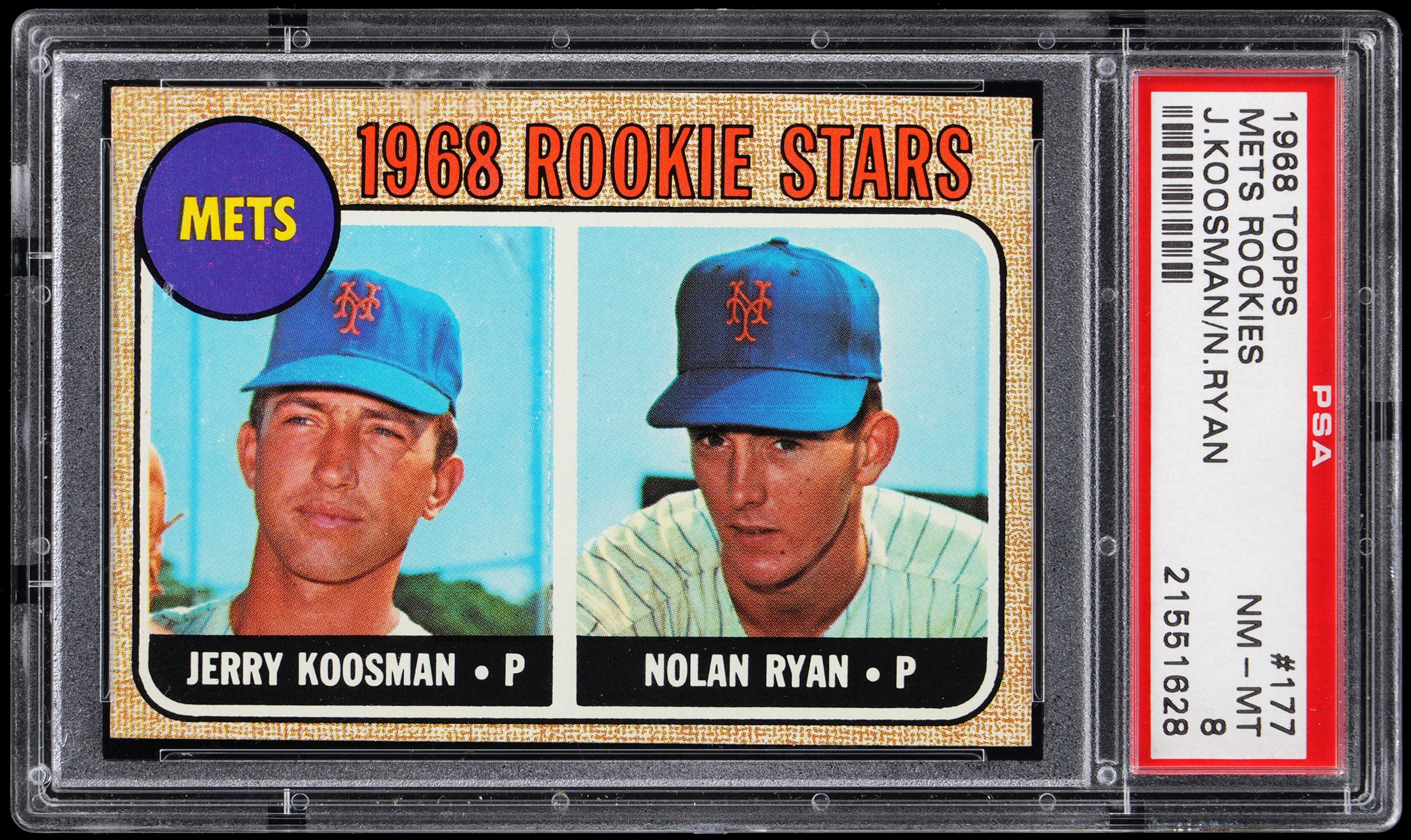 Graded NM-MT 8 by PSA. Dominating 1968 Topps #177 Nolan Ryan rookie card! This flamethrower extraordinaire ranks in the upper 5.3% of all similar Ryans evaluated by the grading service. Opening Bid $2,500.