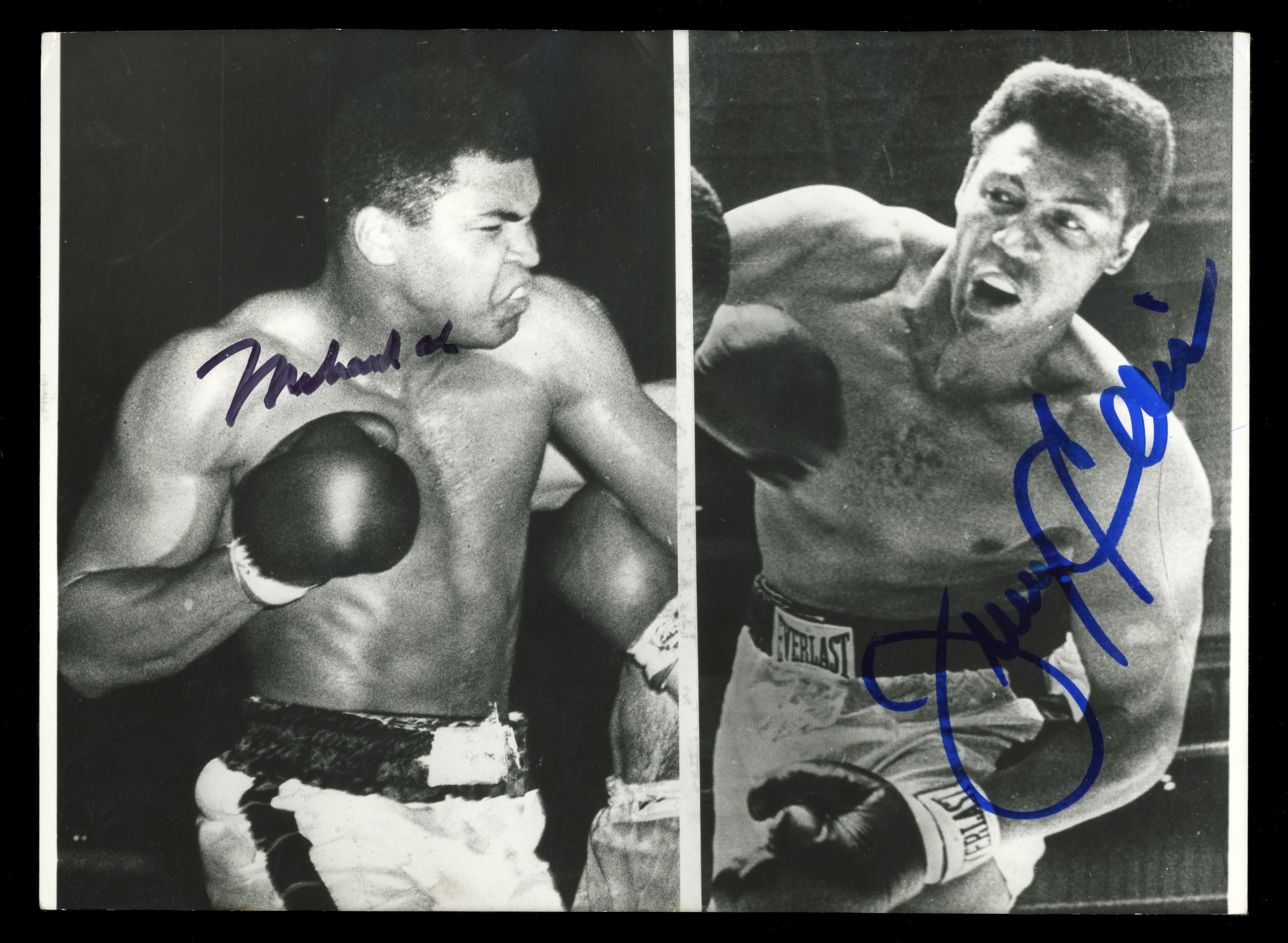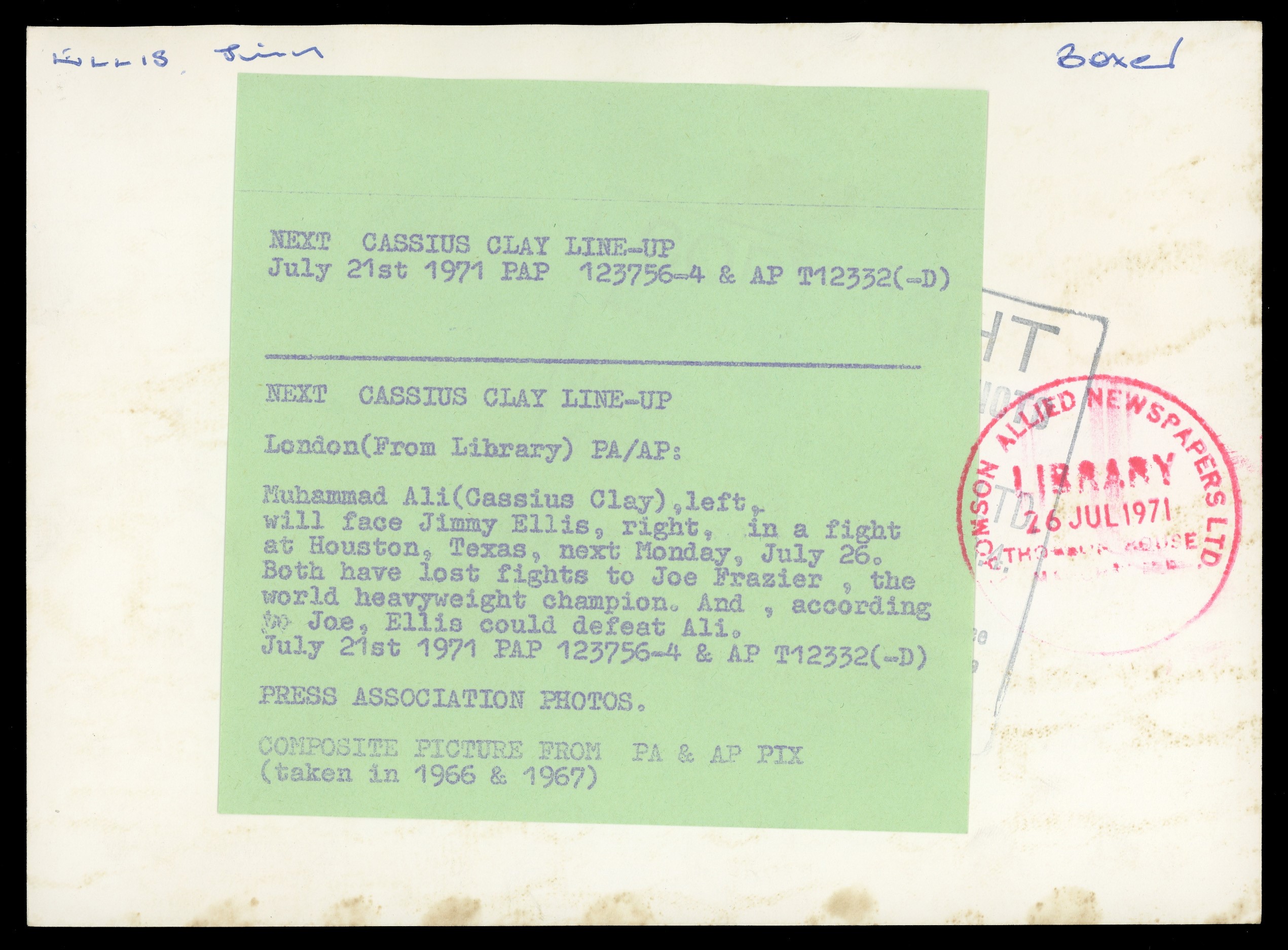 This 6" x 8" Press photo, from Allied Newspapers Limited, announcing the July 26, 1971 fight between Muhammad Ali and Jimmy Ellis, is in Excellent condition. Each of the contestants have signed on their respective images. The Ali is a ("7"), the Ellis is a ("9"). Ali won by TKO when the ref stopped the fight in the 12th round. Auction LOA from James Spence/JSA. Opening Bid $150.