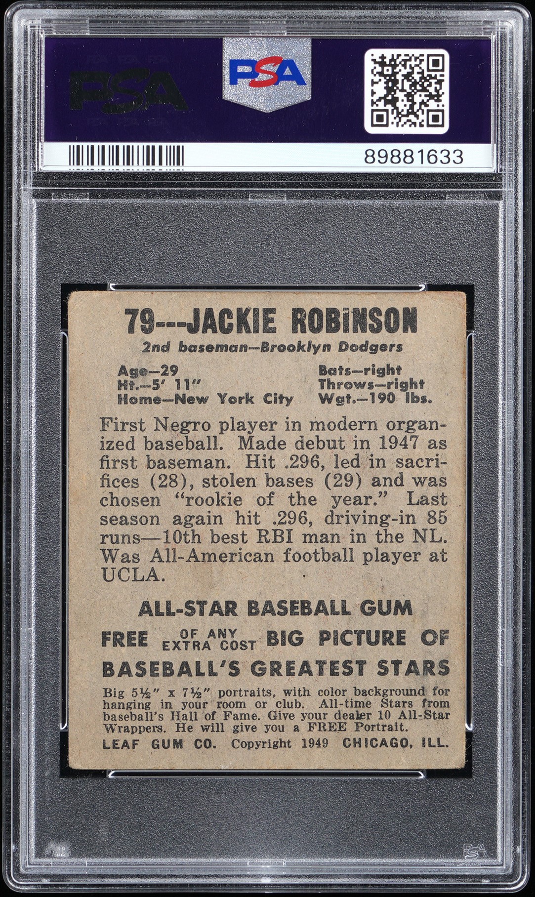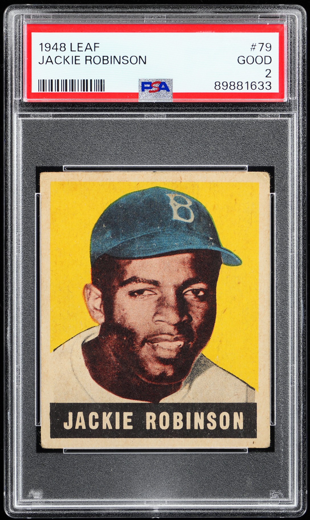 Outstanding Eye Appeal! Graded GOOD 2 by PSA. The offered 1948 Leaf #79 Jackie Robinson rookie card presents at the zenith of its overall technical grade! This stunning portrait of the inspirational figure is accurately centered with only moderate, but even corner wear. No.42's portrait is absent of any print lines common to the issue and the canary yellow color scheme is vibrant with flawless registration. The back, which records Robinson as the "First Negro player in modern organized baseball," displays only a couple of traces of reverse wax staining. A true collecting cornerstone that would not appear out of place in a higher graded holder. Opening Bid $2,500.