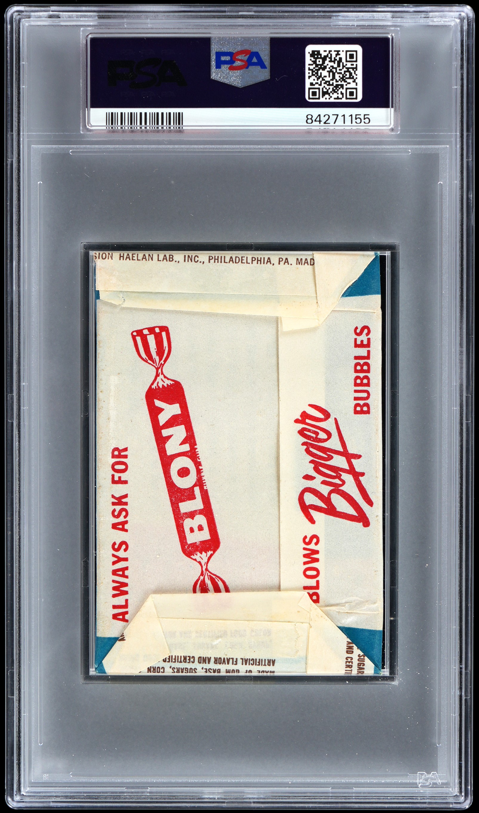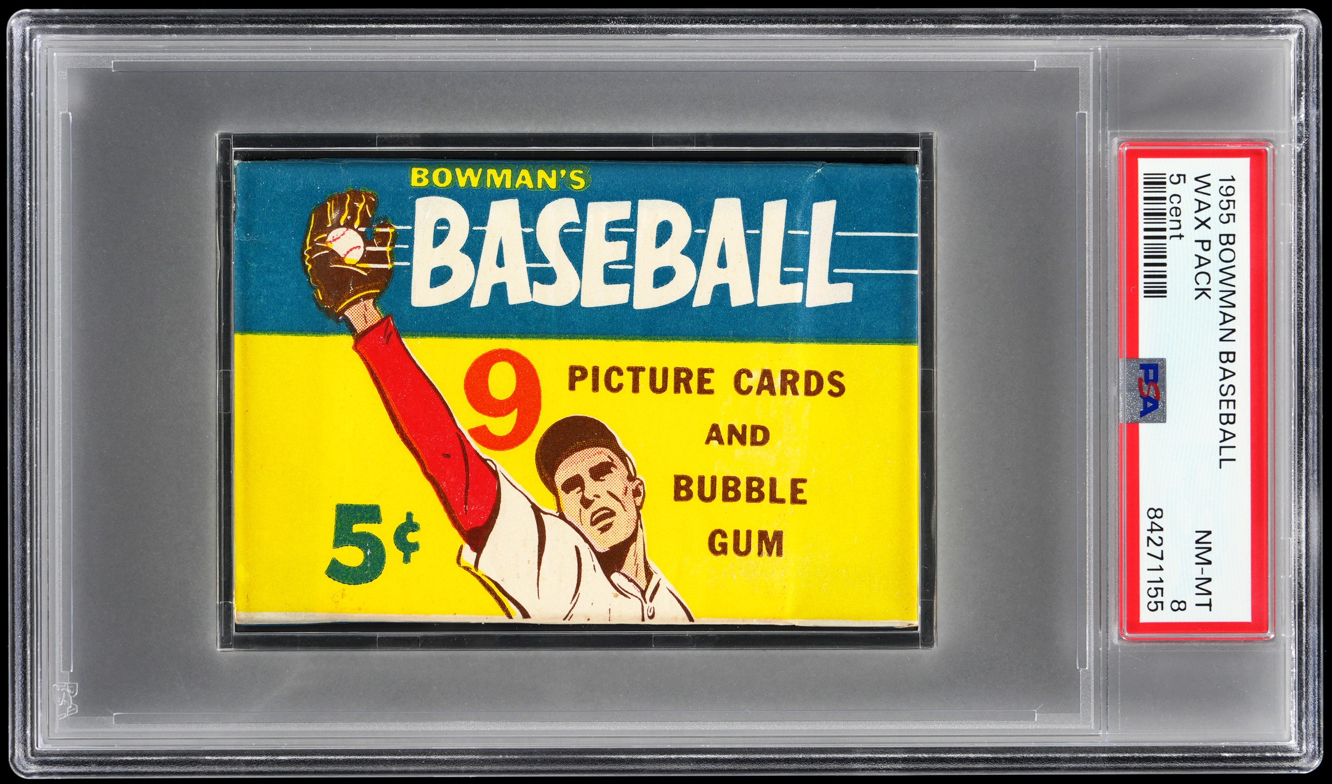Graded NM-MT 8 by PSA. Stunning 1955 Bowman 5-cent unopened wax pack containing (9) cards and a serious opportunity to score multiple high-grade pulls. This exceptional piece of "corner store" history is tightly wrapped with crisp folds, pinpoint centering and mesmerizing period advertising graphics. We'll let our bidders explore the dizzying cardboard possibilities, suffice it to say, the potential for a "once-in-a-lifetime" hit is undeniable. Only three such packs have been graded higher by the authenticator! Opening Bid $2,500.