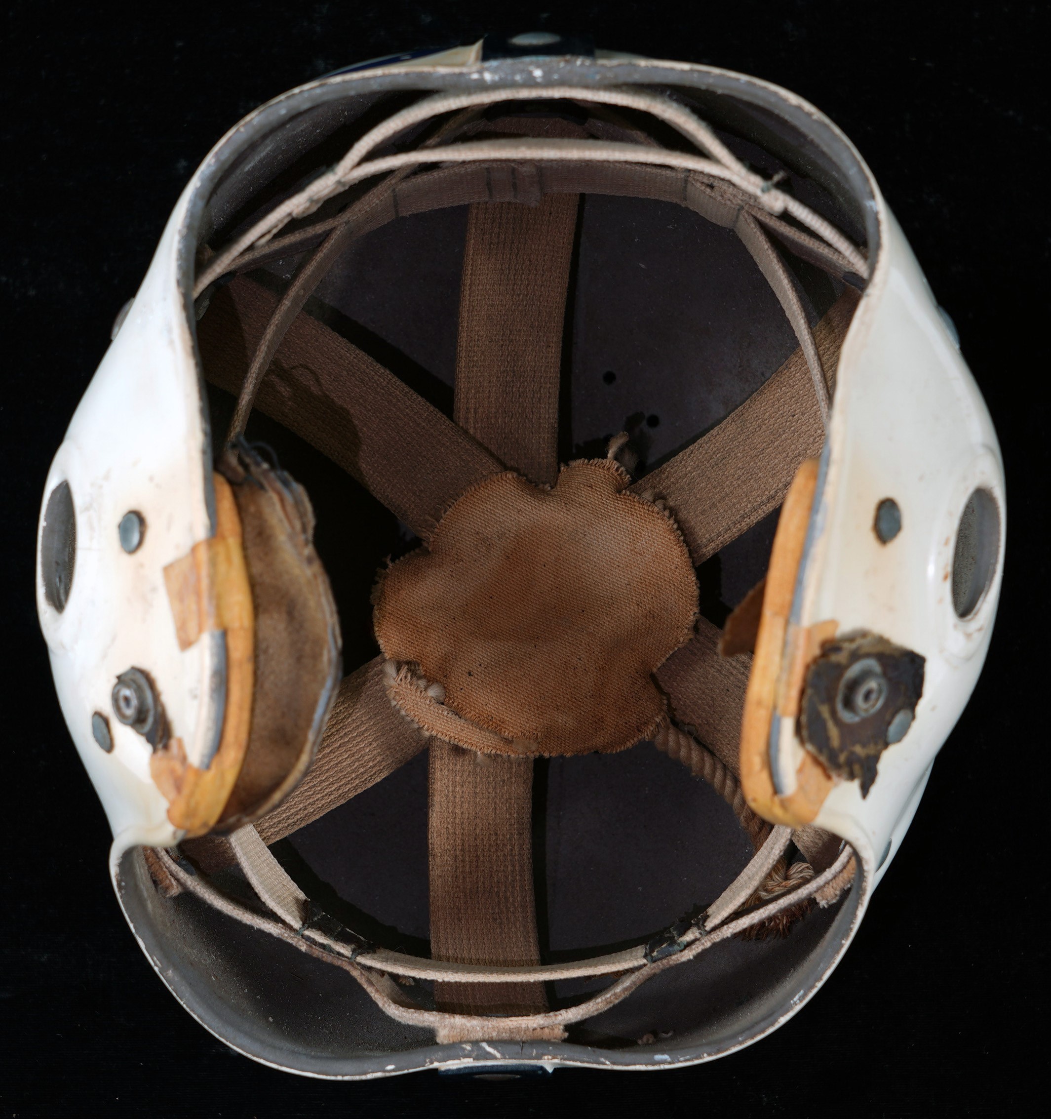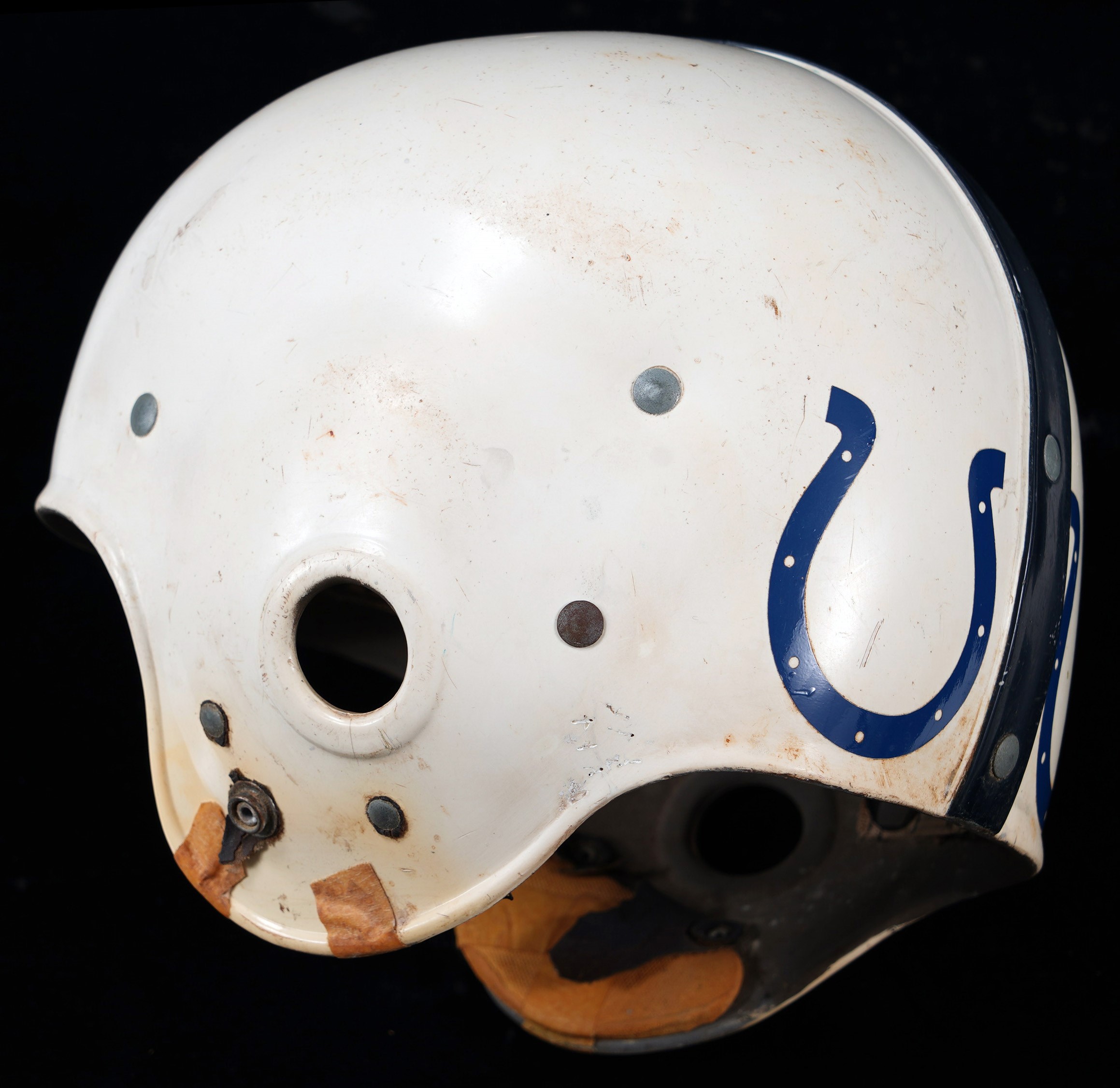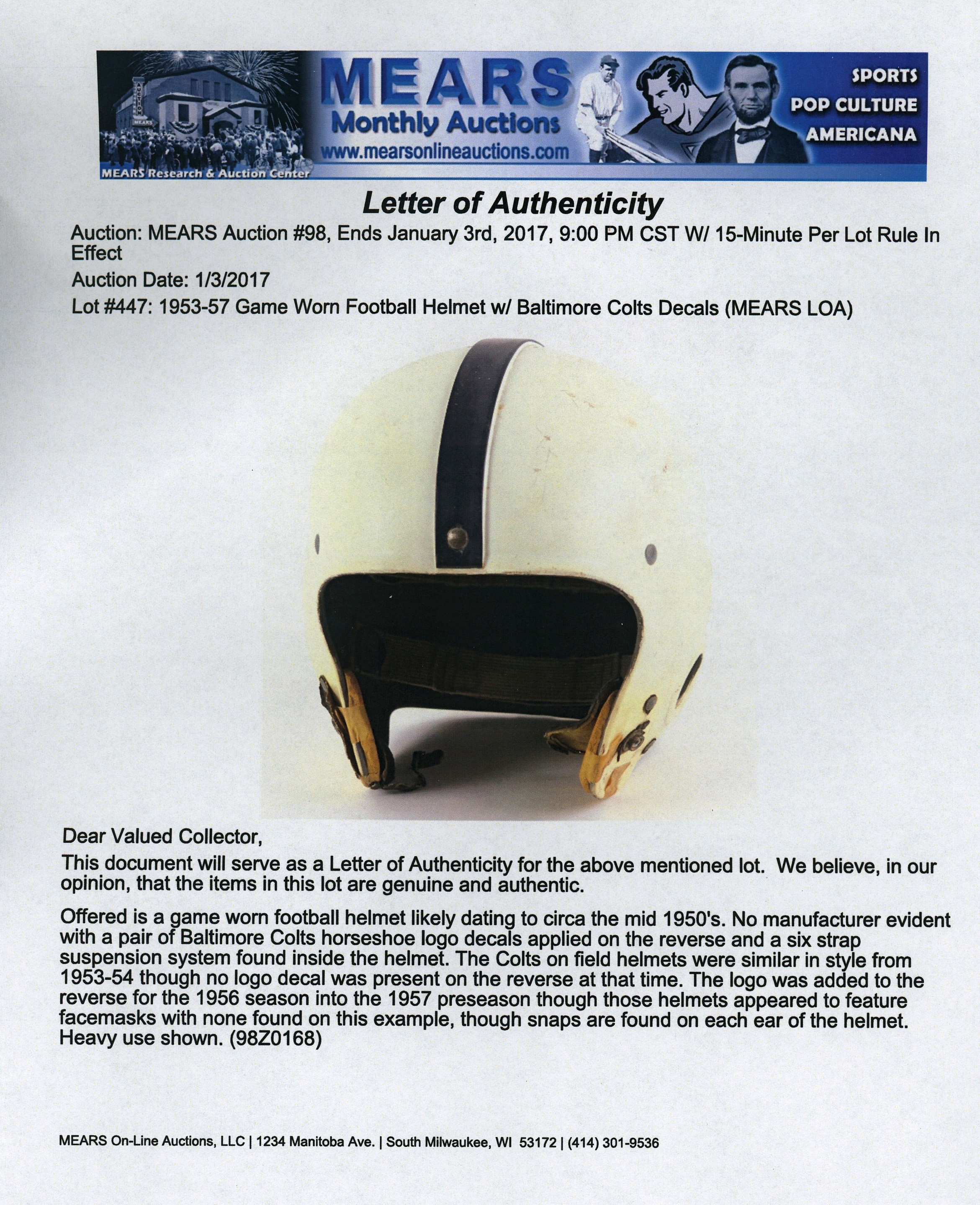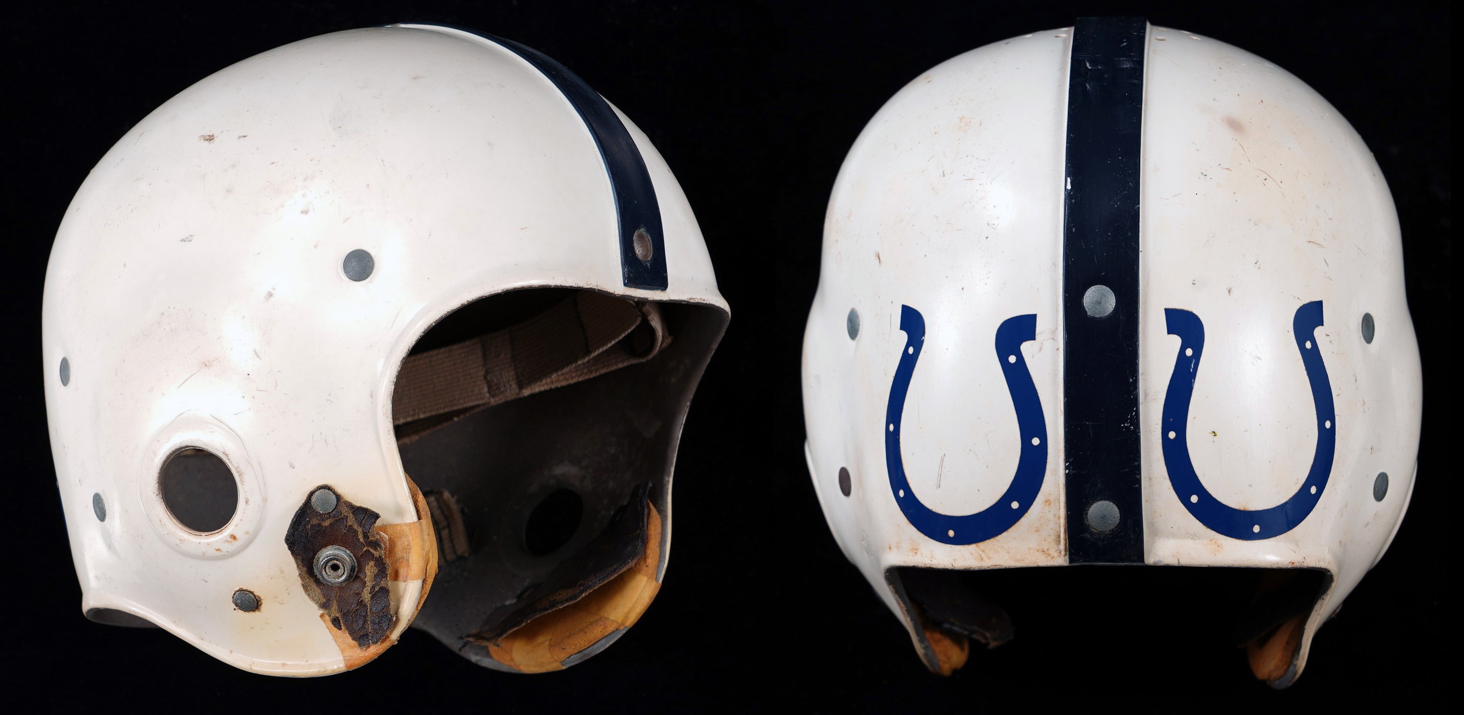 From the earliest years of the current Indianapolis Colts franchise comes this 1953-1957 Baltimore Colts game-worn helmet. Affixed at rear with a pair of classic Colts horseshoe logos, this ancient gamer shows heavy signs of authentic use including abrasions and soiling on the exterior, and sweat staining on the interior six-strap suspension system. The Colts did not have logos on their helmets in 1953 and 1954 seasons and the logos were added for the 1956 season, which also saw the team employ facemasks. While the facemask is absent from this example, the snaps for fastening the mask are present. No manufacturer labeling is noted, but the genuine appeal of this vintage helmet is abundant. Comes with Mears LOA. Opening Bid $150.