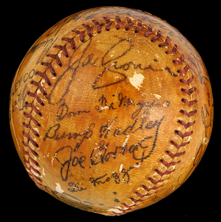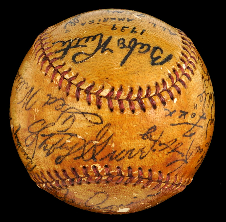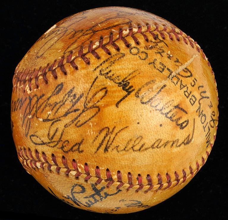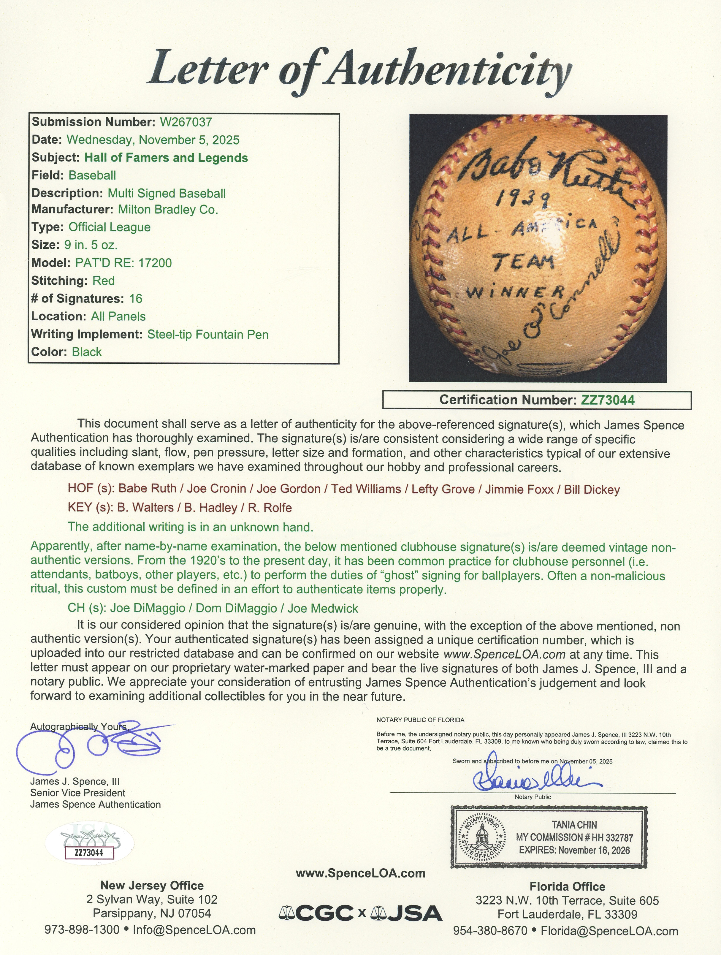 Presented is an extraordinary 1939 All-America Team Winner signed baseball featuring 16 bold signatures, headlined by a stunning Babe Ruth and a rookie Ted Williams. A total of nine Hall of Famers appear on the ball (two others - Medwick and DiMaggio - were deemed clubhouse signatures). Ruth’s signature, placed prominently on the side panel, displays exceptional boldness and clarity. Underneath in an unknown hand is penned "1939 All-America Team Winner" alongside the signature of Joe O'Connell. Also featured on the baseball are the signatures of Joe Cronin (HOF), Dom DiMaggio (clubhouse), Bump Hadley, Joe Gordon, Joe DiMaggio (clubhouse), Red Ruffing (HOF), Jimmie Foxx (HOF), Red Rolfe, Bill Dickey (HOF), Joe McCarthy (HOF), Bucky Walters, Lefty Grove (HOF), and Joe Medwick (clubhouse). The signatures exhibit remarkable preservation and are overall crisp and clean. The baseball is heavily toned and covered by a thin coating of protective shellac. Issued during Ruth’s post-playing ambassadorial years, this piece bridges two generations of baseball greatness. The inclusion of Williams’ early-career autograph adds immense historical significance and serves as both a celebration of baseball’s past and a preview of its future. Full LOA from James Spence/JSA.