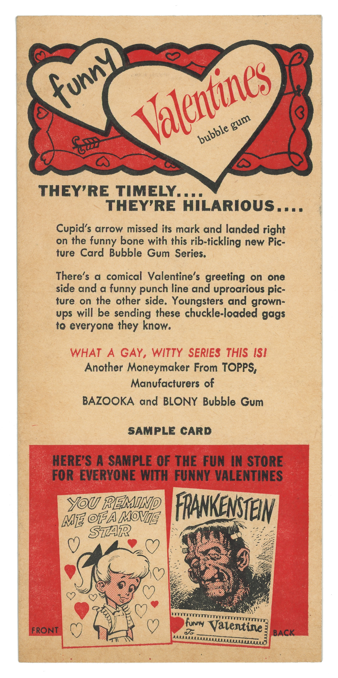Non-Sport aficionados feel the sweet sting of Cupid's arrow, with this 1959 Topps Funny Valentines salesman's sample 3-card panel. Considered extremely rare, this uncut panel is crisp and vibrant, with slight corner wear and moderate creasing on the left end card, to rate as VG. The middle and right end cards are very pleasing, and the stock is solid. Reverse side promotional text includes "What A Gay, Witty Series This Is! Another Moneymaker From Topps, Manufacturers of Bazooka and Blony Bubble Gum", and "Sample Card". Enjoy the fun, and show your love for this rare cardboard classic!