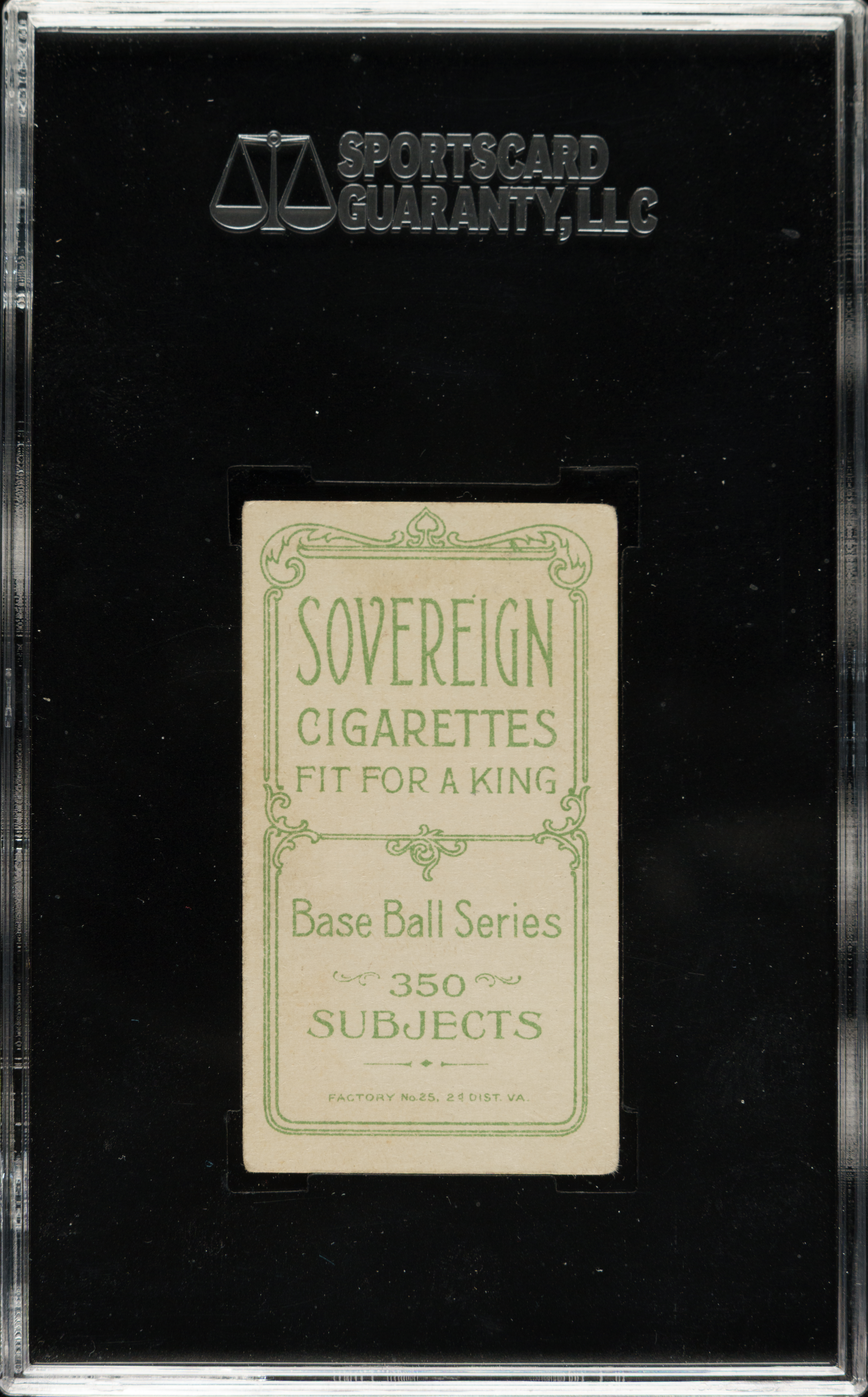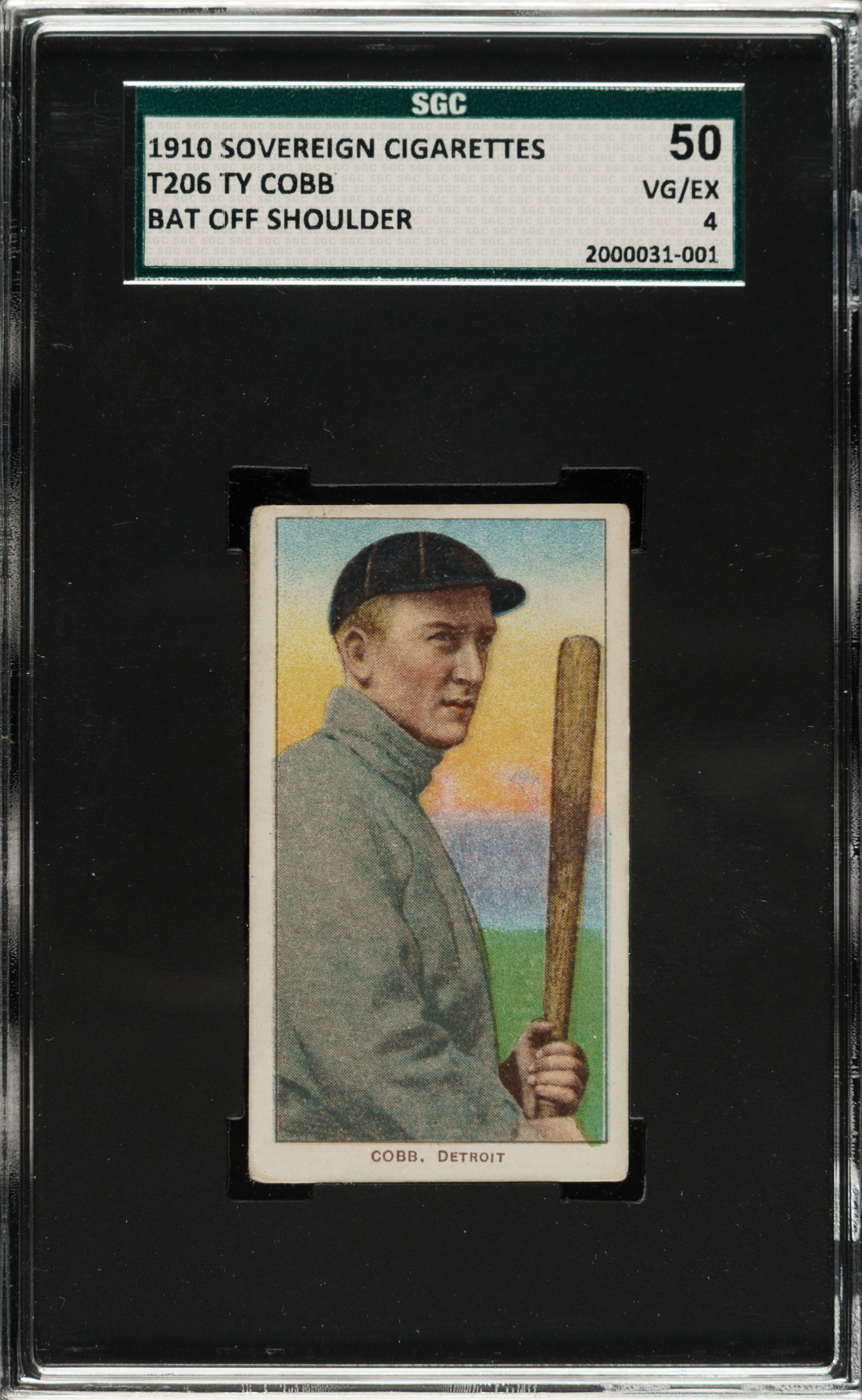 Graded VG/EX 4 by SGC. With a determined glare and fiery disposition, Ty Cobb clutches his weapon of choice on the offered 1909-1911 T206 White Border "Bat Off Shoulder" pose. This timeless treasure is crease-free with only mild corner wear, creamy white edges and soft surface colors. The scarce and desirable Sovereign 350 Subjects advertising back is clean with crisp green typeface. Of the 29 total copies of the player/pose/brand combination judged by SGC, this Class of 1936 Hall of Fame relic ranks as 1 of 3 at the grading level with only two better. As the value of turn-of-the-century Cobb material continues to soar, this is a prime opportunity to secure a tougher Cobb back before prices reach the stratosphere!