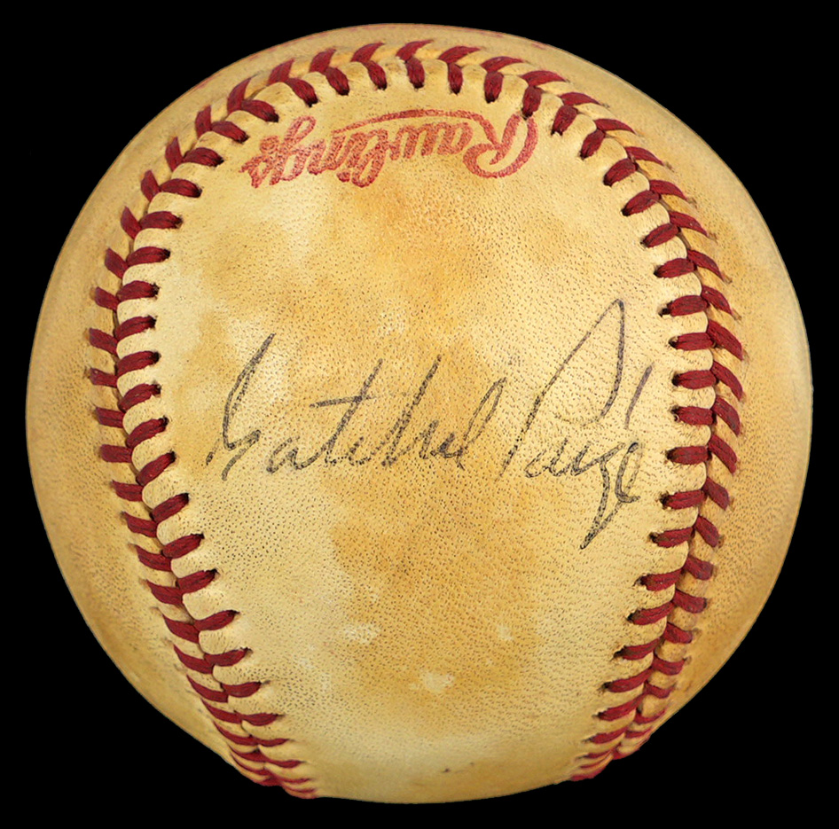 An important Hall of Fame signature hits the block with this Satchel Paige single-signed baseball. Widely regarded as one of baseball's greatest pitchers ever, Paige was the first Negro Leagues star inducted into the Hall of Fame. Paige was also full of amusing stories and anecdotes, which made him a popular choice for personal appearances throughout his later years. His historic status, and long ago demise in 1982, keep his autograph in perpetual high demand. This Paige signed Official 1978 World Series baseball stands ready to satisfy your demand, with a readily discernible side panel signature. Mottled with shades of tan, the ball retains legible factory labeling, and shows great vintage appeal.