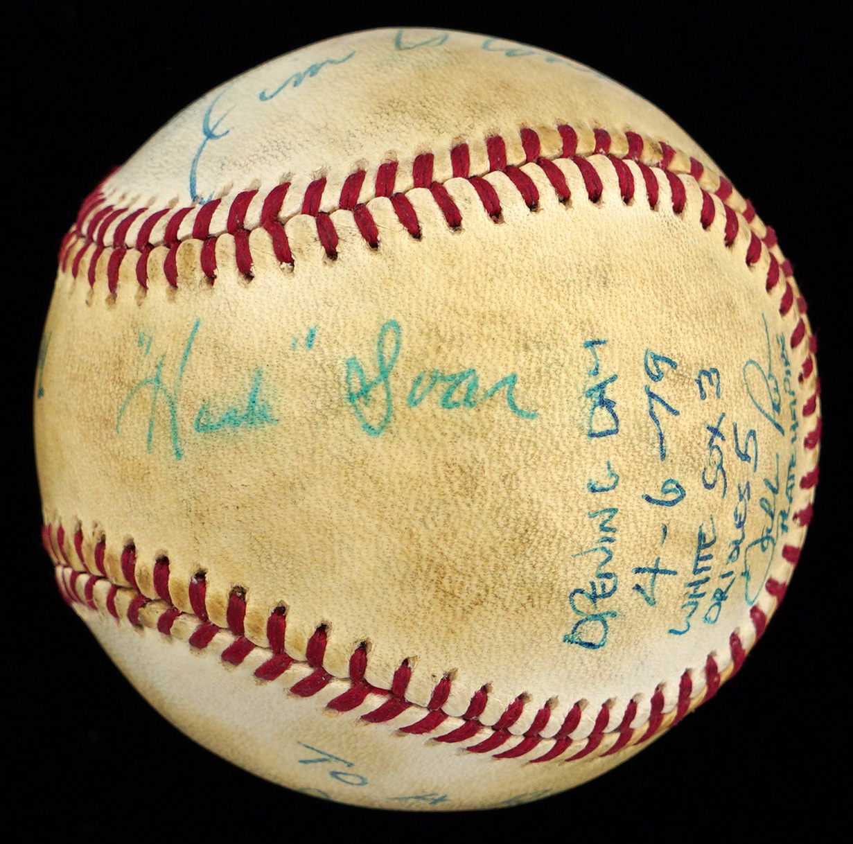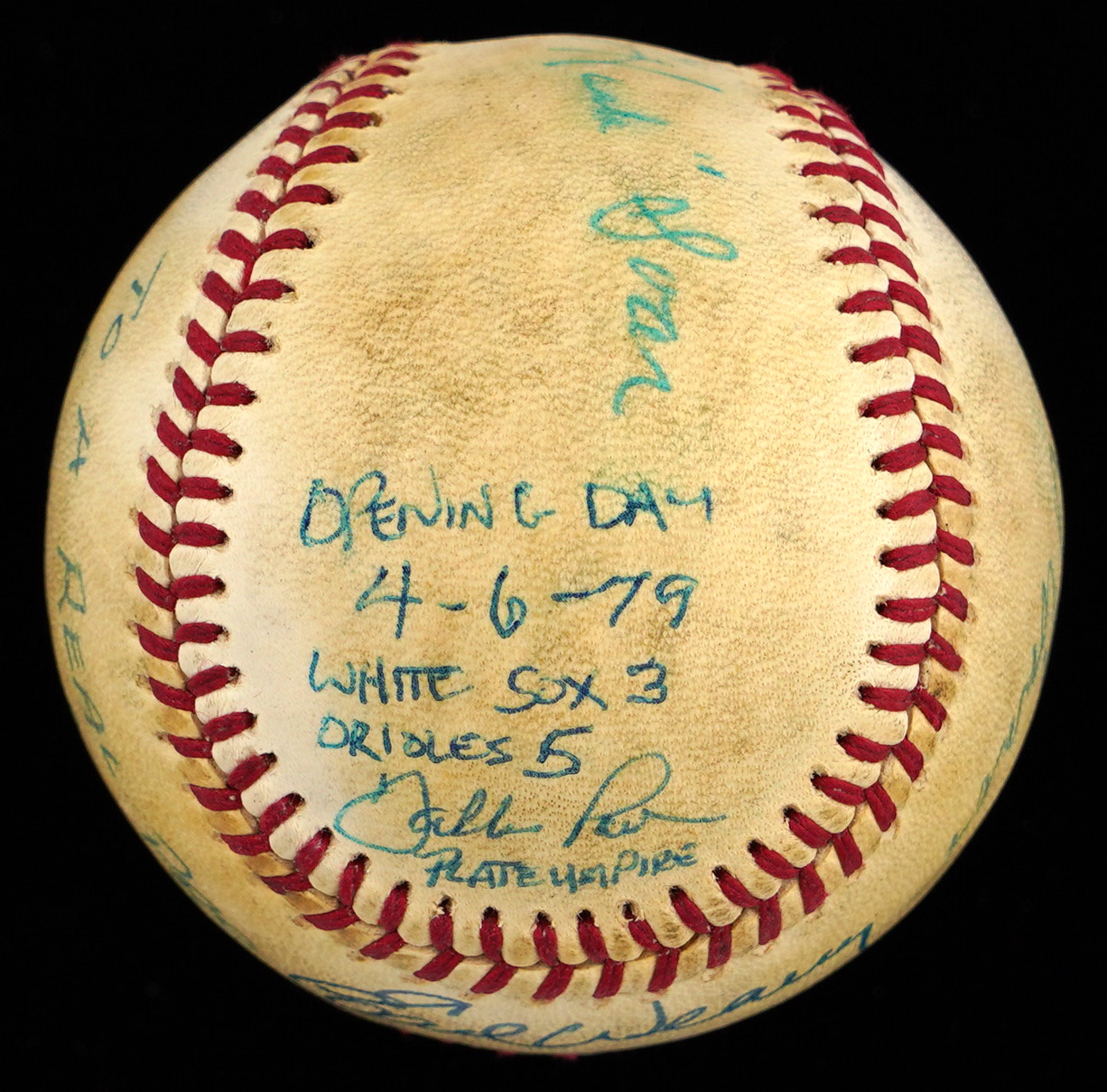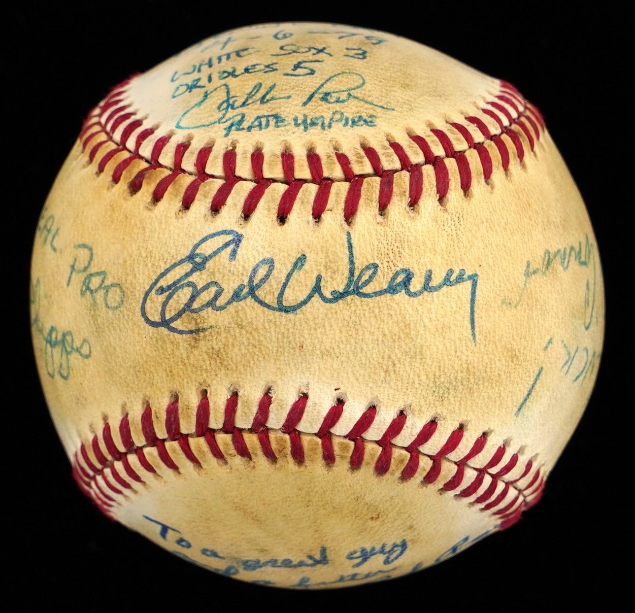 Here's a unique item. Along with Baltimore manager, Earl Weaver (HOF), the umpiring crew from the1979 Baltimore Orioles versus Chicago White Sox Opening Day game At Memorial Stadium have signed this baseball with no stampings, appearing to be signing for one of the umpires. The sweet spot of the toned baseball has a big signature from Earl Weaver. The west panel is signed “To a Real Pro, Jerry Phipps.” The east panel is signed “Good luck! Jim O'Connor.” The north panel is signed “Opening Day 4-6-79 - White Sox 3 - Orioles 5 - Dallas Parks - Plate Umpire.” and “Hank” Soar (ump supervisor). The south panel is signed “To a Great Guy and Better Umpire, Bob Roesner.” The reverse sweet spot is signed “A ‘Guts’ Official, Wayne Keister.” Signatures and inscriptions average (“7 to 9”).
