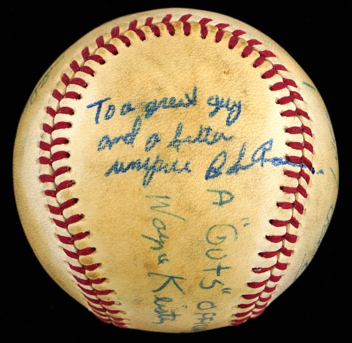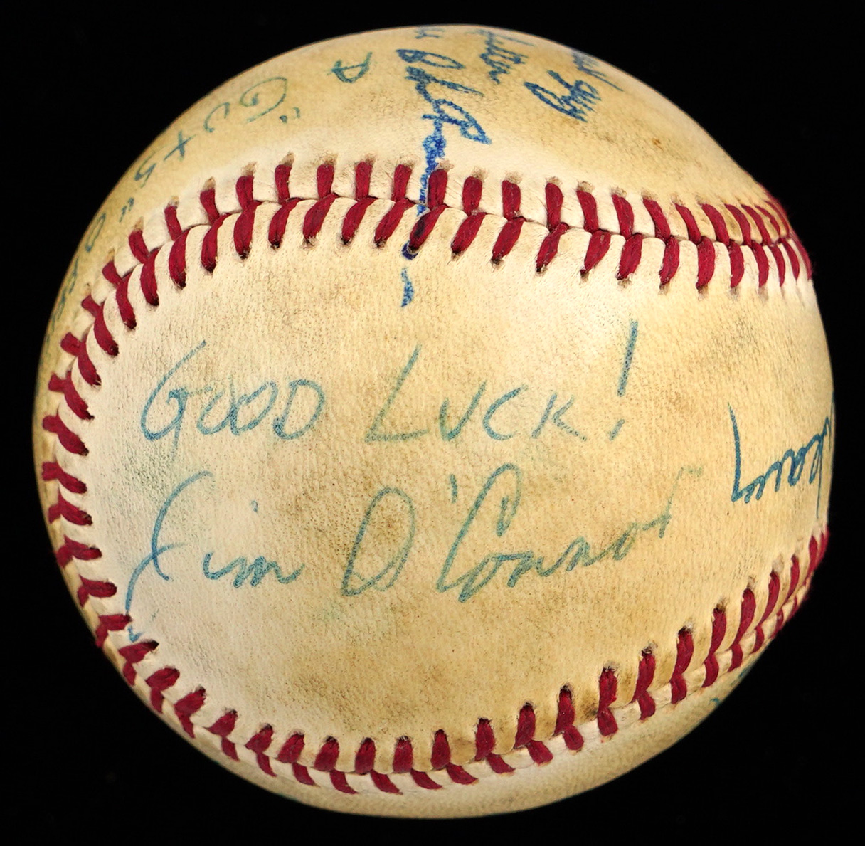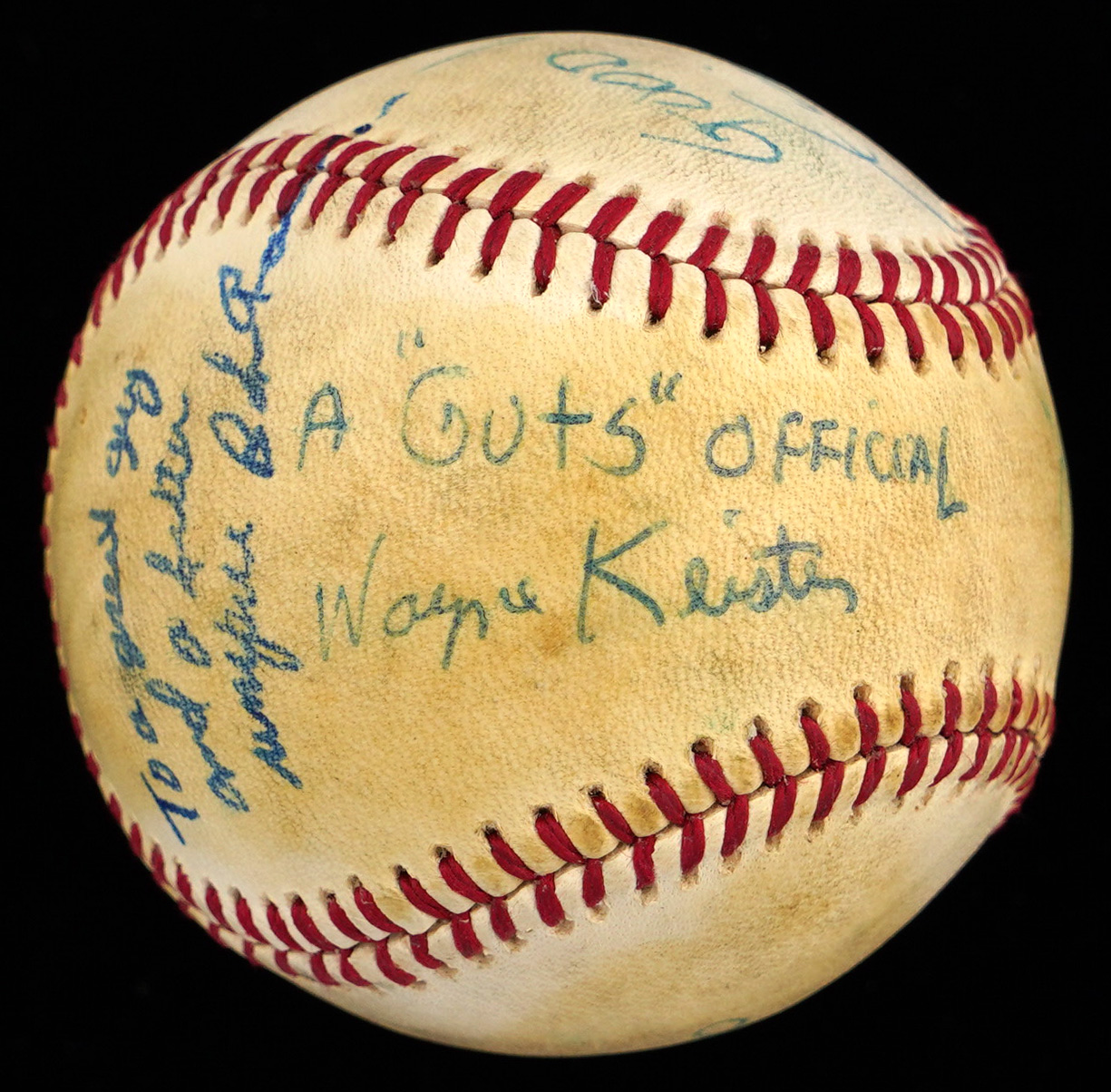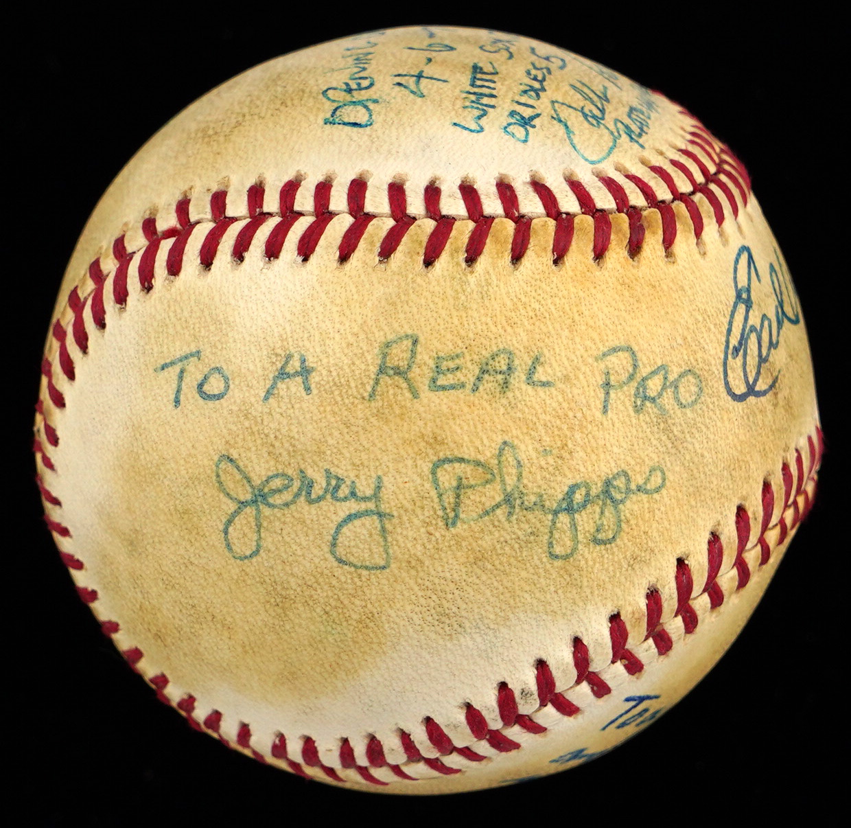 Here's a unique item. Along with Baltimore manager, Earl Weaver (HOF), the umpiring crew from the1979 Baltimore Orioles versus Chicago White Sox Opening Day game At Memorial Stadium have signed this baseball with no stampings, appearing to be signing for one of the umpires. The sweet spot of the toned baseball has a big signature from Earl Weaver. The west panel is signed “To a Real Pro, Jerry Phipps.” The east panel is signed “Good luck! Jim O'Connor.” The north panel is signed “Opening Day 4-6-79 - White Sox 3 - Orioles 5 - Dallas Parks - Plate Umpire.” and “Hank” Soar (ump supervisor). The south panel is signed “To a Great Guy and Better Umpire, Bob Roesner.” The reverse sweet spot is signed “A ‘Guts’ Official, Wayne Keister.” Signatures and inscriptions average (“7 to 9”).