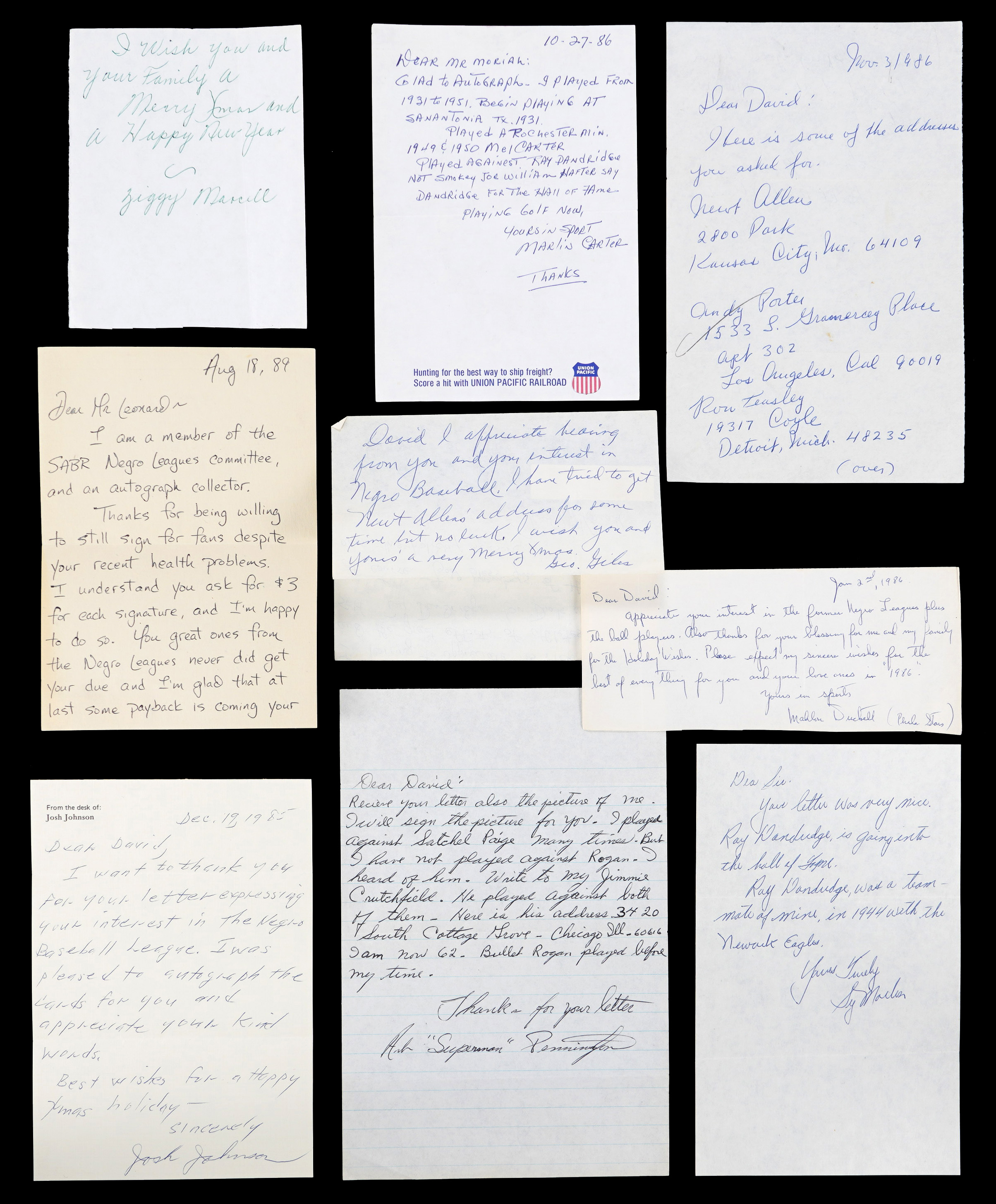 These (9) pieces of correspondence with players from the Negro Leagues, collected in the 1980s, are on note paper ranging in size from 5” in length to 6x9. The ballpoint letters are in Excellent or better condition and feature nice (“8-9”) signatures.