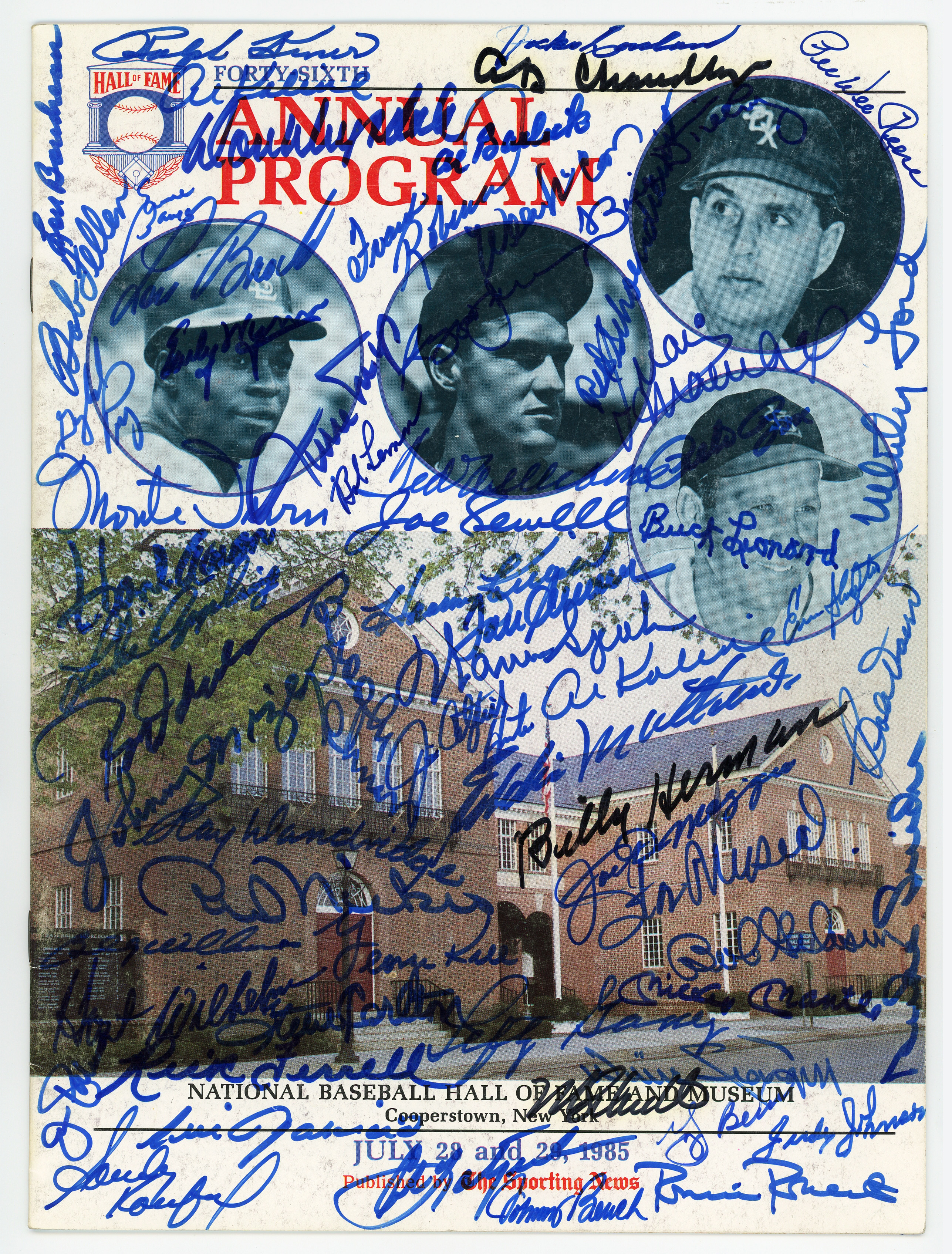 Hall of Fame alumni gathered in great number for the 1985 induction ceremony at Cooperstown. Held on the final weekend of July, this prestigious event honored the Class of 1985, Lou Brock, "Arky" Vaughn, Hoyt Wilhelm, and Enos Slaughter. This ceremony yielded a bumper crop of prized autographs for a very fortunate attendee, who collected (60+) signatures on the front of the offered 1985 Hall of Fame program. The program reports in solid condition, and the signatures average ("9" to "10") strength.