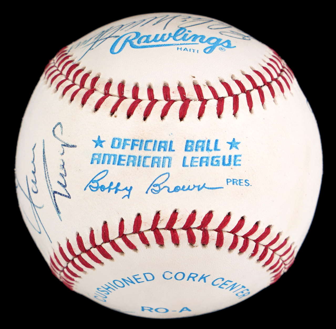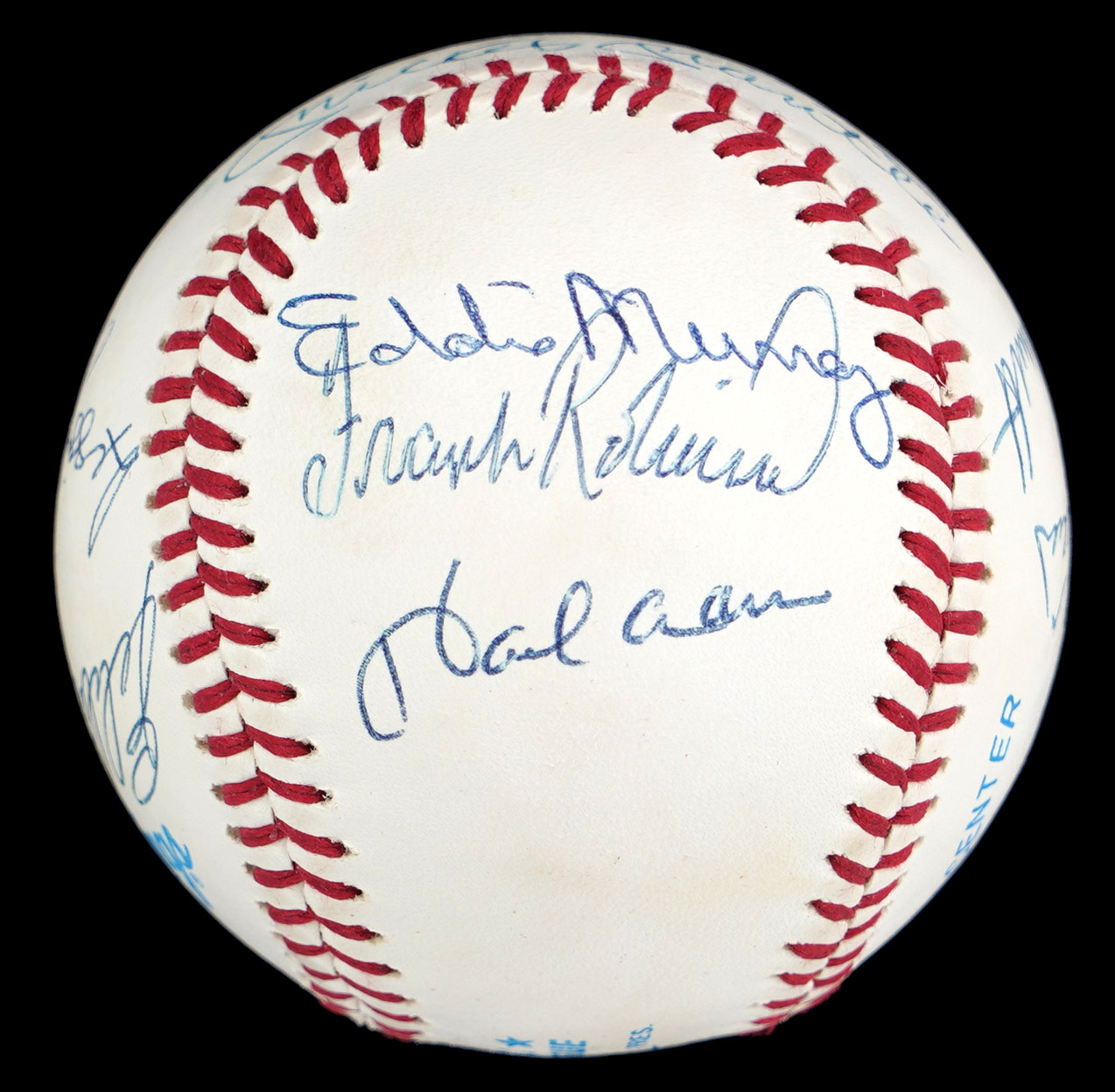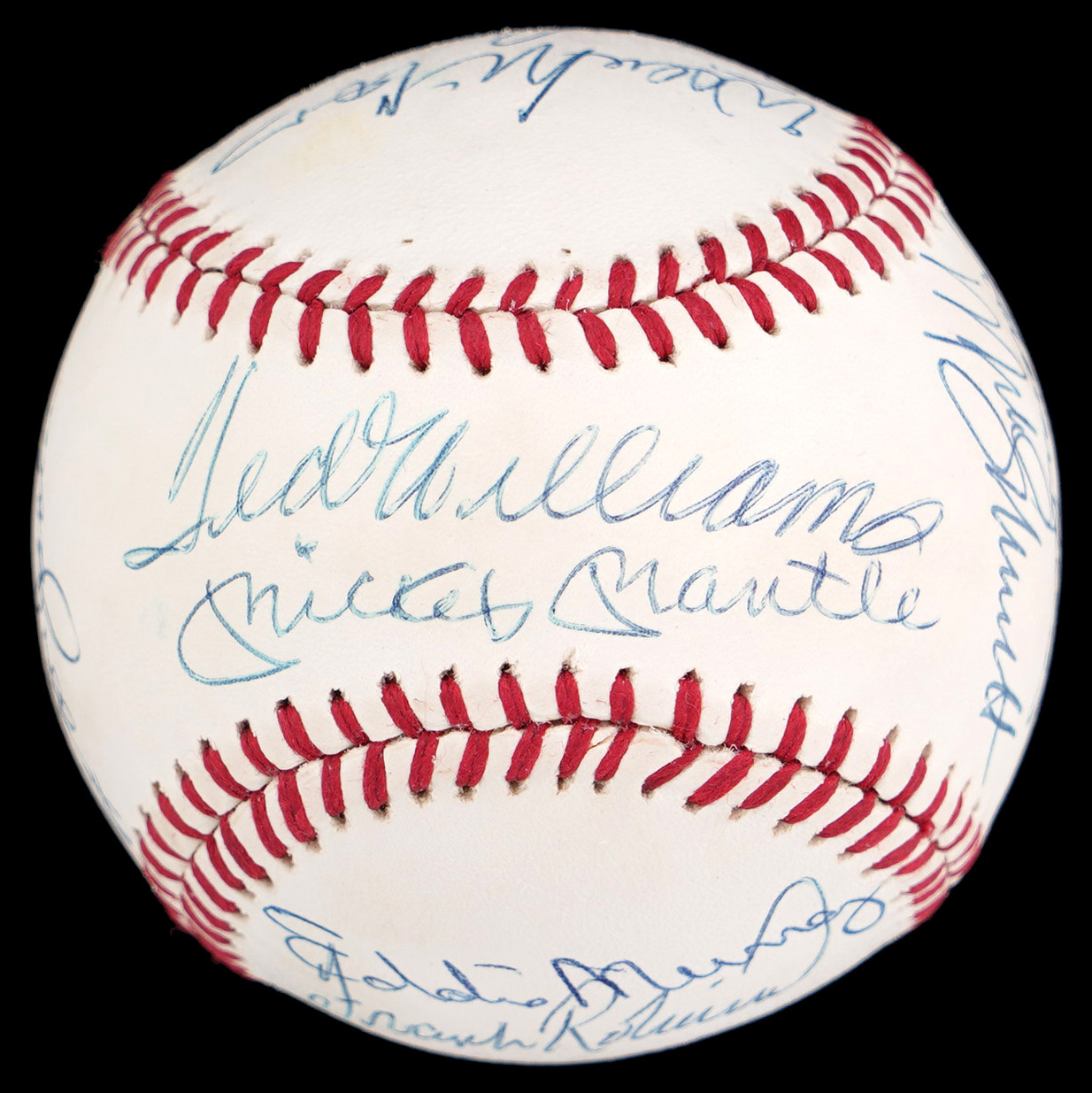 A dozen of baseball's greatest sluggers are collected, with this 500 Home Run Club multi-signed baseball. This handsome OAL/Brown ball boasts 12 signatures, averaging "8" to "9" strength, including the welcome presence of Eddie Murray, and sweet spot occupation by Mickey Mantle and Ted Williams.