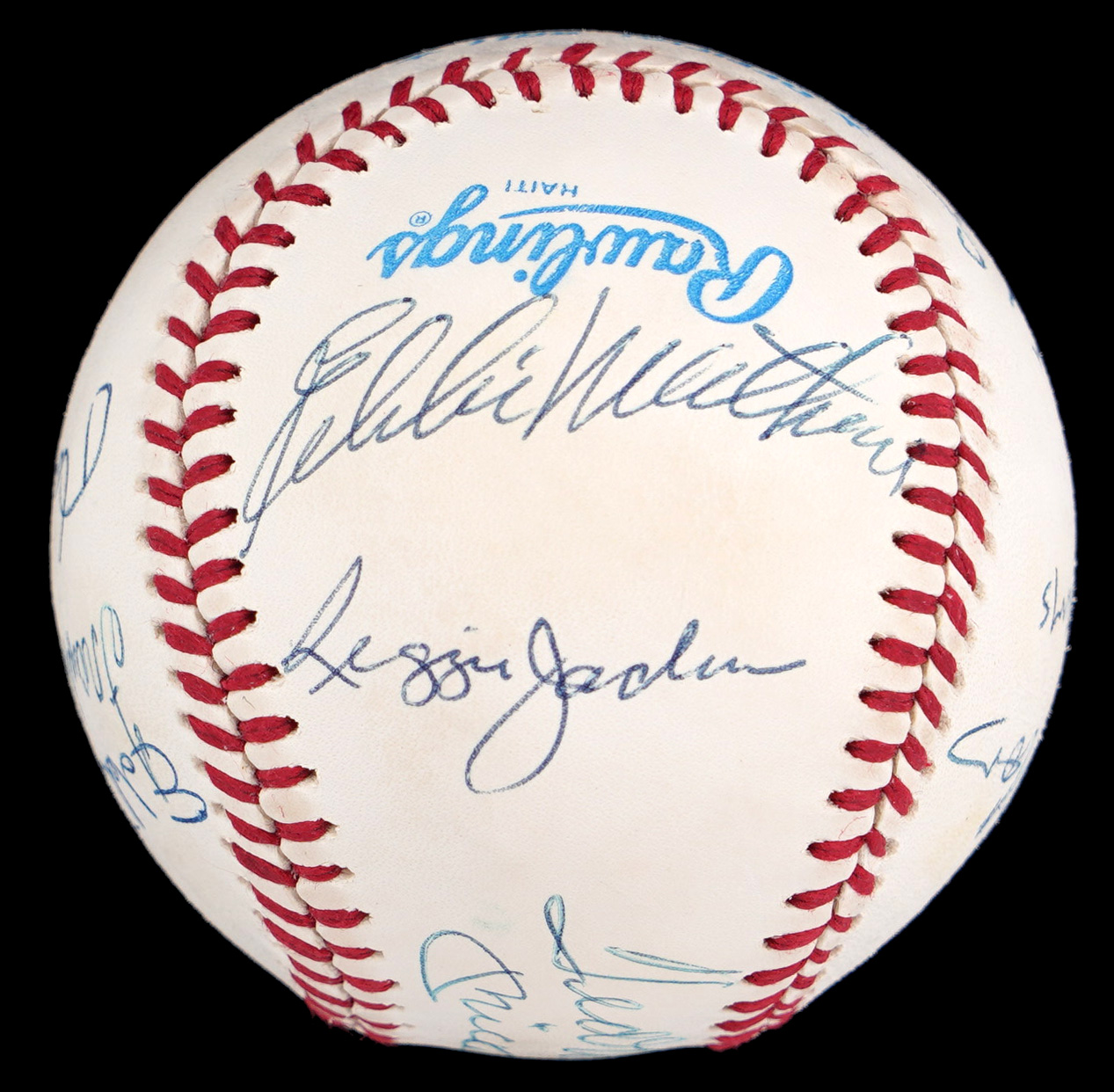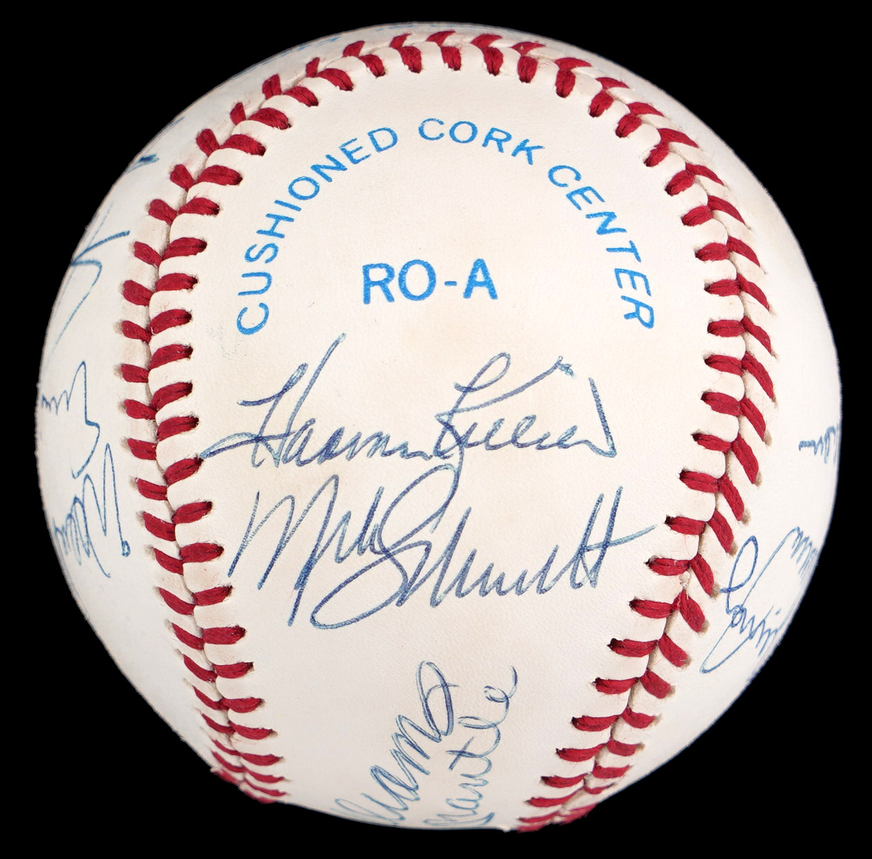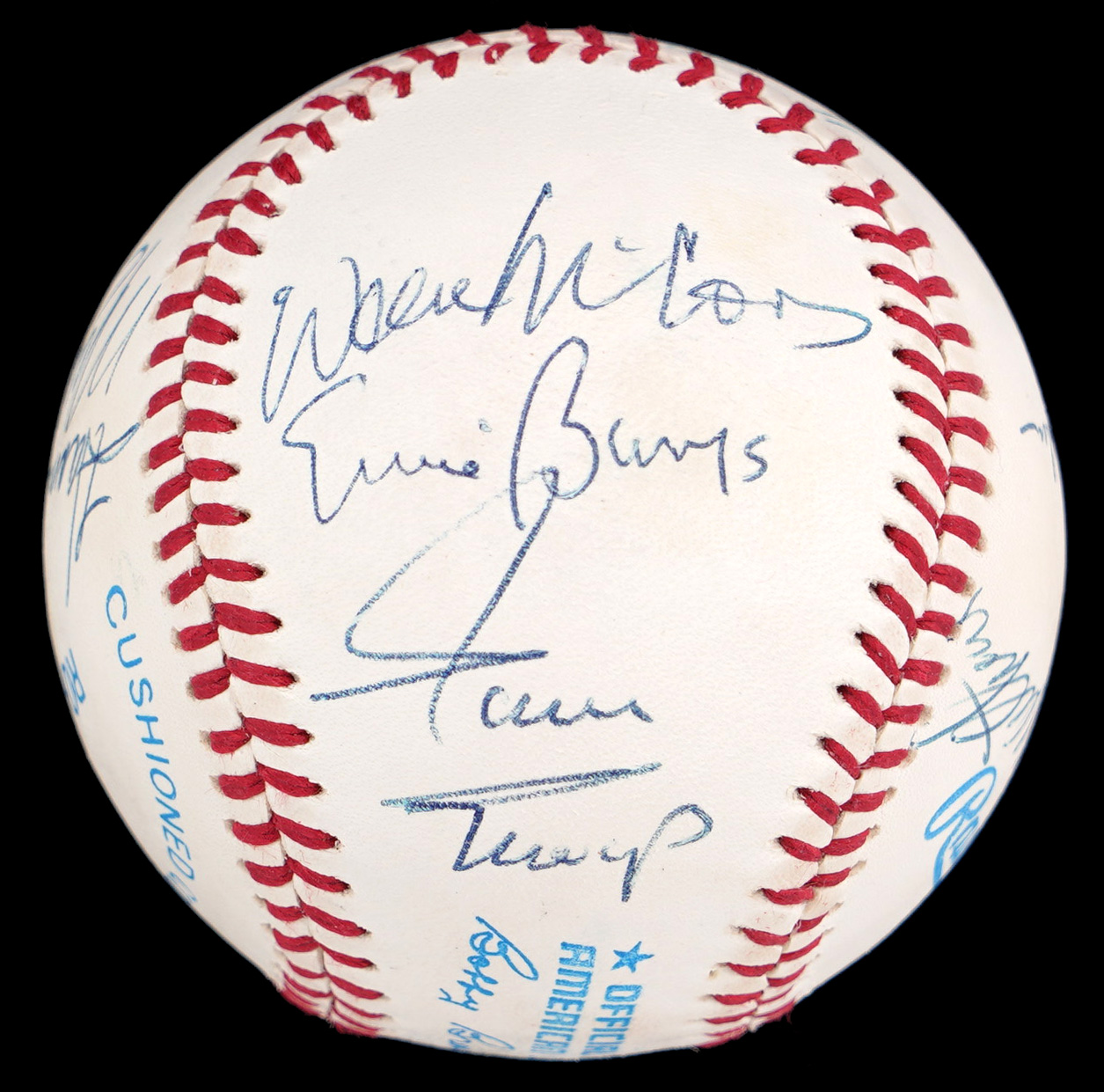 A dozen of baseball's greatest sluggers are collected, with this 500 Home Run Club multi-signed baseball. This handsome OAL/Brown ball boasts 12 signatures, averaging "8" to "9" strength, including the welcome presence of Eddie Murray, and sweet spot occupation by Mickey Mantle and Ted Williams.