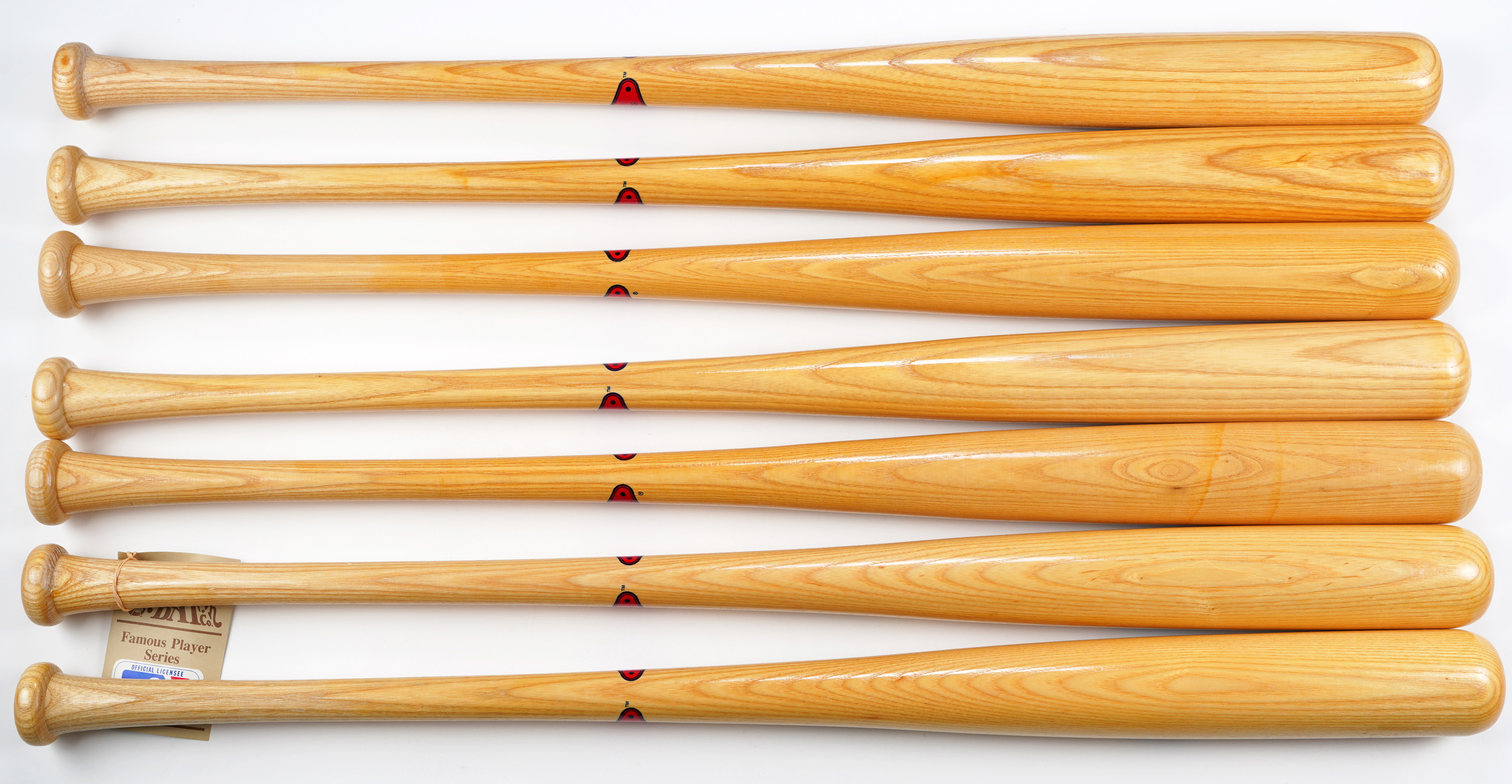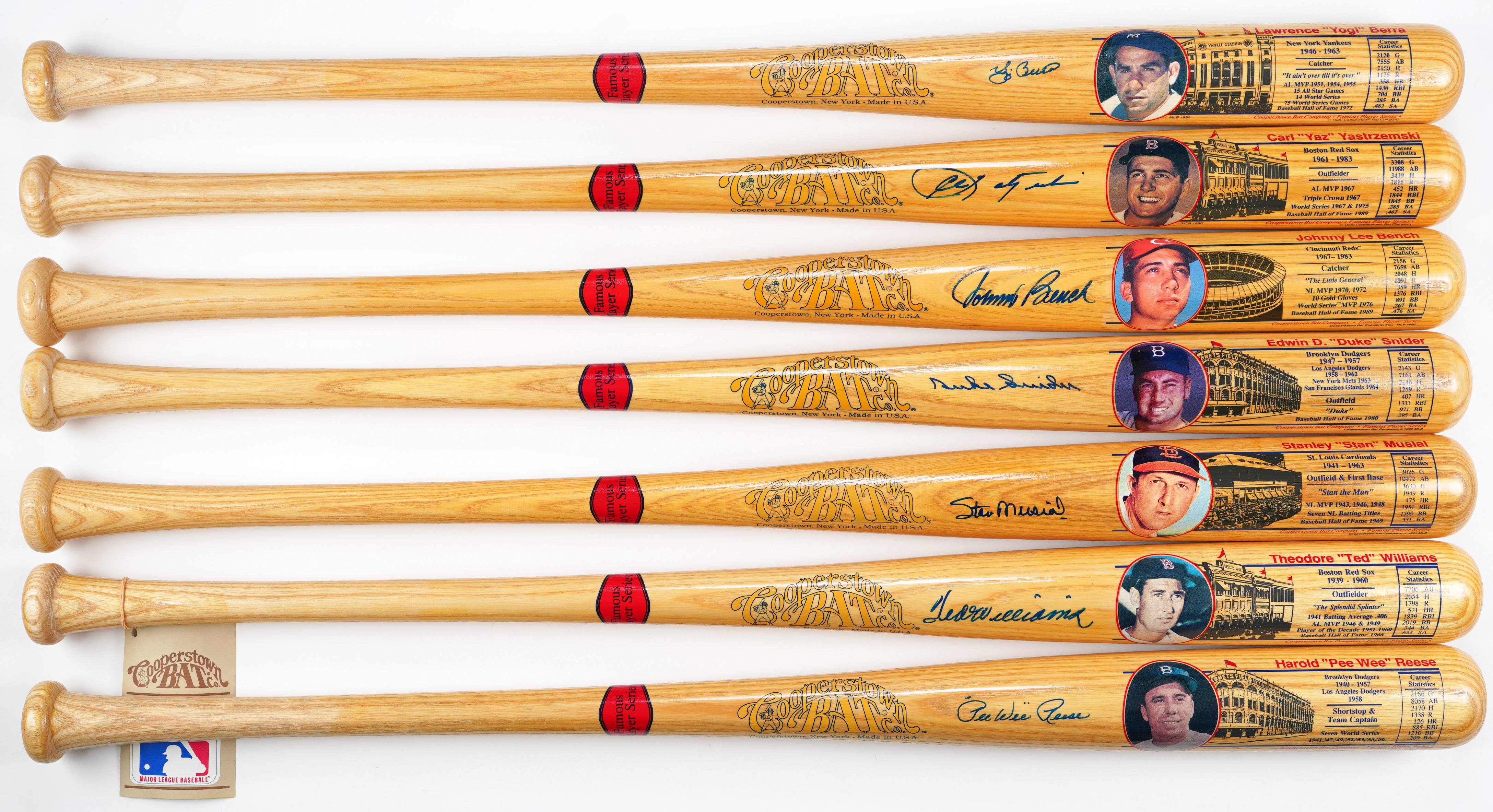 Dress up your collection with these seven spiffy Hall of Famer single-signed bats. Made by the Cooperstown Bat Co., these handsome bats are labeled Famous Player Series in red cigar-style bands, located on the upper handles. The barrels are decorated with oval portrait photographs, accompanied by career highlights and statistics. Bold blue felt-tip pen signatures average “9” to “10” potency, and the commemorative lumber is like-new. Featured are: Ted Williams, Stan Musial, “Pee Wee” Reese, “Yogi” Berra, “Duke” Snider, Carl Yastrzemski, and Johnny Bench.