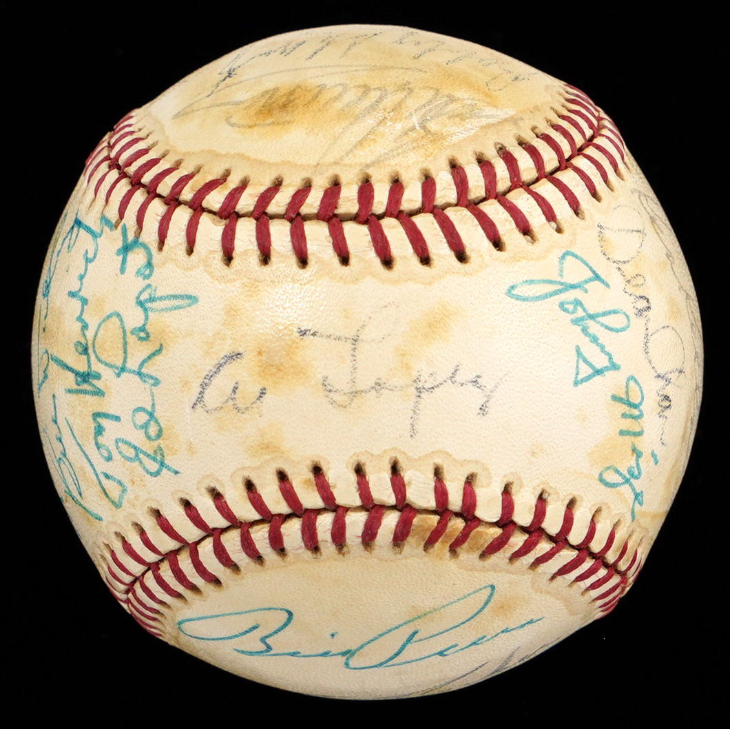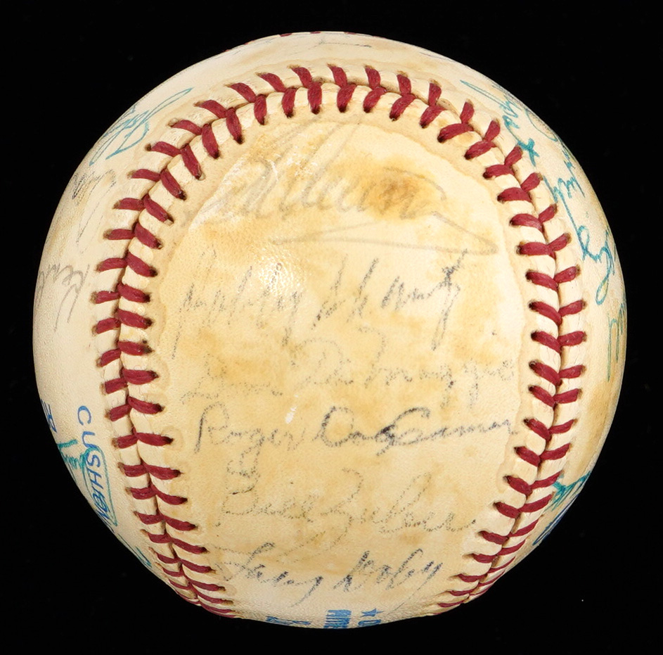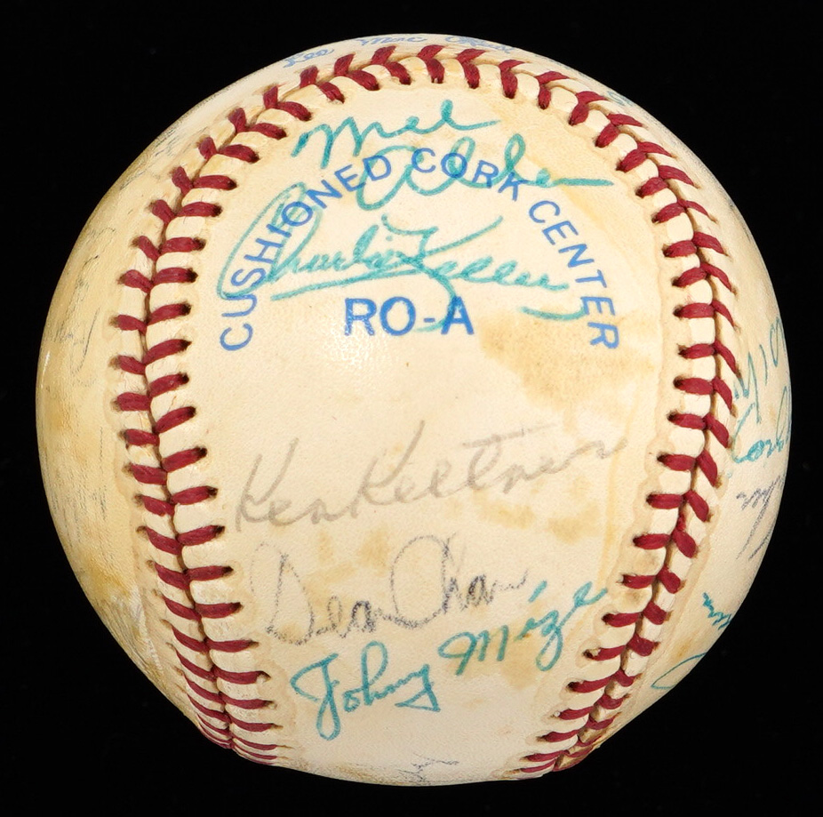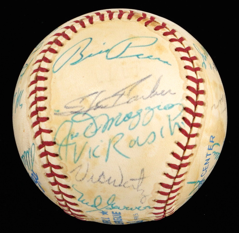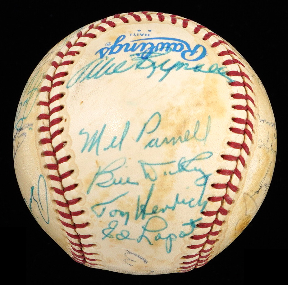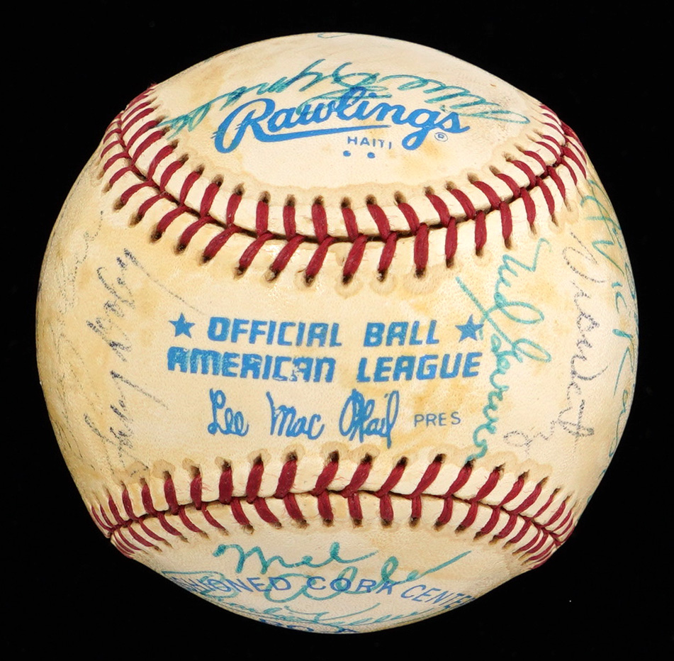 American League alumni are collected, with this Hall of Fame and star player multi-signed OAL/MacPhail baseball. With more than half of the signers having suited up in New York Yankees pinstripes at some point during their active playing careers, it's possible this ball was signed at a Yankees Old Timers Day event in the late-1970s, or early-1980s. The signatures on the south, east and west panels of this ball remain fairly distinct, while those on the north panel are faded, yet readily discernible. Fortunately, the highlight signatures of Joe DiMaggio, Bill Dickey, Mel Allen, and Johnny Mize are among the most distinct examples.