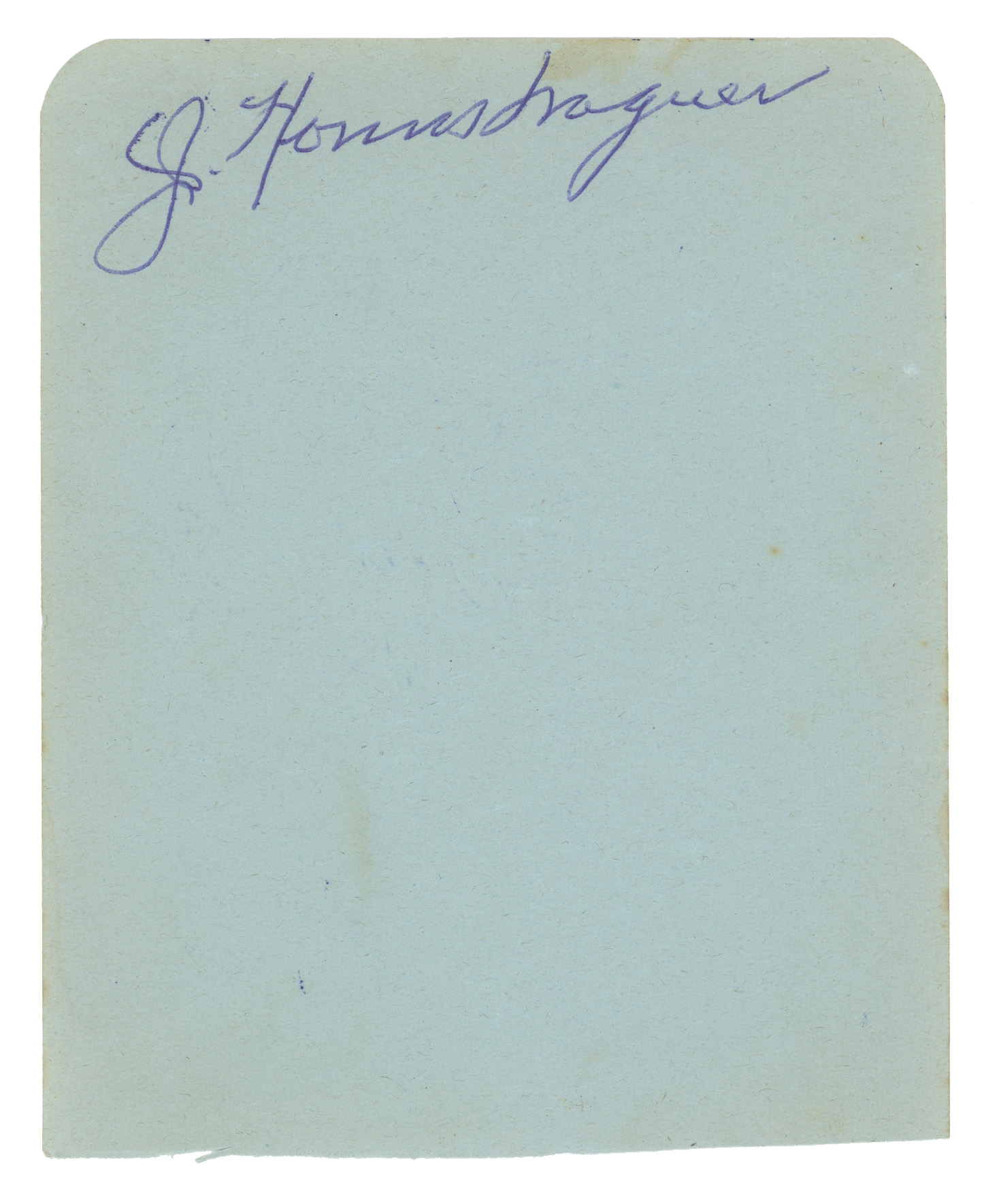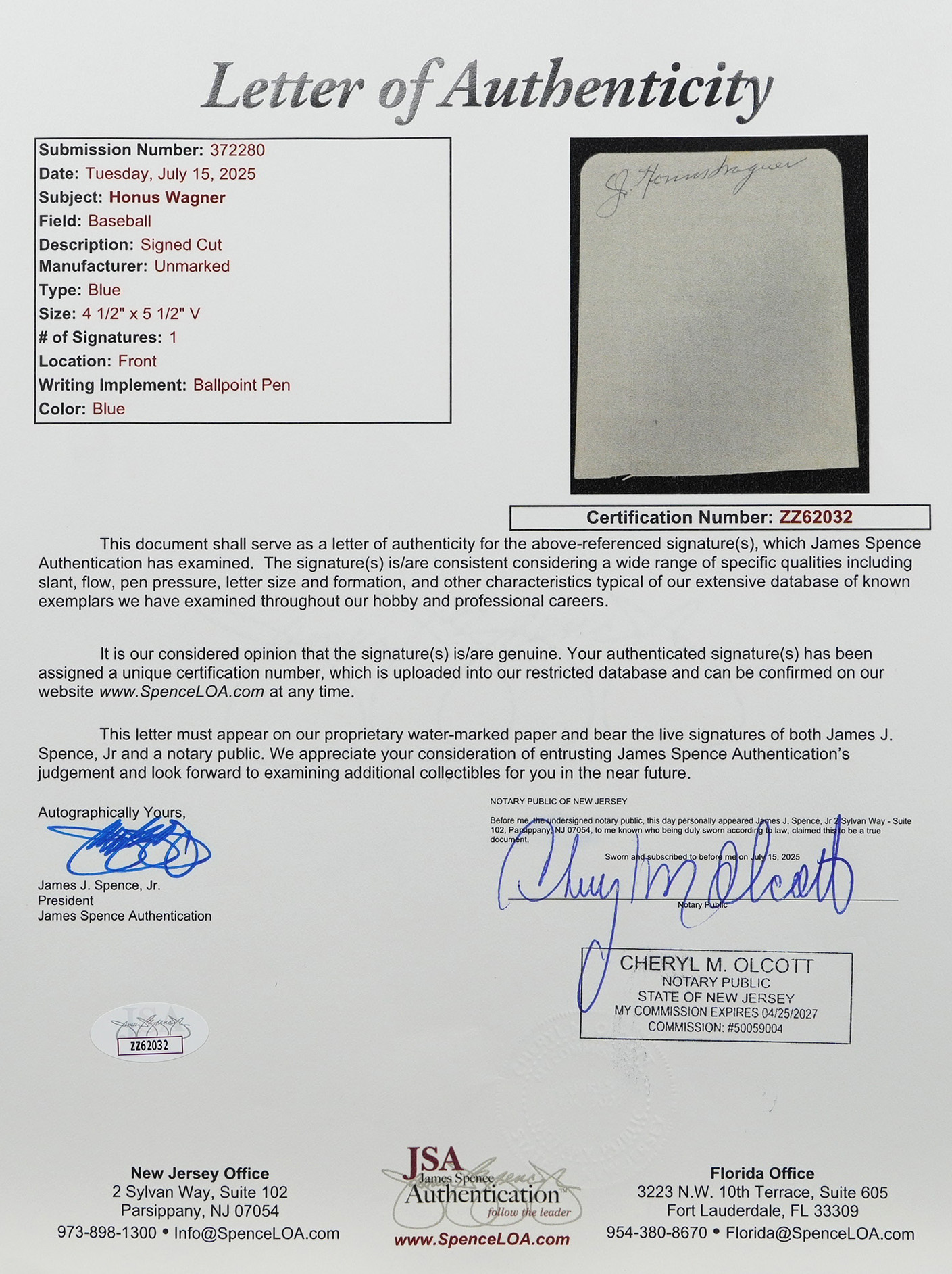 Cross a big name off your Hall of Fame autograph collection want list when you acquire this Honus Wagner signed album page. A five-tool superstar who played his entire career during the dead ball era, "the Flying Dutchman" is considered by many baseball historians to be the greatest shortstop ever. Wagner has signed this 5-1/2" x 4-1/2" page at the right end, leaving plenty of room for others to add their autographs, in an indication of his humble nature. Applied as J. Honus Wagner, this highly desirable Wagner signature merits an "8.5" strength rating.