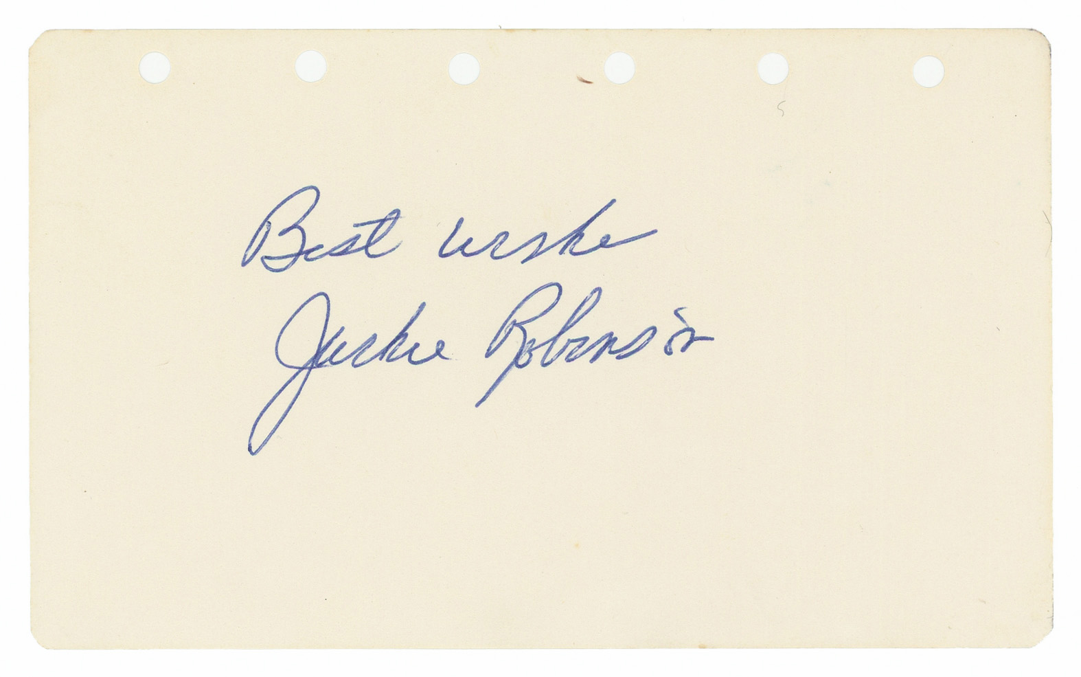 Historic game-changer Jackie Robinson takes center stage with this single-signed album page. When he broke the color barrier in 1947 with grace and dignity in the face of taunts, threats and harassment, Robinson became one of the most influential figures in baseball, and in American society as well. Accompanied by the salutation "Best Wishes," this Robinson signature is an "8.5" strength example, showing off boldly against the crisp, clean 5" x 3" page.