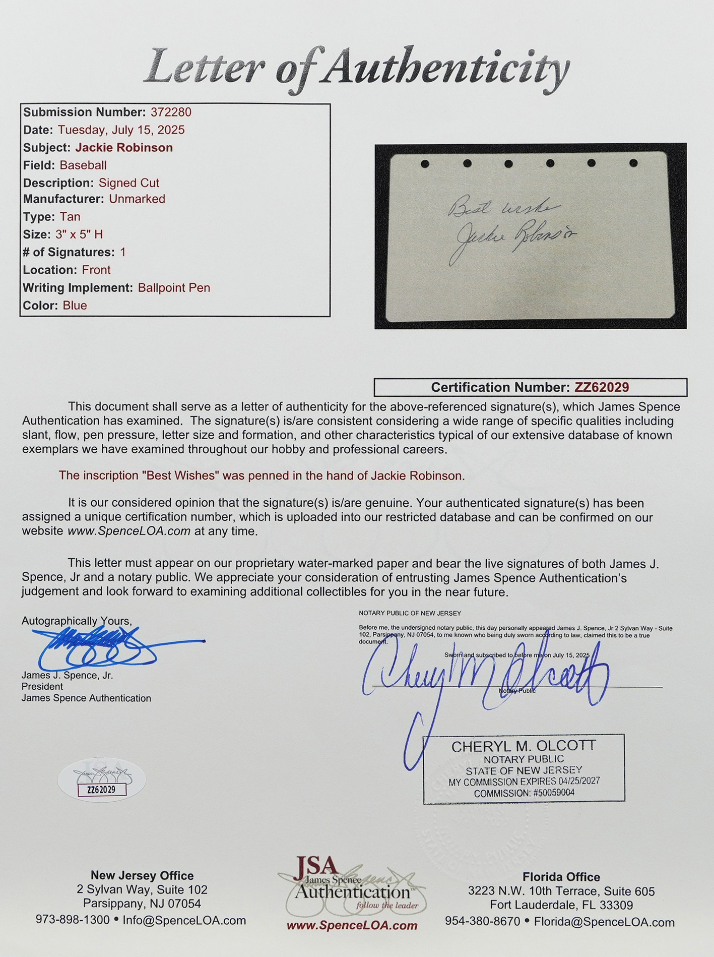 Full LOA from James Spence/JSA.