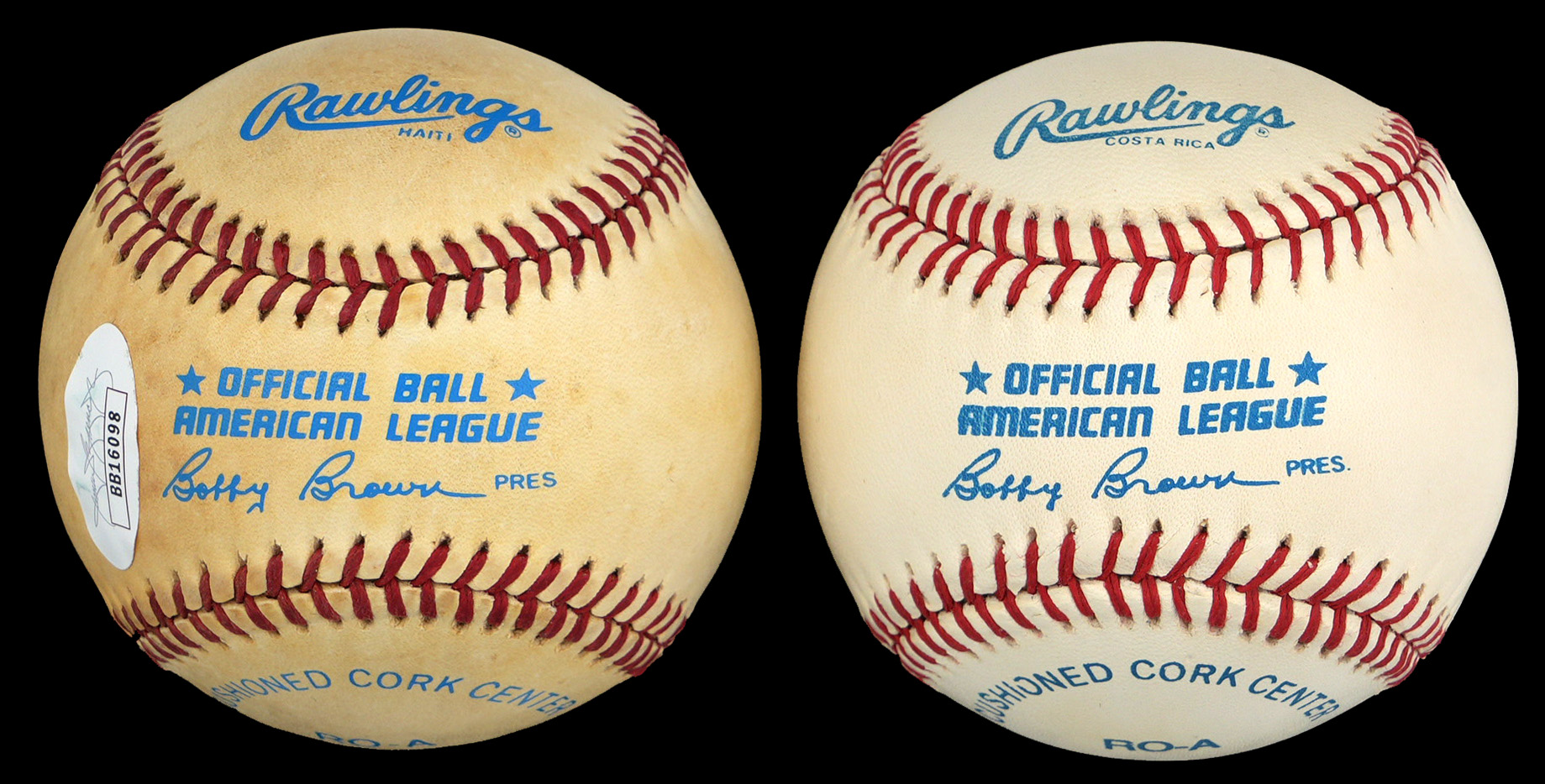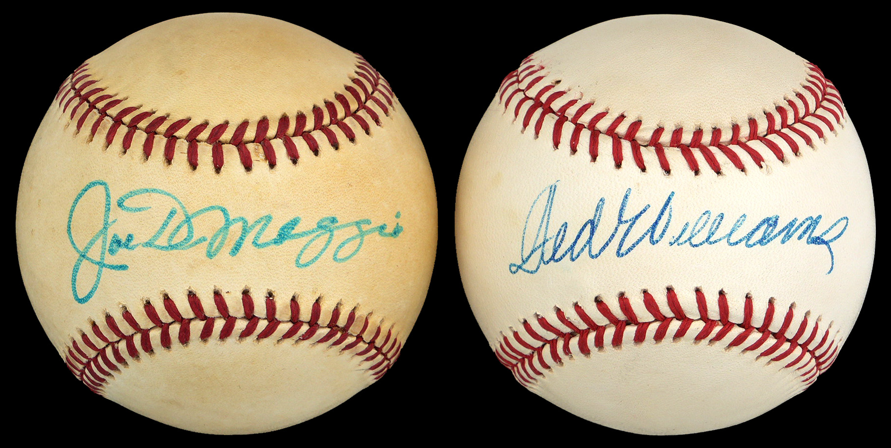 Possibly the two greatest players of their time, Joe DiMaggio and Ted Williams have teamed up to each sign one of these OAL/Bobby Brown baseballs with large (“8-9”) signatures. The DiMaggio signed ball is creamy toned, while Ted Williams has signed a nice white example.
