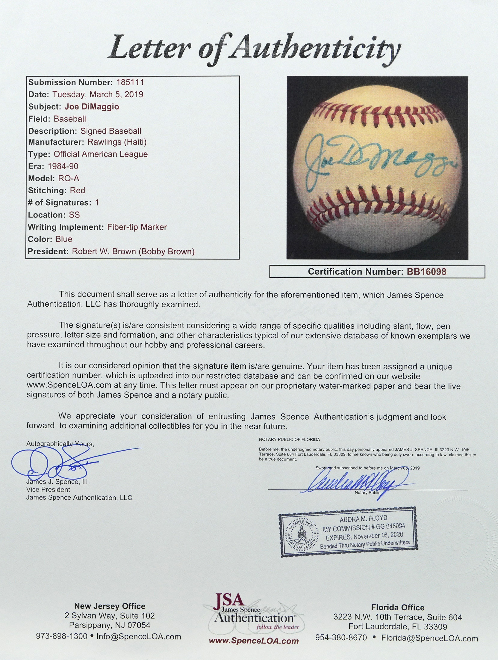 Full LOA from James Spence/JSA for Joe DiMaggio.