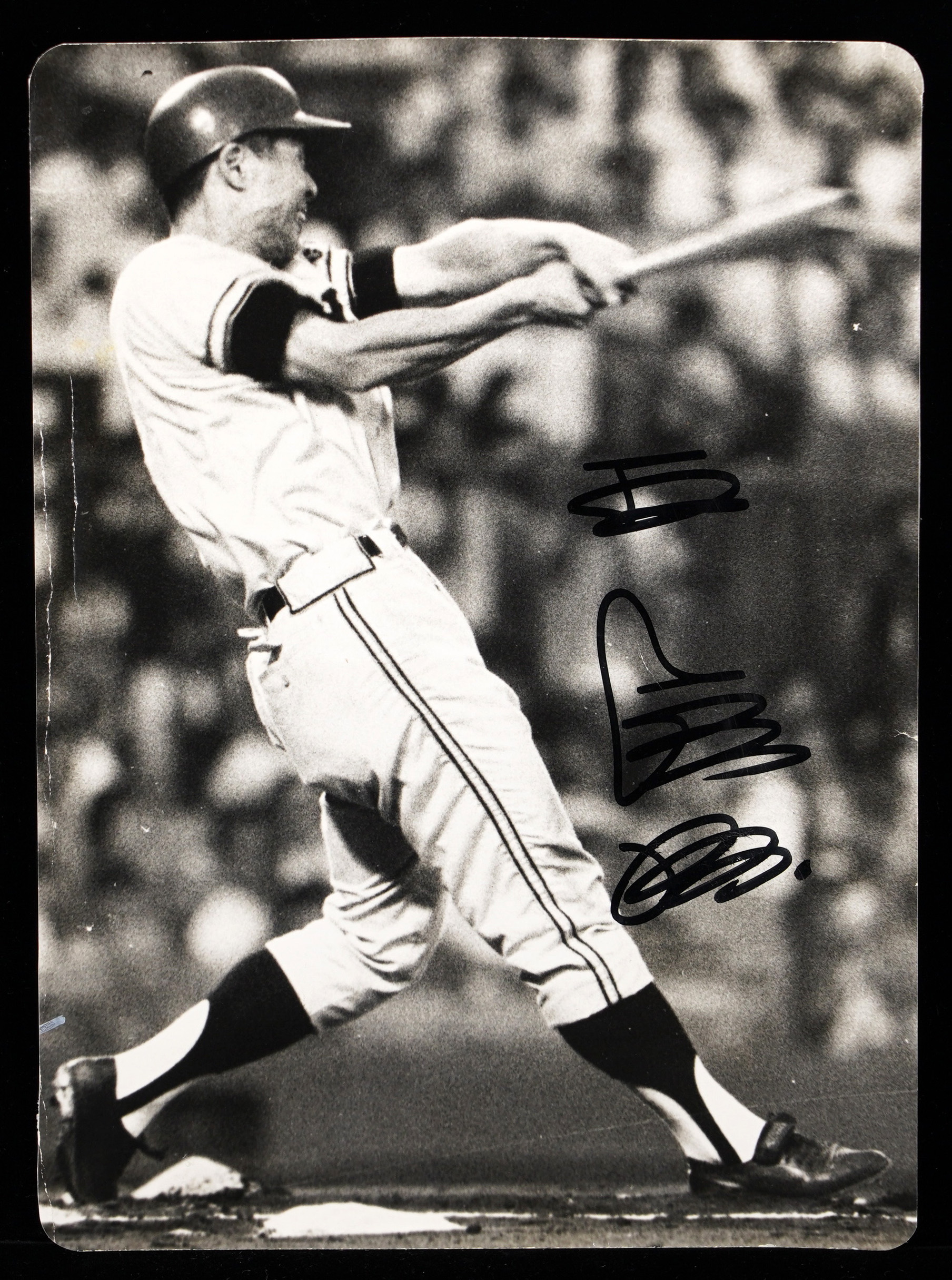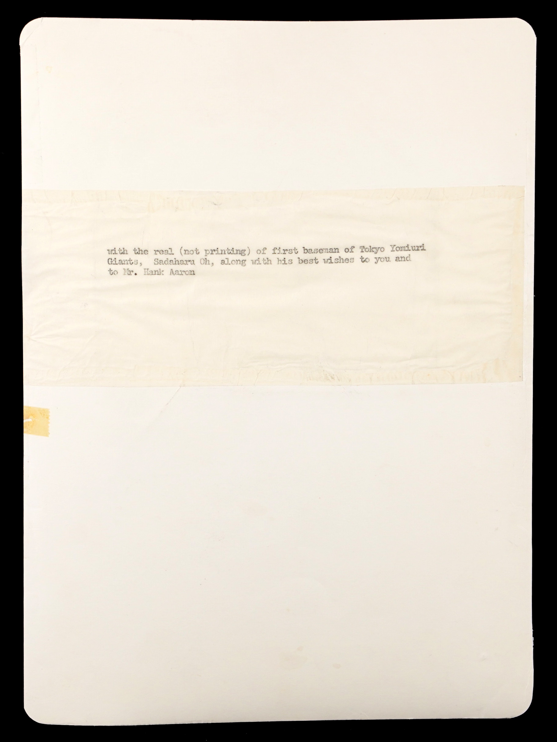 Japanese home run king Sadaharu Oh is captured in action, with this black and white batting photograph. Formatted with rounded corners, this 8-3/8" x 11-3/4" photograph freezes Oh's swing just after the point of contact, making for a truly dynamic scene. Oh has signed in Japanese vertical fashion at right, and his bold scripting is as dynamic as his swing. The back features a typed notation indicating that this signed photograph was gifted to Hank Aaron by Sadaharu Oh. Though moderate wear is noted, including several creases, this vintage photograph remains appealing, and suitable for framing.