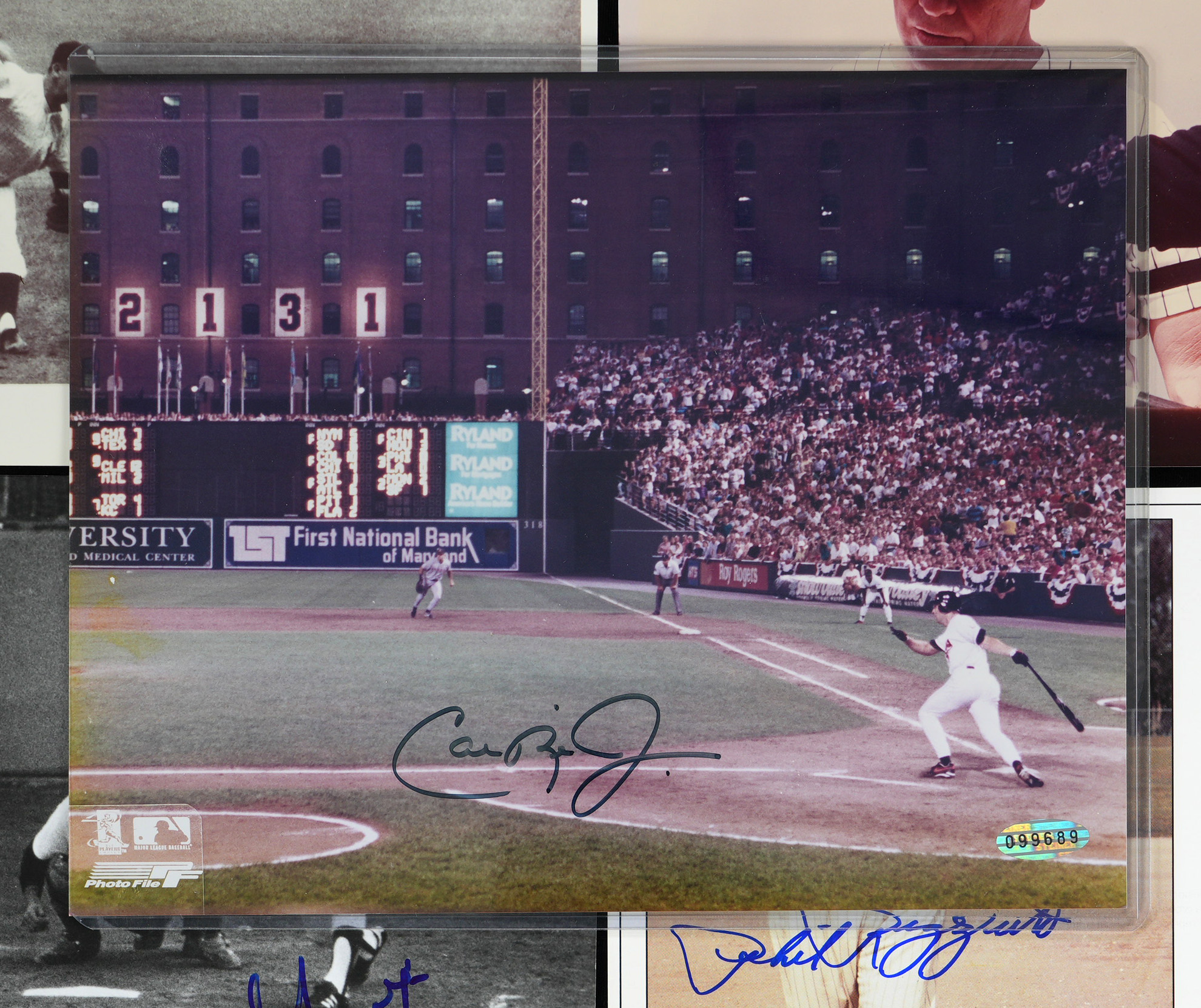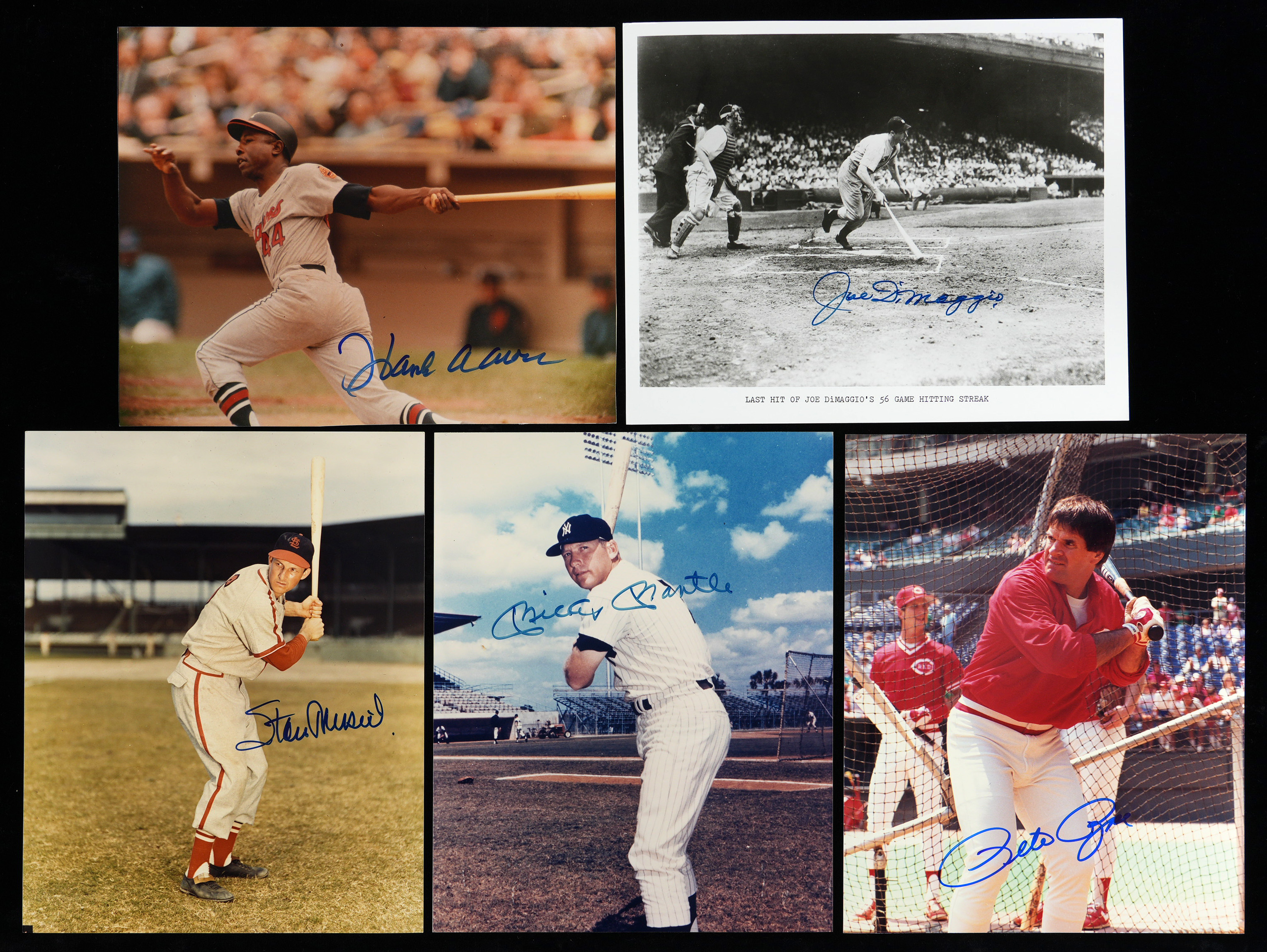 Hank Aaron, Mickey Mantle, Stan Musial, Reggie Jackson, Whitey Ford, Yogi Berra, Pete Rose, Eddie Mathews, Hank Bauer, Johnny Blanchard, Clete Boyer (“#6 W.S. Champs 1961”), Jim Coates, Ryne Duren, Bobby Richardson, Moose Skowron (“To John Best Wishes”), Gil McDougald, Brooks Robinson (“To John” on HOF Induction photo).