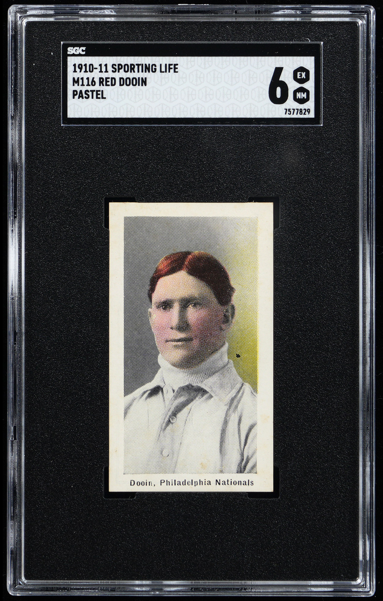 Graded EX/NM 6 by SGC. Philadelphia Phillies catcher Charles (Red) Dooin pastel background version. Part of a larger 1910-1911 M116 Sporting Life near set break available throughout this auction.