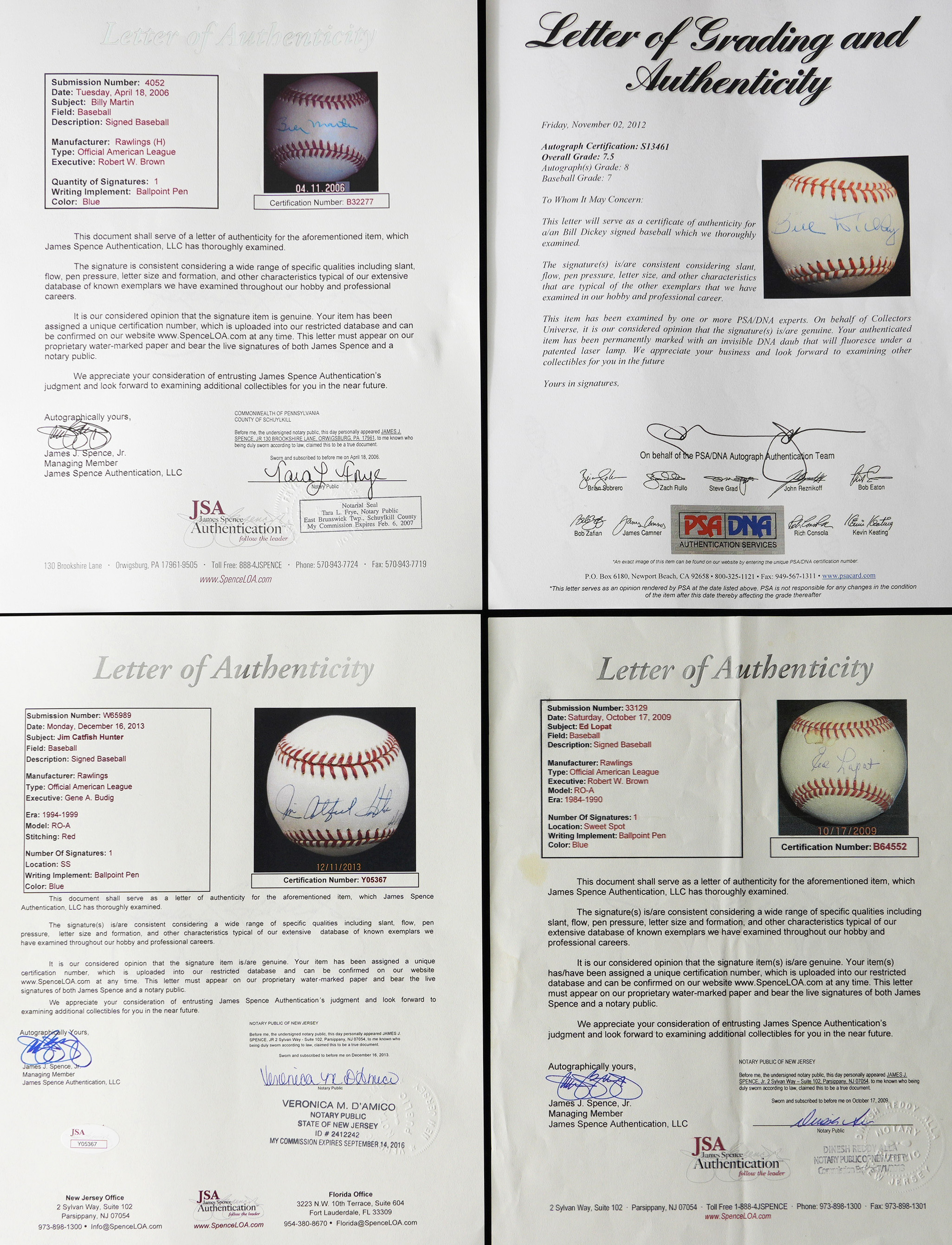 Jim Catfish Hunter single-signed white OAL/Budig ball with “8-9” ballpoint signature 8-9 and inscription “HOF 87.” Comes with Full Letter of Authenticity from James Spence/JSA.