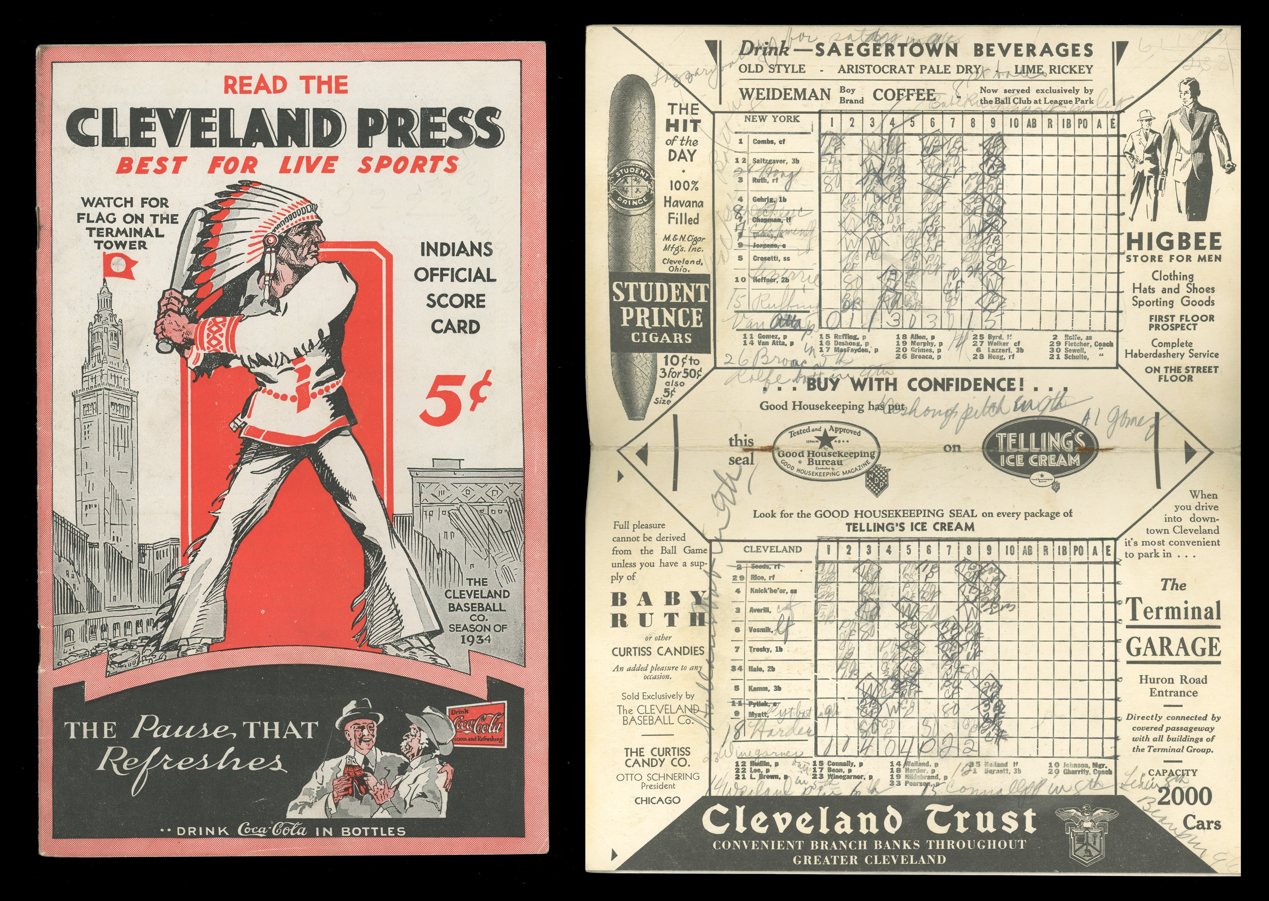 July 18th, 1934, saw an epic battle between the visiting New York Yankees and the home Cleveland Indians, with the Indians outlasting the Yankees, 15-14. Babe Ruth was in the lineup and contributed a one for two before he was replaced. Lou Gehrig batted six times with three hits, including a triple. “The Cleveland Baseball Co. Season of 1934” scorecards consisted of two paper pages surrounding a folding cardboard scorecard. This scorecard (VG-EX) retains some whiteness outside while the inside cardboard scorecard has been scored extensively, so much so that it's difficult to decipher. It comes with a print-out from Baseball Reference with the complete details of the game.