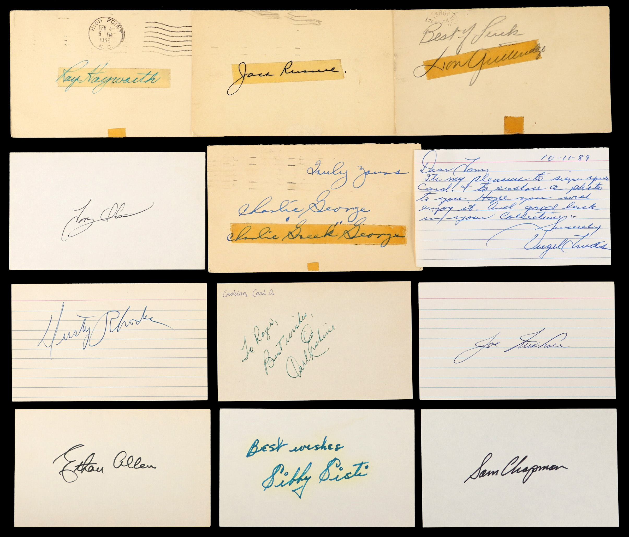 Both the index cards and postcards average Very Good to Excellent condition with some better and some lesser. Most of the signatures grade “7 to 10”.