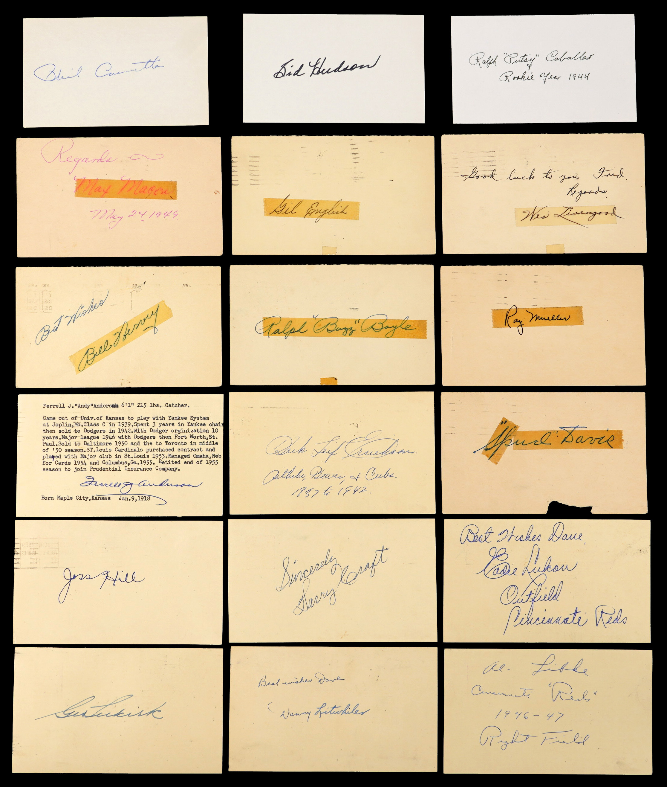 Highlights of the three postcard categories include: Charlie George, Ray Hayworth, Jack Russell, Don Gutteridge, Bert Haas, Jimmy Outlaw, Hugh Alexander, “Spud” Davis, Ralph “Buzz” Boyle, Ray Mueller, Gil English, Clint Hartung, Walter Masterson, “Putsy” Caballero, Phil Cavaretta, Sid Hudson, Luke Sewell, John Van Kuyk, Al Brancato, Geo. Selkirk, Jess Hill, Ferrell Anderson, Al Libke, Danny Litwhiler, Harry Kraft, Eric Tipton, Eddie Lake, Tony Freitas, Lonnie Frey, Clyde Volmer, Eddie Pellagrini, Woody Williams, John Babich, Johnny Welaj, Don Long, “Sparky” Olsen, Clay Bryant, Dick Seibert, John Riddle.