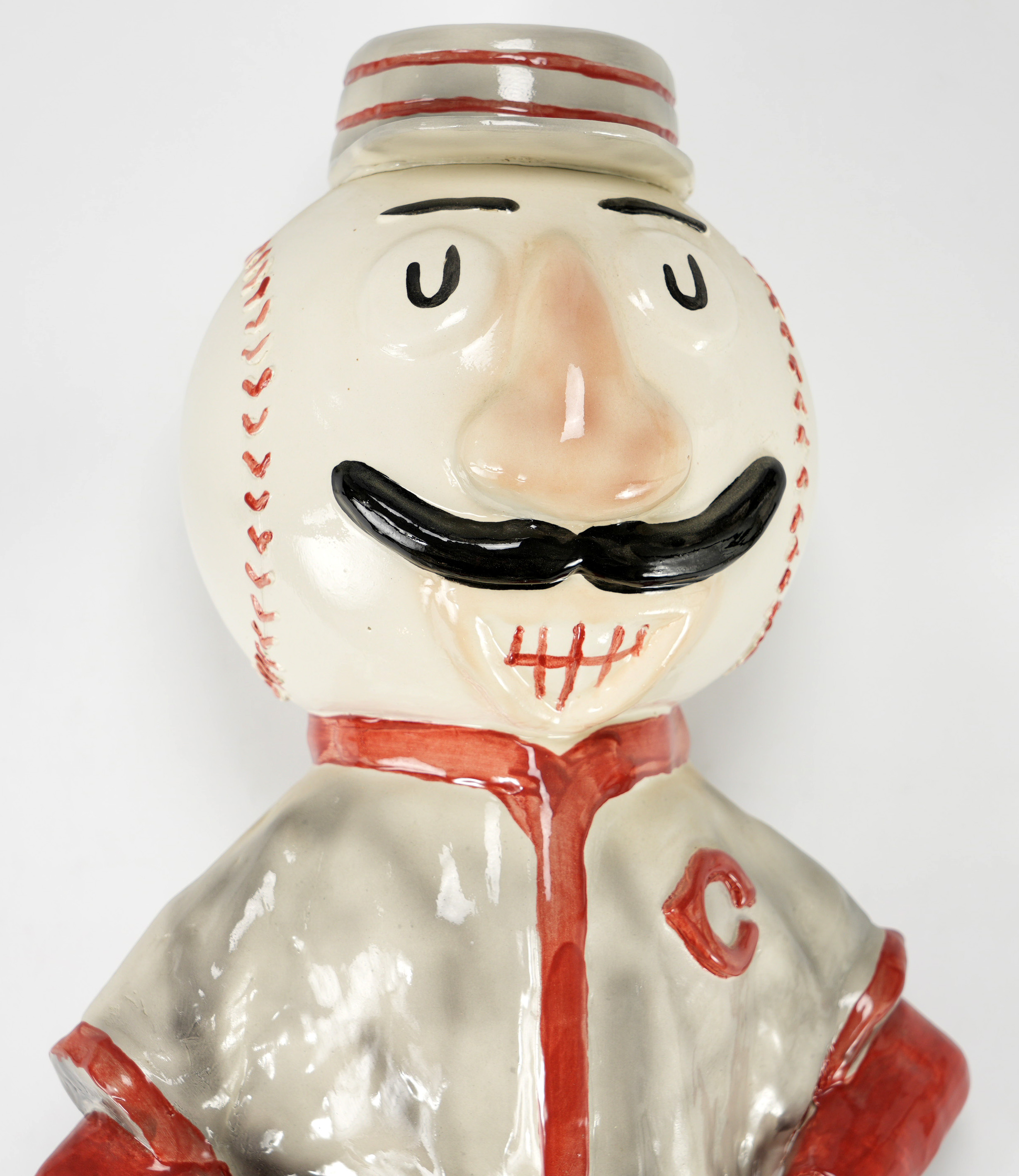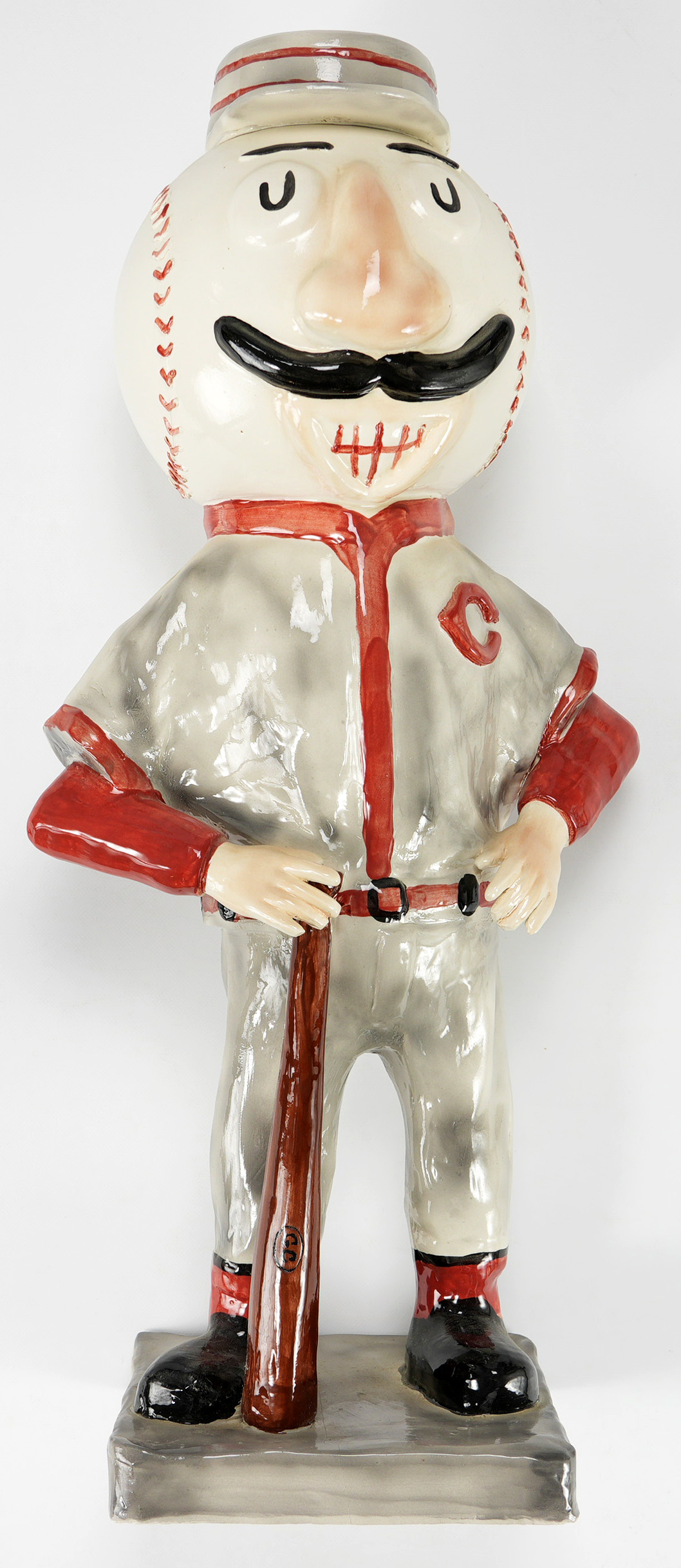 Supersize your sports figure collection with this 1950s Gibbs-Conner Cincinnati Reds Mr. Redlegs mascot statue. Standing 25” tall, this massive porcelain figure has a base footprint of 8” x 8”. The depiction is an old school mascot attired in an antique uniform type, topped off with a pillbox cap. Seen on the bat is a Gibbs-Conner “GC” logo, where a factory labeling brand would typically be located.