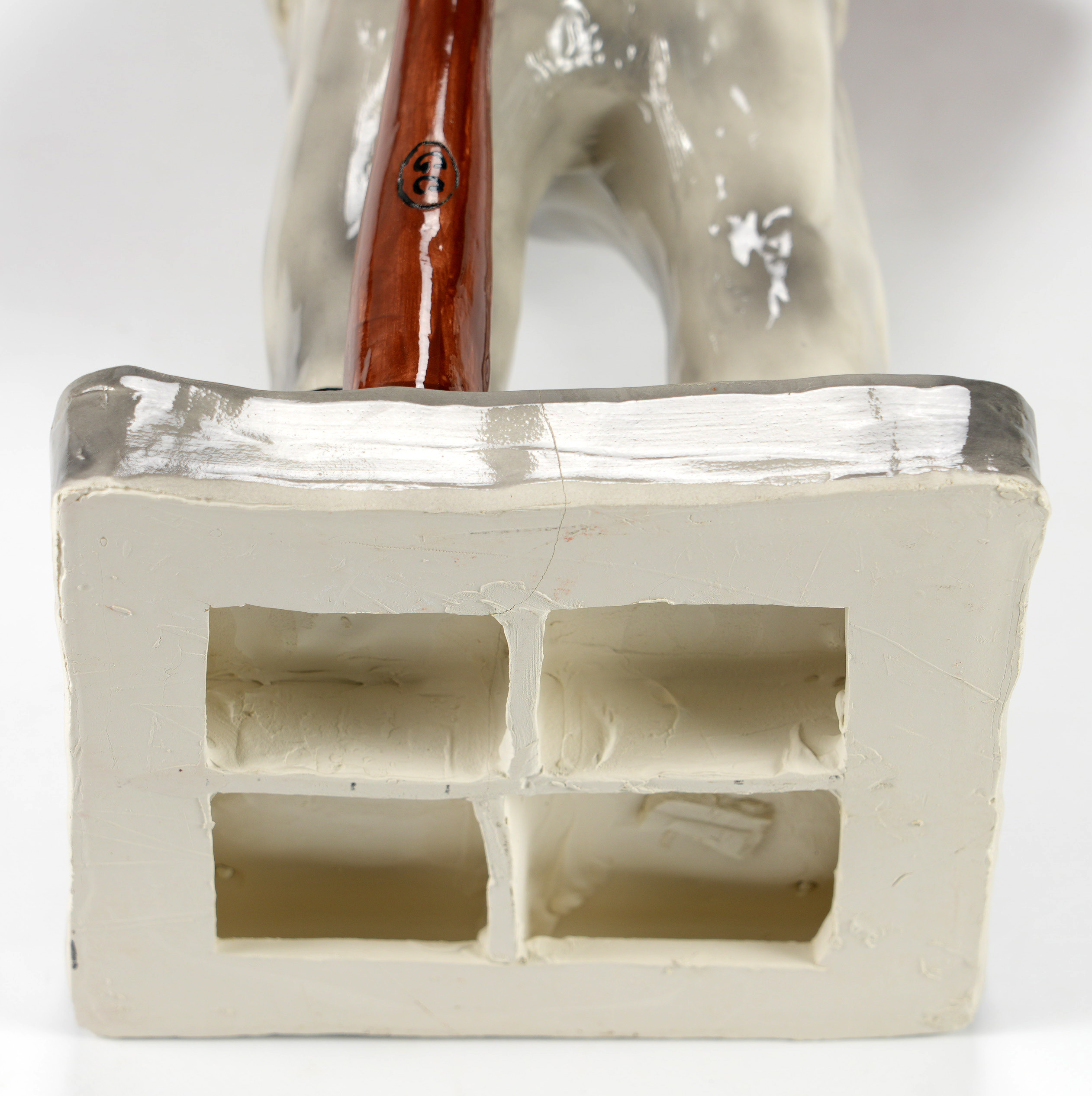Close examination reveals minor factory firing flaws of an unobtrusive nature, including a barely perceptible surface groove impression on top of the base. Consistent with the handful of examples we have examined over the years, this condition seems to be a regular occurrence with this giant-size statue type. The wet-look glaze and colors are strong and wear is minimal, with the only minor detraction being a hairline crack on the front of the base at center, which extends 1” up onto the top of the base, terminating at the point where it meets the groove impression.