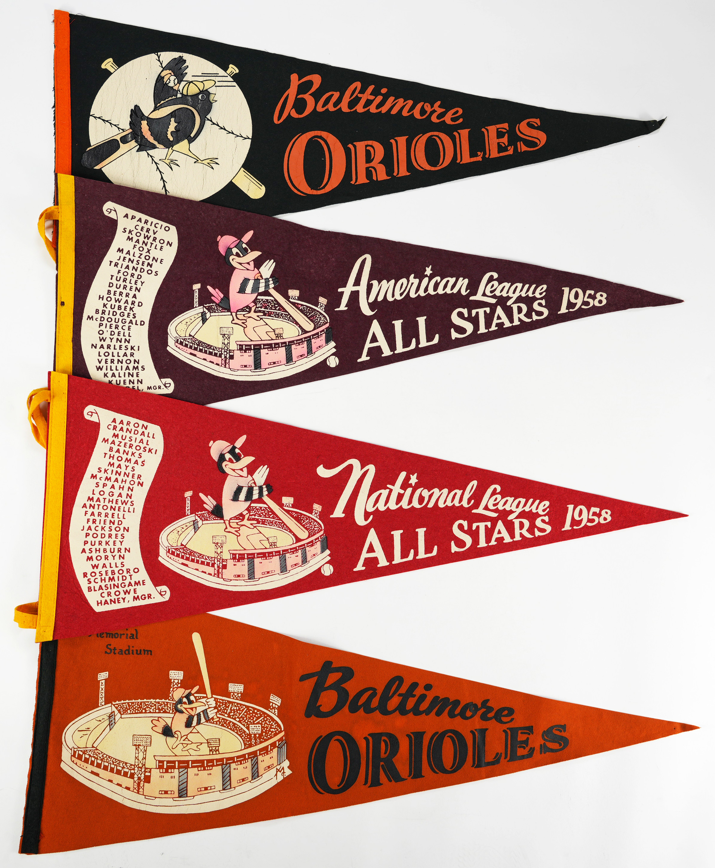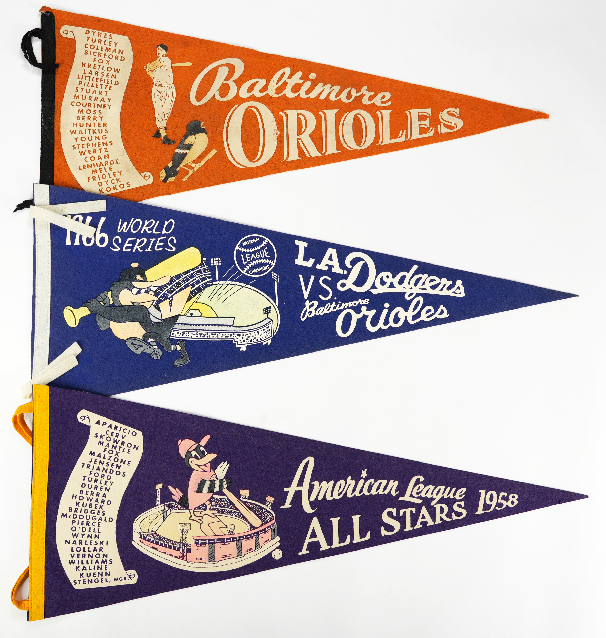 This collection of pennants from the 1950s and 1960s includes a 1954 inaugural “scroll” pennant from their first year, as well as a 1966 World Series pennant, when they became the last club from the eight AL charter franchises to win a World Series.