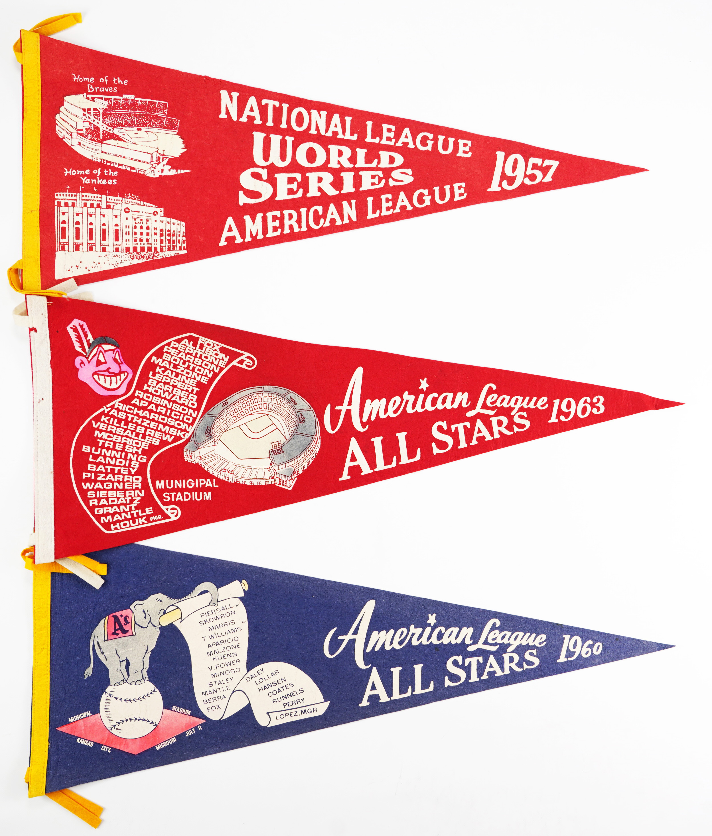 “American League All Stars 1960” pennant featuring the A's elephant standing on a baseball with “Municipal Stadium, Kansas City, MO, July 11” below. The elephant is revealing a scroll with the names of the AL All Stars such as Maris, T. Williams, Aparicio, Minoso, and Mantle. Very Good to Excellent condition.