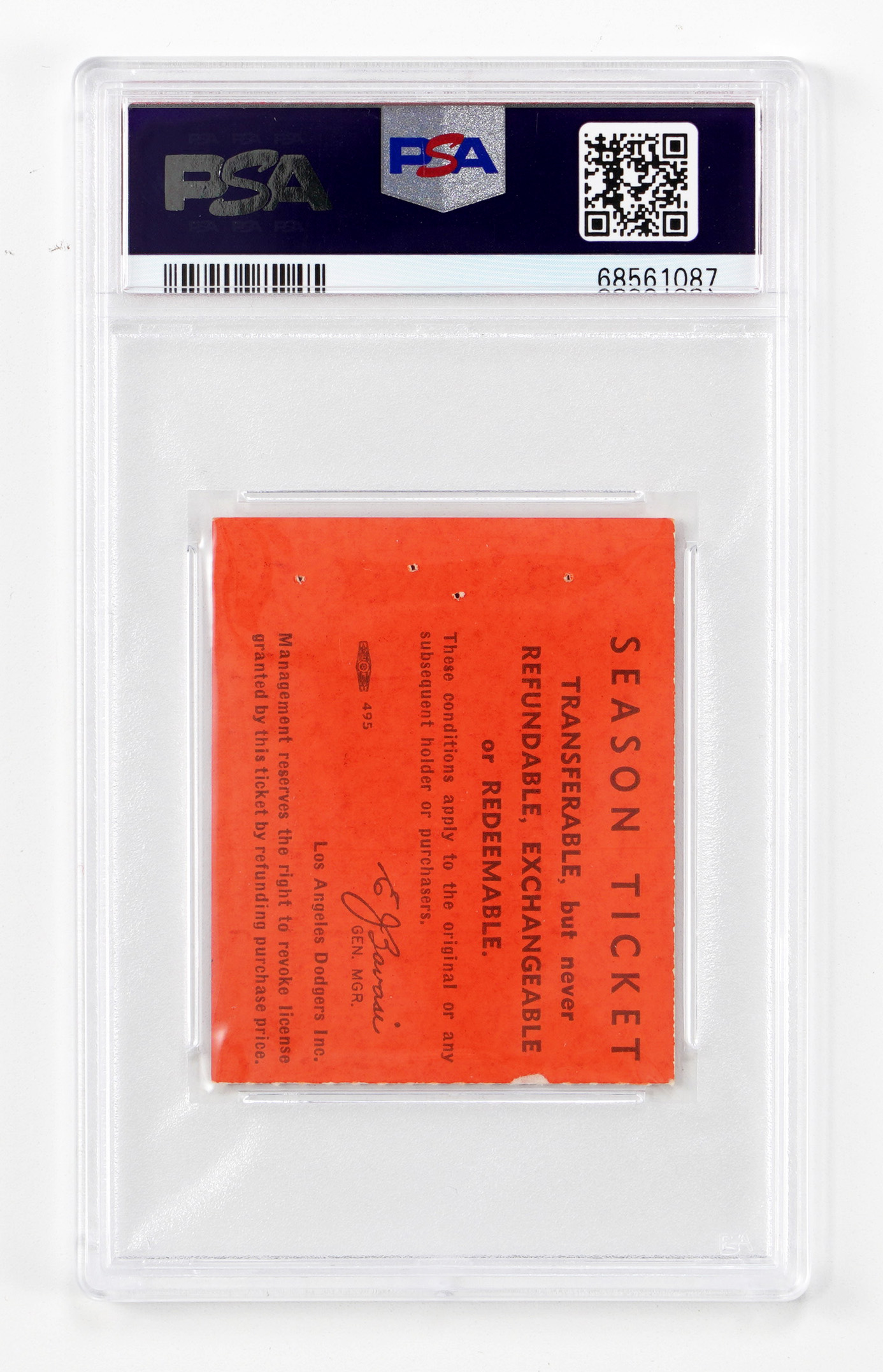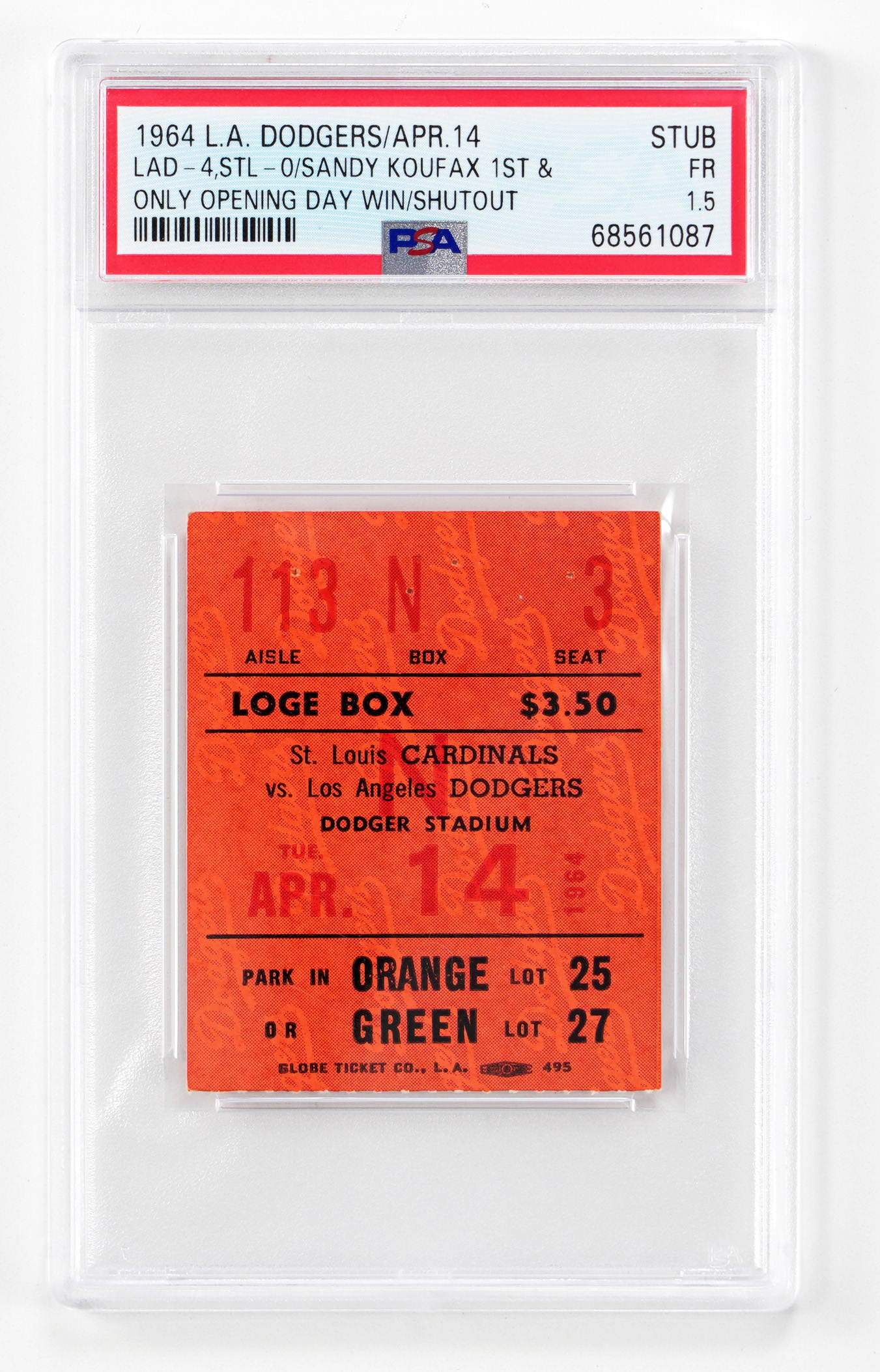 Surprisingly, Sandy Koufax made just a single opening day start, during his 12-year career with the Brooklyn/Los Angeles Dodgers. With that in mind, we’re not going very far out on a limb, in calling this 1964 Los Angeles Dodgers opening day ticket stub a great find. This game took place at Dodgers Stadium on 4/14/64, with the Dodgers facing the St. Louis Cardinals. Koufax started the first, last and only season opener of his career that day, and went the full nine innings, striking out five, and walking none, while scattering six hits, to earn a 4-0 complete game, shutout win. On offense, big Frank Howard went 2/4, with a 2-run homer. PSA has encapsulated this prize stub, with a grade of (FR 1.5), making it “1 of 1” at this level, with just 1 rated higher.