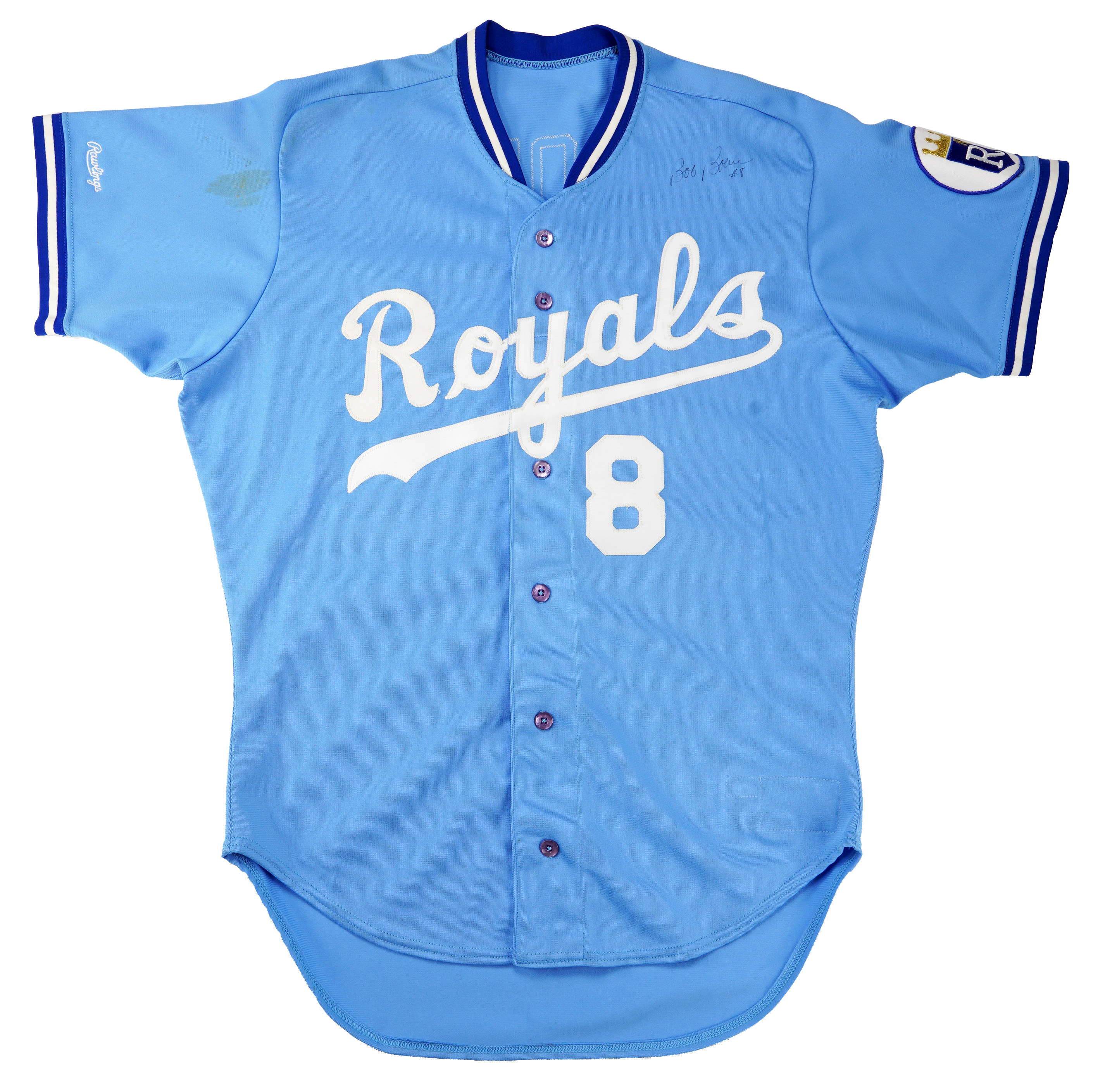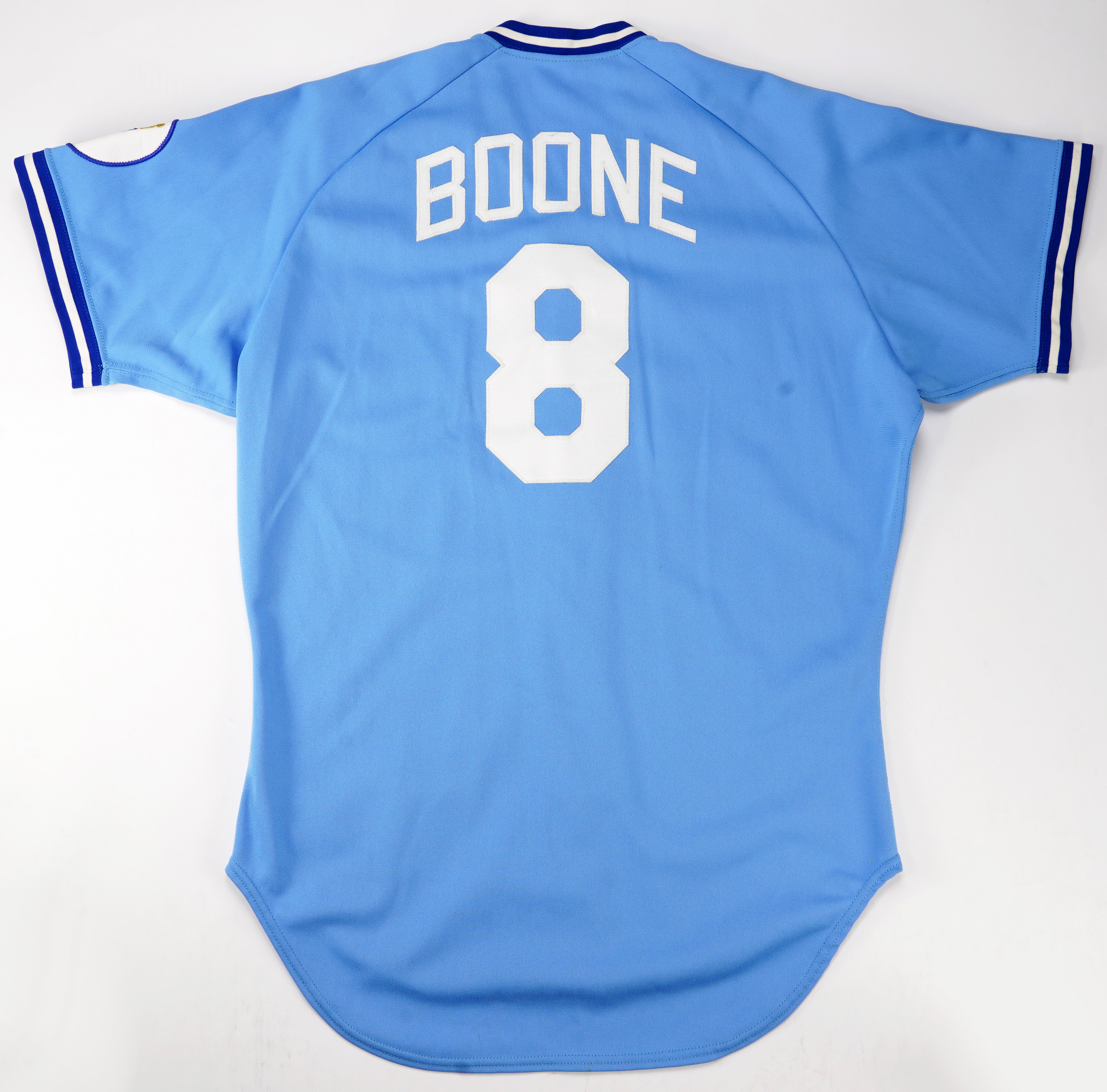 The left front shoulder is signed by 7-time Gold Glove catcher, Bob Boone (“7-8”), and comes with a JSA Sticker and Basic Cert for the signature.