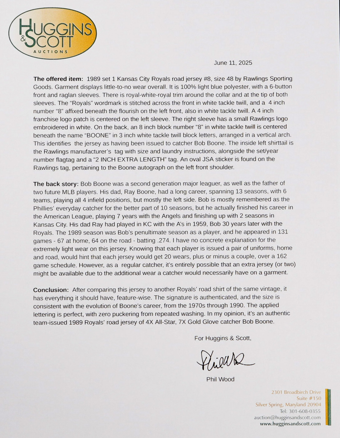 Baseball was a family affair for three generations of the Boone family. Bob Boone's father, Ray Boone, had a long career and Bob's two sons also played in the majors. “Booney” is remembered as the Phillies everyday catcher for the better part of 10 seasons, but he actually finished his career with Kansas City, the same team his father had played with 30 years earlier. This 1989 set one Kansas City Royals Road jersey, #8 size 48 by Rawlings, is an authentic jersey from the 4-time All-Star, and it comes with a detailed LOA from Phil Wood.