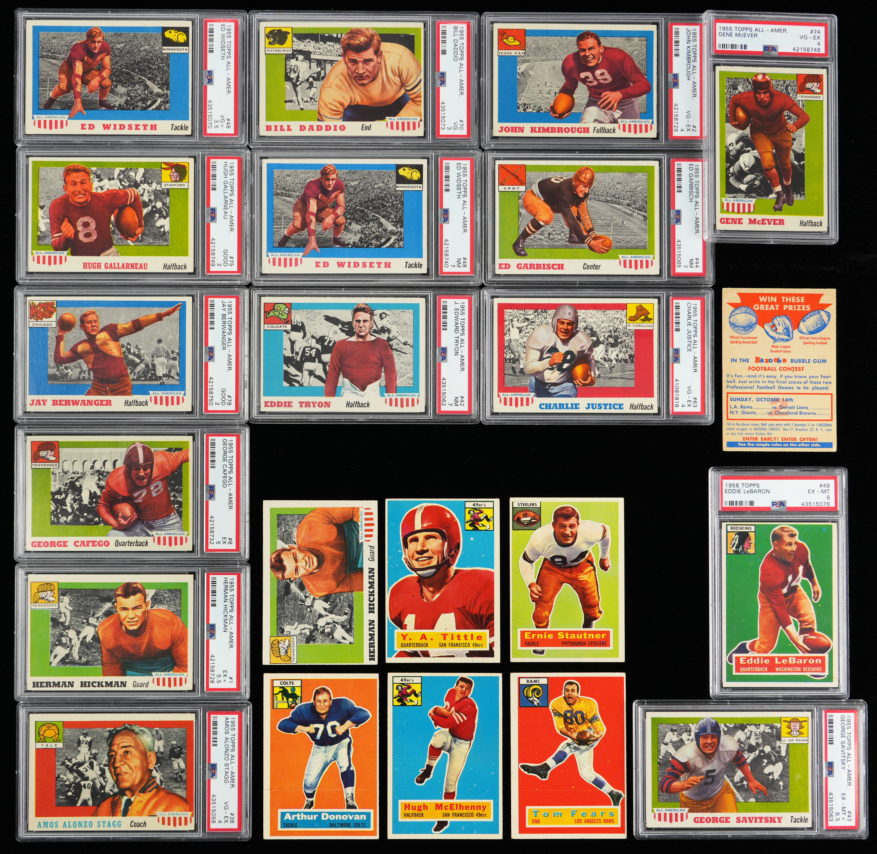 1955 Topps All-American Football: (33 cards, ungraded average VG-EX to EX, includes 14 PSA graded) with (2) #1 Hickman RC (one PSA EX+ 5.5, one VG), #38 Stagg RC (PSA VG-EX 4); PSA NM 7 Commons: (3 cards) with #42, 44, 48; PSA EX-MT+ 6.5: #43; PSA EX 5: #8; PSA VG-EX 4 Commons: (3 cards) with #2, 63, 74; PSA VG+ 3.5: #48; PSA VG 3 Common: #70; PSA GOOD 2 Commons: (2 cards) with #75, 78;