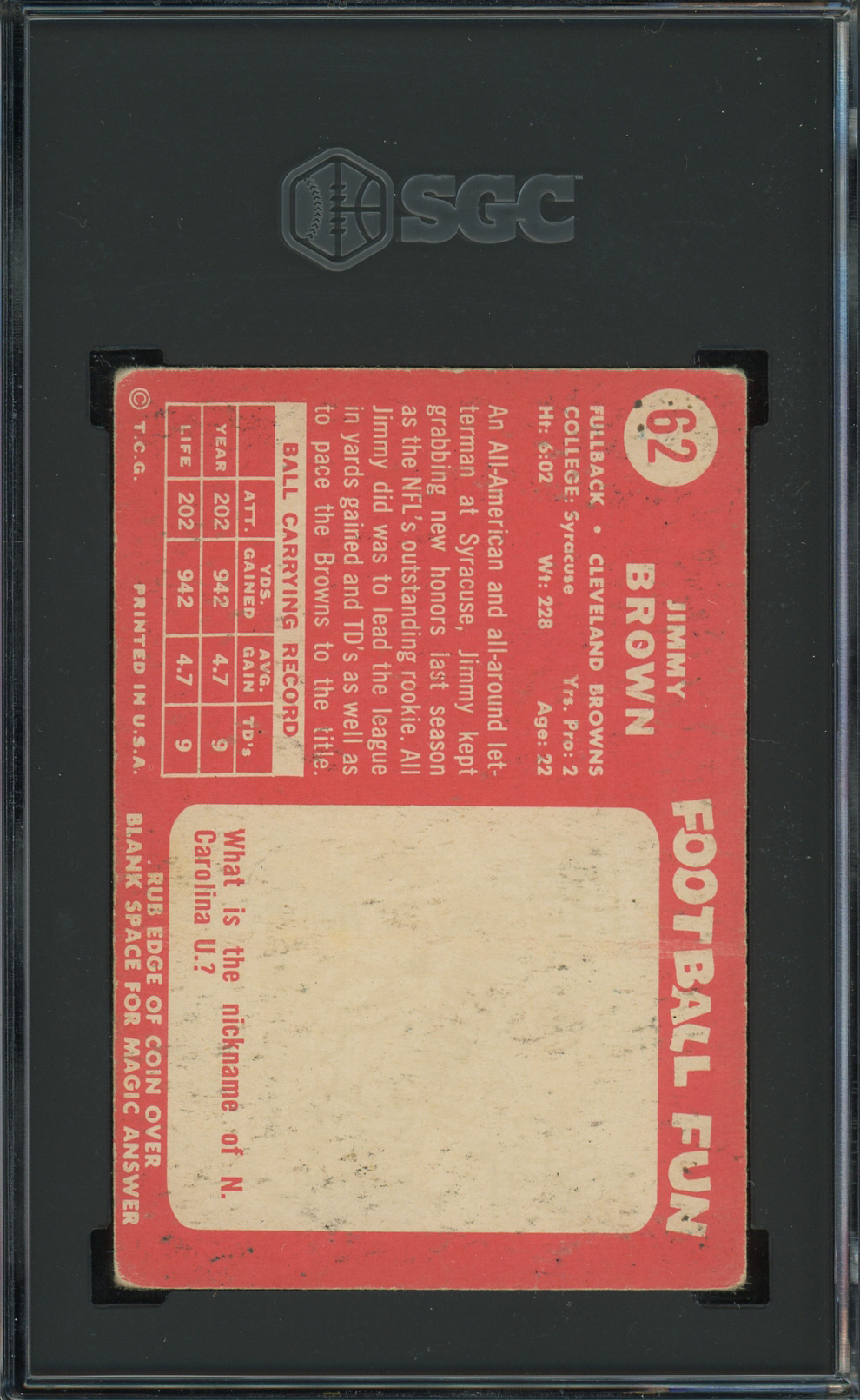 Graded VG 3 by SGC. The rookie card of Cleveland Browns Hall of Famer Jim Brown.