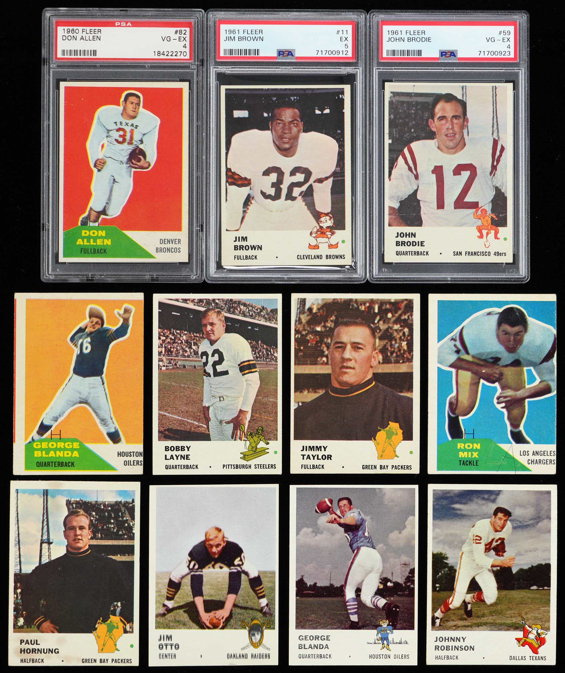 1961 Fleer near: (192/220, average VG to EX, includes 2 PSA graded) with #11 J. Brown (PSA EX 5), #59 Brodie RC (PSA VG-EX 4), #89 J. Taylor (EX), #90 Hornung (GD, stained), #117 Layne (EX), #166 Blanda (Authentic, appears sheet cut), #197 Otto RC (Authentic, appear sheet cut), #202 J. Robinson RC (EX)