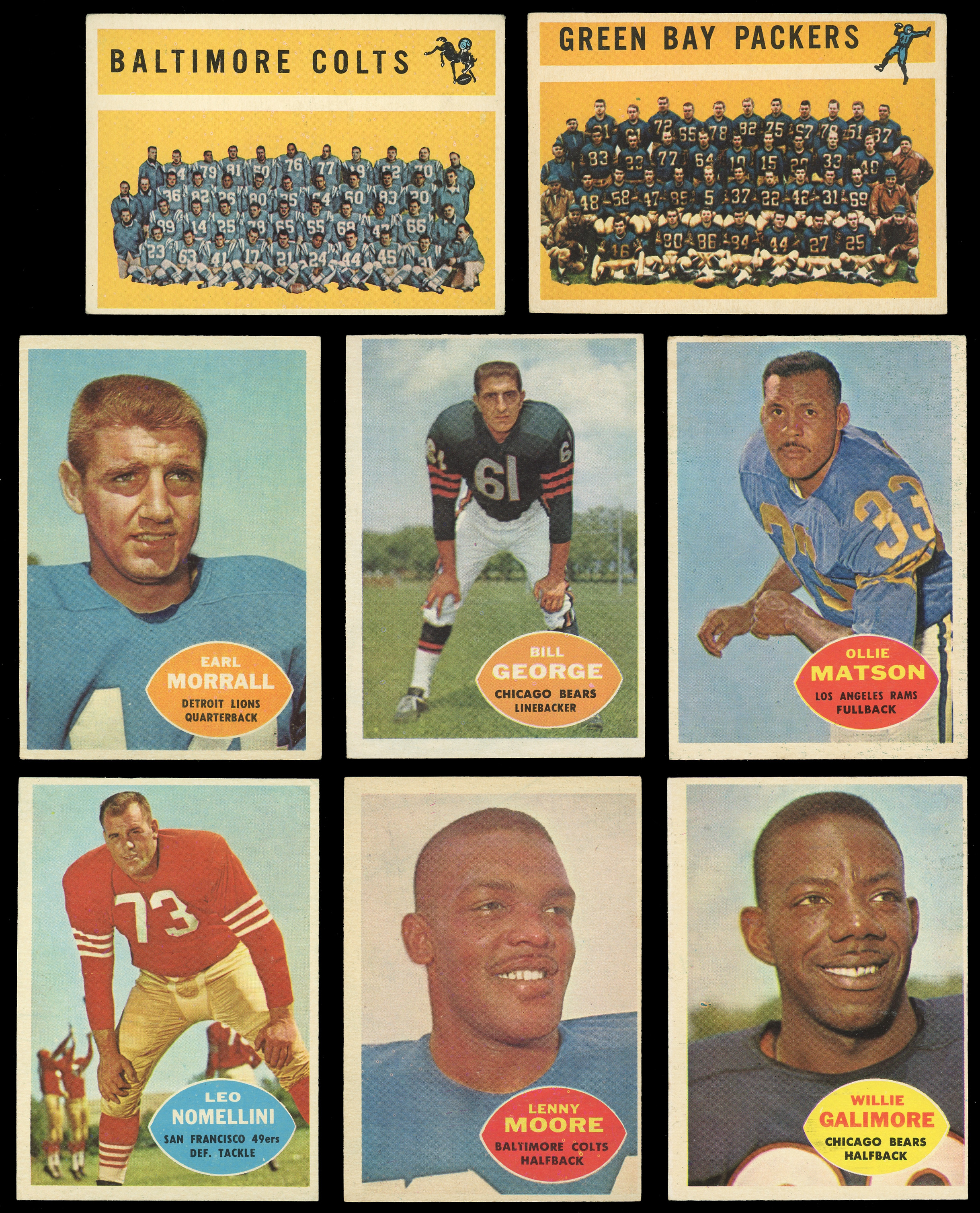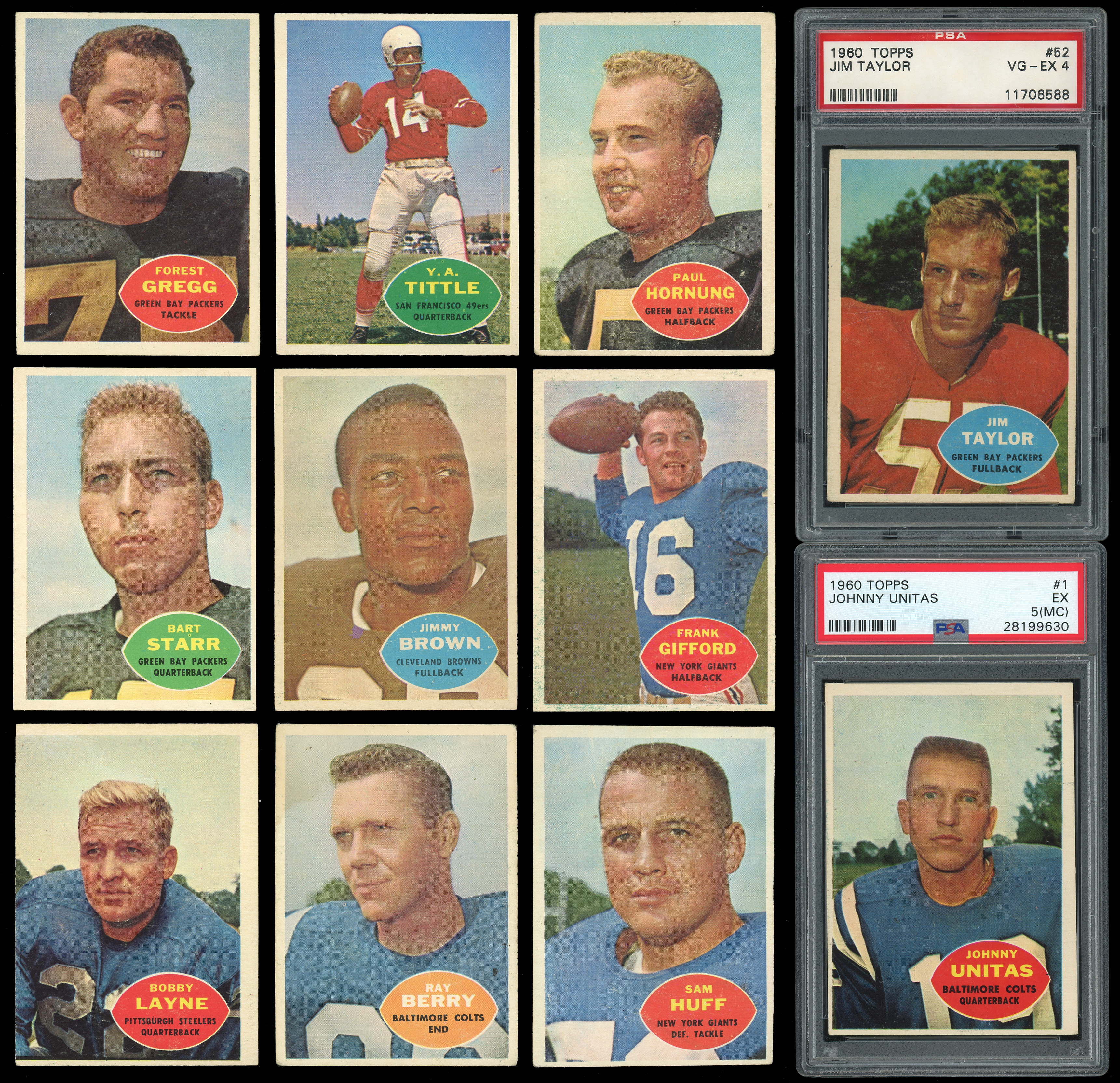 Presented is a 1960 Topps Football complete set of (132) cards with a pair of PSA graded Hall of Famers. This assembly generally presents in the (VG-EX to EX-MT) range with some variance. Highlights include: #1 Unitas (PSA EX, mc), #4 Berry (GD, stain), #23 J. Brown (VG-EX), #51 Starr (VG-EX), #52 J. Taylor (PSA VG-EX 4), #54 Hornung (GD), #56 Gregg RC (VG-EX), #74 Gifford (EX), #80 Huff (GD), #93 Layne (VG) and #113 Tittle (EX-MT). Also present is a Los Angeles Rams metallic sticker (GD).