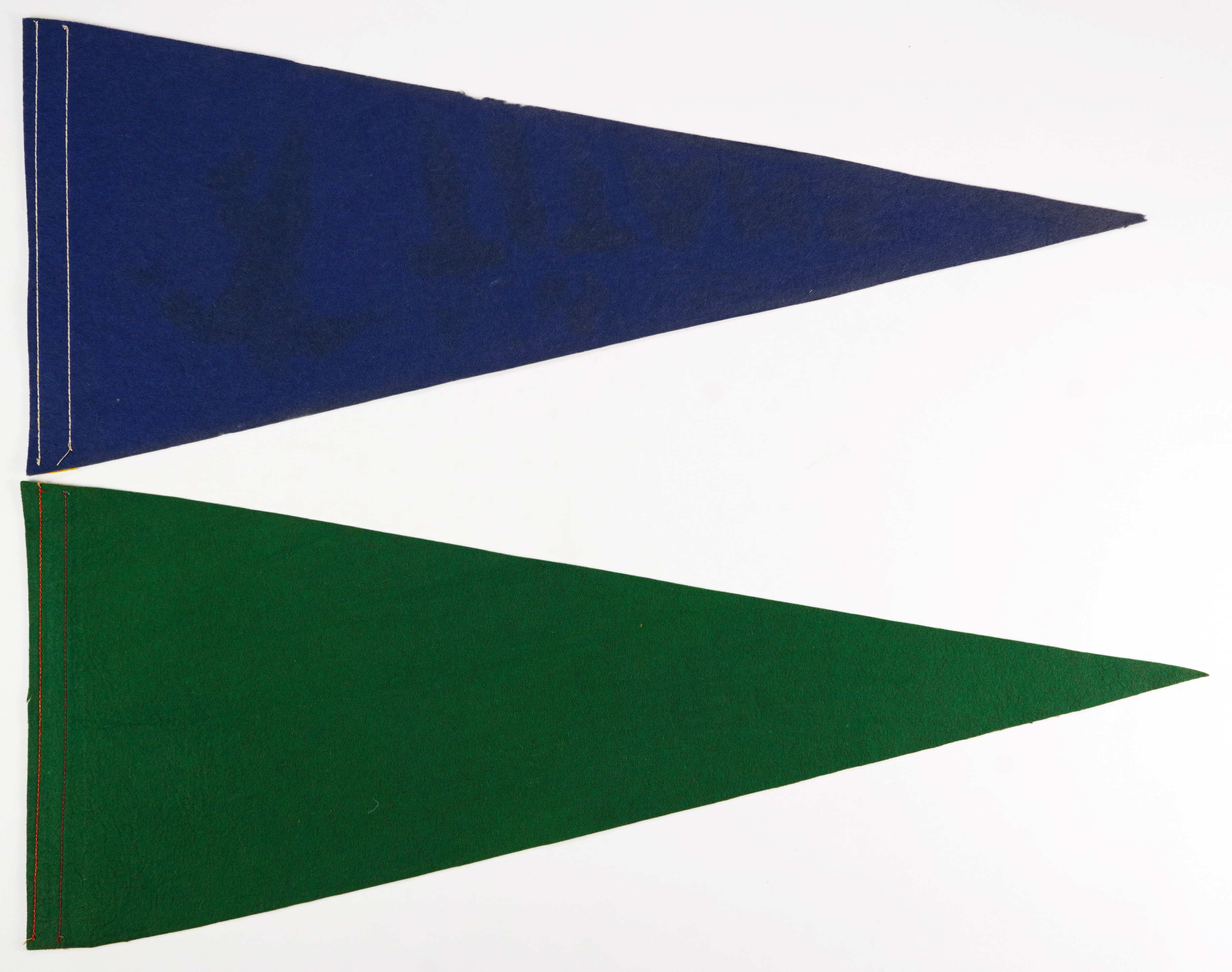 An an Important era for the New York Jets franchise is represented, with this pair of rare, full-size 1960s AFL pennants. A charter member of the AFL, the Jets were founded as the New York Titans in 1960. Joe Namath was selected number one overall in the 1965 AFL Draft, and in his fourth season as the Jets QB, he led them all the way to a famously guaranteed victory over the heavily favored Baltimore Colts in Super Bowl III, on 1/12/69. Styled in the Titans and Jets colors respectively, these vintage pennants take you from one end of the decade, to the other, with: New York Titans first year pennant (GD) with a a player wearing number 16 and team name lettering, in gold graphics on a blue background; and New York Jets pennant (EX+) with Joe Namath and the Statue of Liberty in front on the NYC skyline, and team name lettering, in white graphics on a green background.
