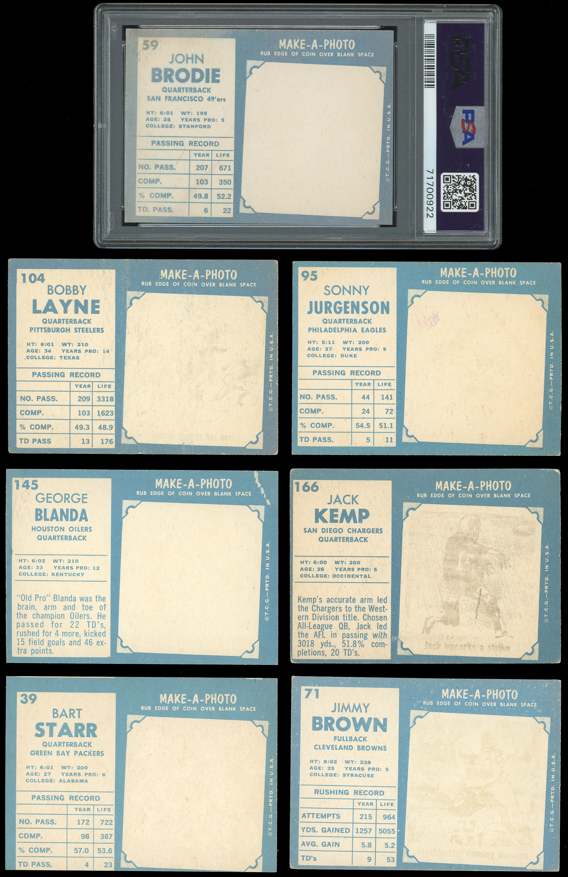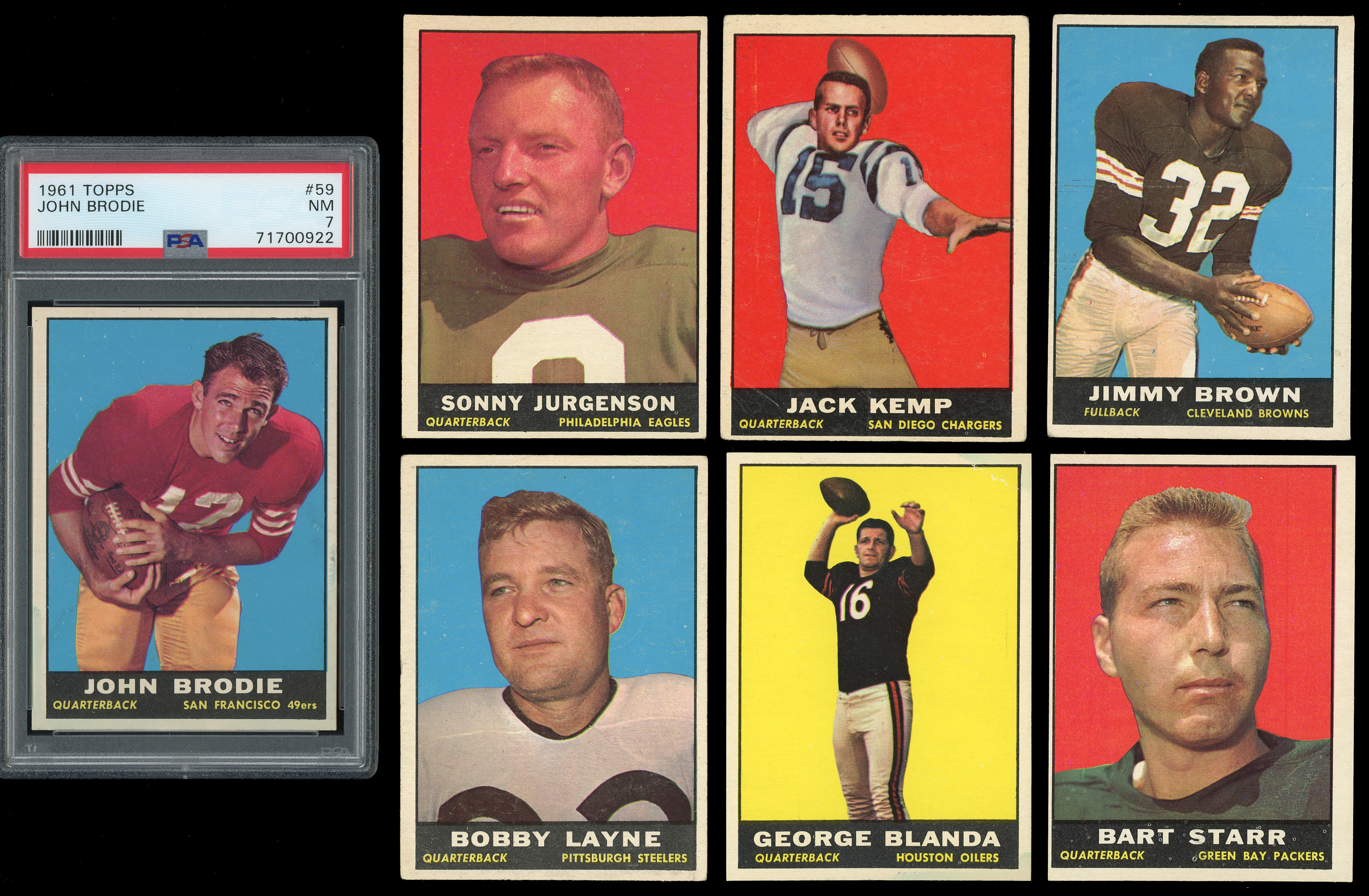 The worlds of the AFL and NFL are merged with the offered 1961 Topps Football near set of (179/198) cards. This mixed grade assembly generally presents in the (VG to EX) range with some much better and others lesser. Highlights include: #39 Starr (VG), #57 Unitas IA (VG), #58 Tittle (PR, tape), #59 Brodie RC (PSA NM 7), #67 CL (marked), #71 J. Brown (GD), #77 J. Brown IA (VG), #95 Jurgensen (VG-EX), #104 Layne (VG), #145 Blanda (GD) and #166 Kemp (GD). Note: Our consignor was an "OBC" collector (a hobby organization that emphasizes completion rather than condition), as such, multiple cards in this collection may be extremely low-grade.