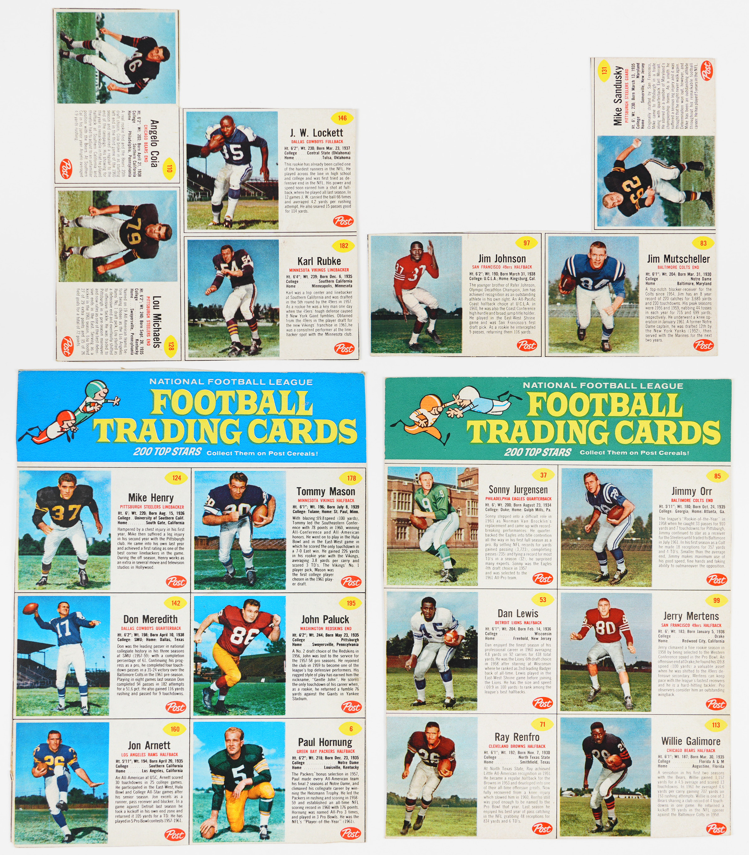 A total of (19) National Football League players star on the offered quartet of 1962 Post Cereal Football uncut panels. These uncirculated gridiron treasures are crease-free and include the following players: (2) Six-Card Panels: (12 cards) with #6 Hornung, #37 Jurgensen, 53, 71, 85, 99, 113, 124, #142 Meredith, 160, 178, 195; Four-Card Panel: #110 Coia SP, 128, 146, 182; Three-Card Panel: #83, #97 Ji. Johnson SP and 131.