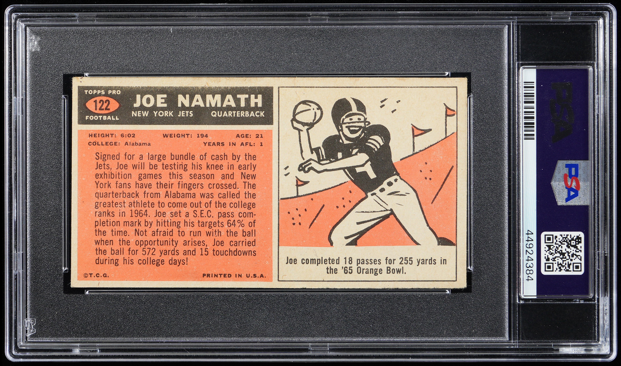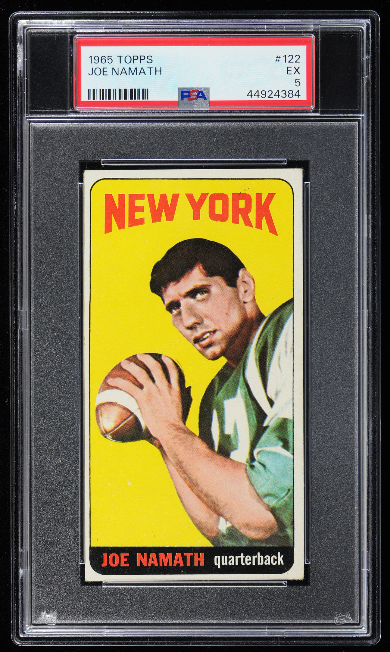 Graded EX 5 by PSA. The braggadocious "Broadway Joe" Namath is pictured on the offered 1965 Topps Football #122 rookie shortprint. This iconic "tall boy" of the New York Jets Hall of Fame quarterback displays evenly worn corners, bright white edges and blazing surface colors. The burnt orange reverse which details Namath's SEC career is problem-free.
