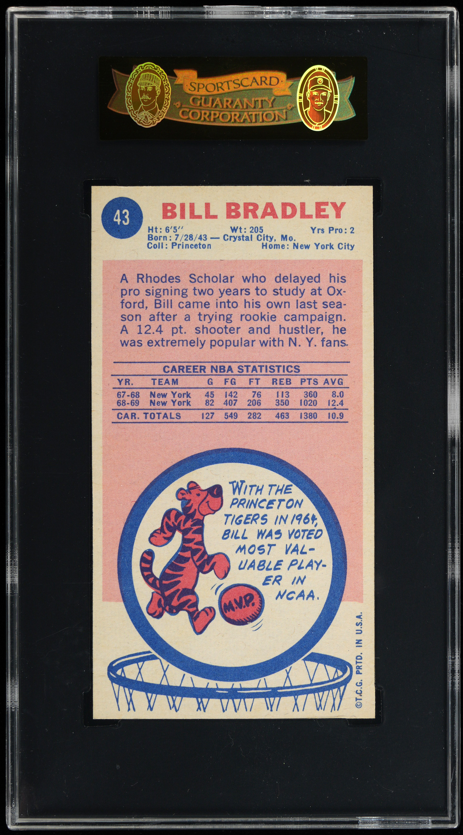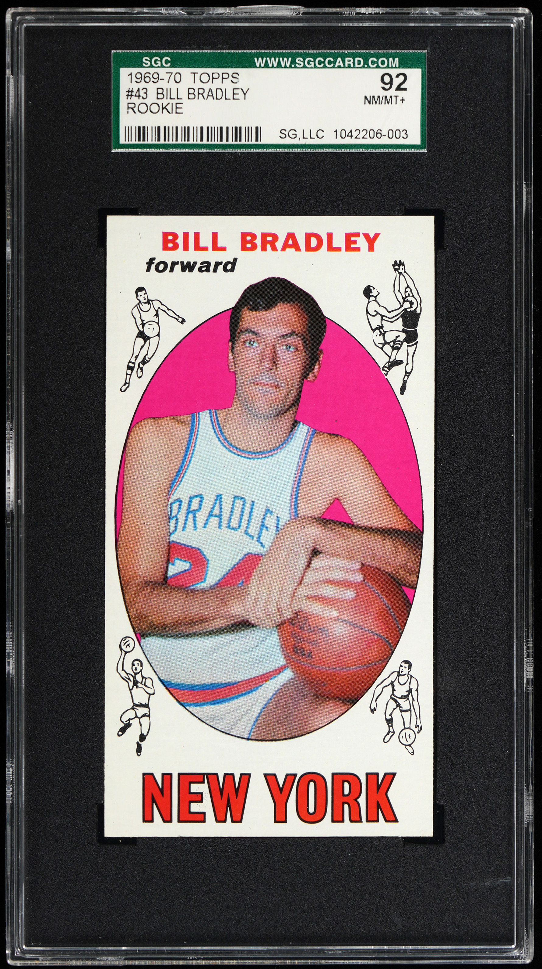 Graded NM/MT+ 8.5 by SGC. United States Senator. Ivy League scholar. Pro Basketball Hall of Famer. New York Knicks star Bill Bradley was a true renaissance man and standout on the offered 1969-1970 Topps Basketball #43 rookie card. This blazer ranks in the upper 3% of all similar copies judged by the authenticator.